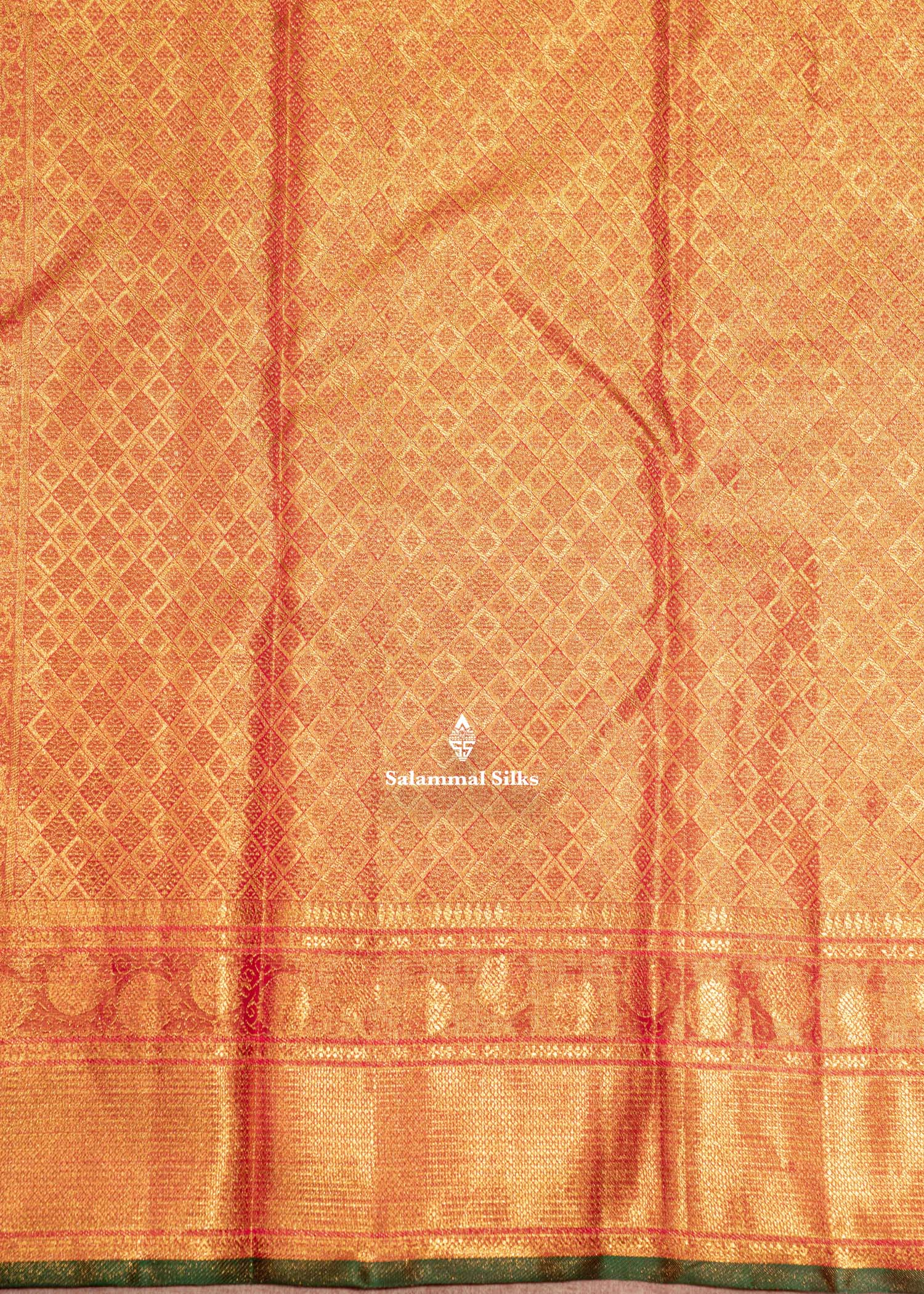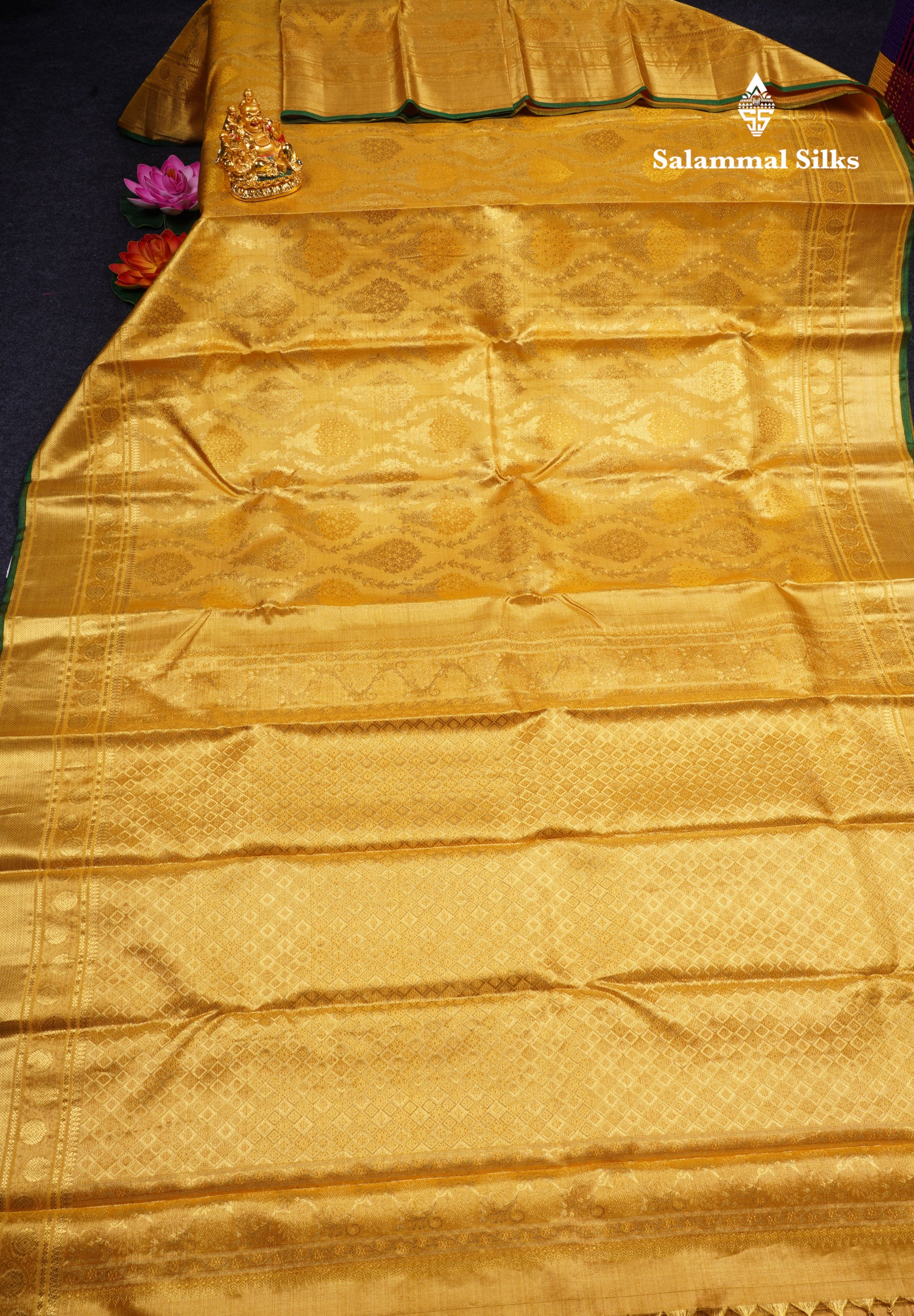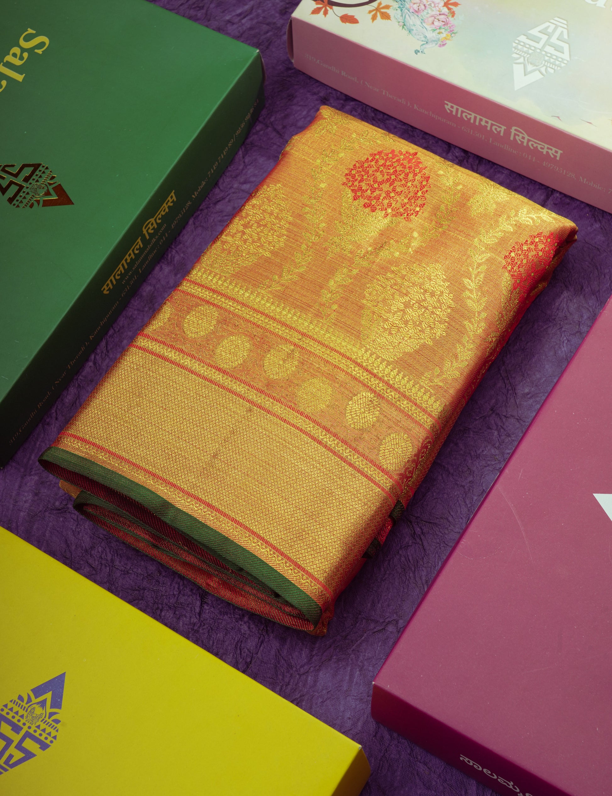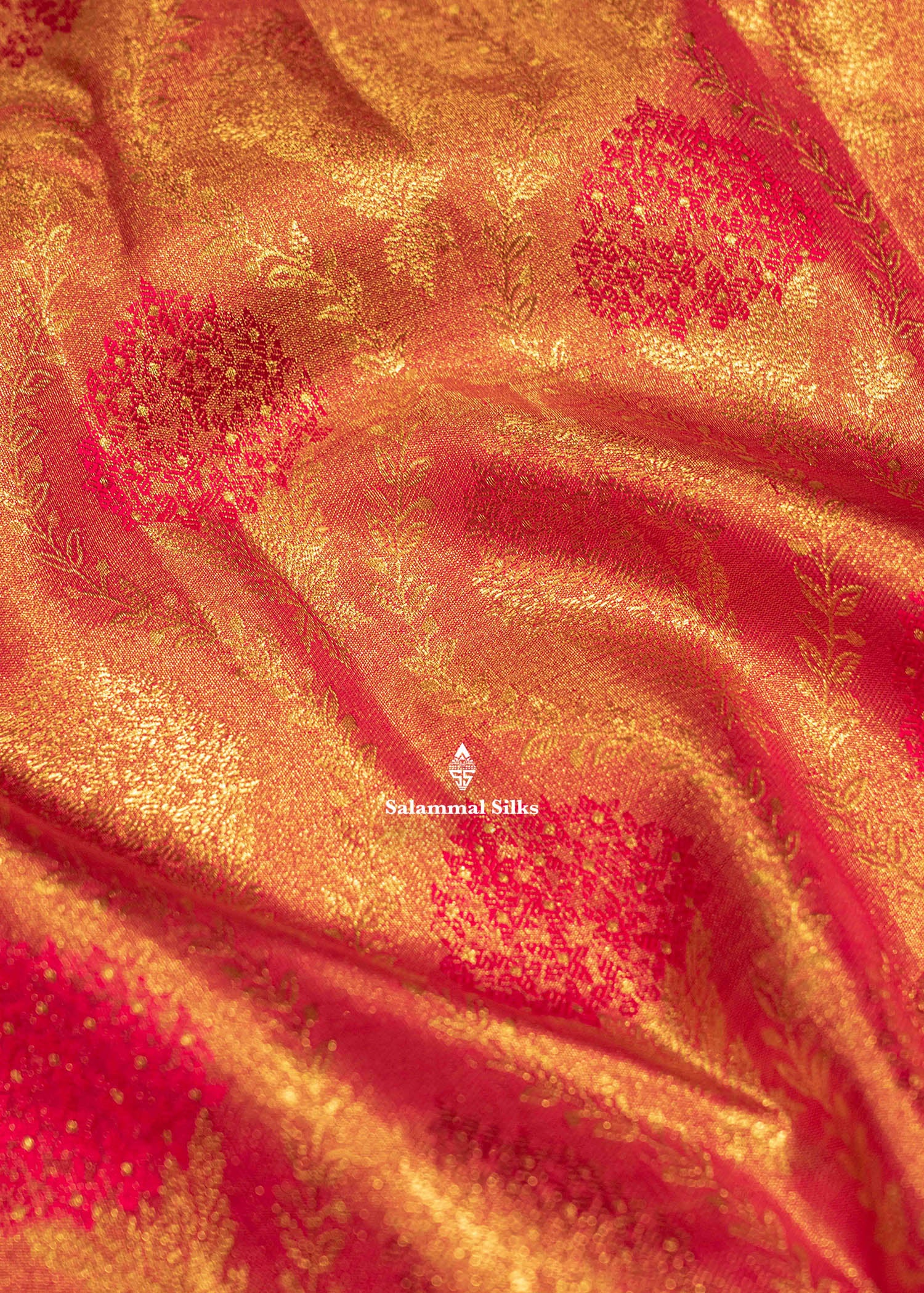 Salammal is known for its handloom sarees. In some sarees, there is cross-weaving between the body and the pallu, which is a sign of pure handloom sarees. This can be seen in Kanchipuram embossed sarees.