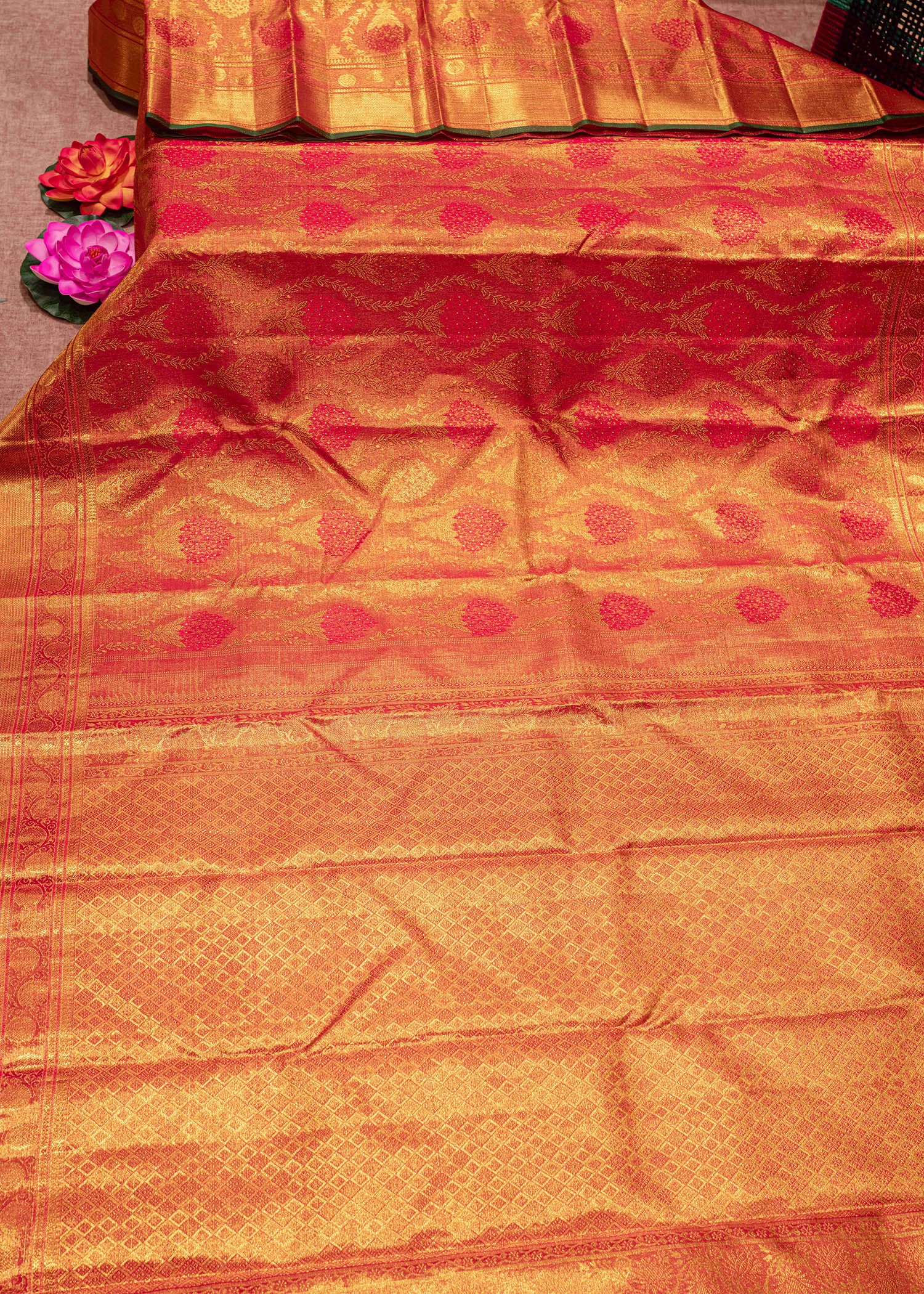 Kanjivaram Tomato Red Colour 2G Zari Pure Silk Saree With Gold Zari Border