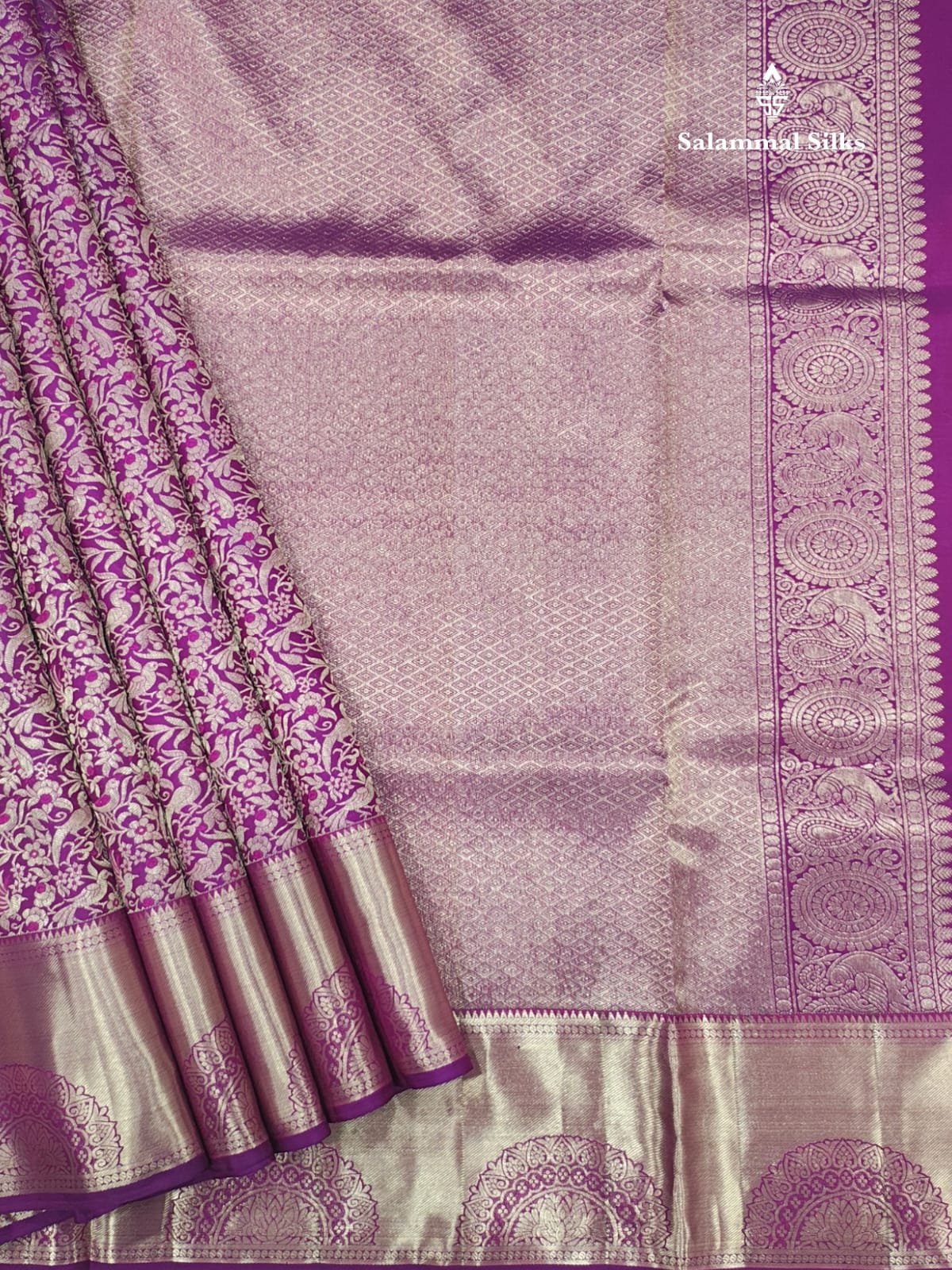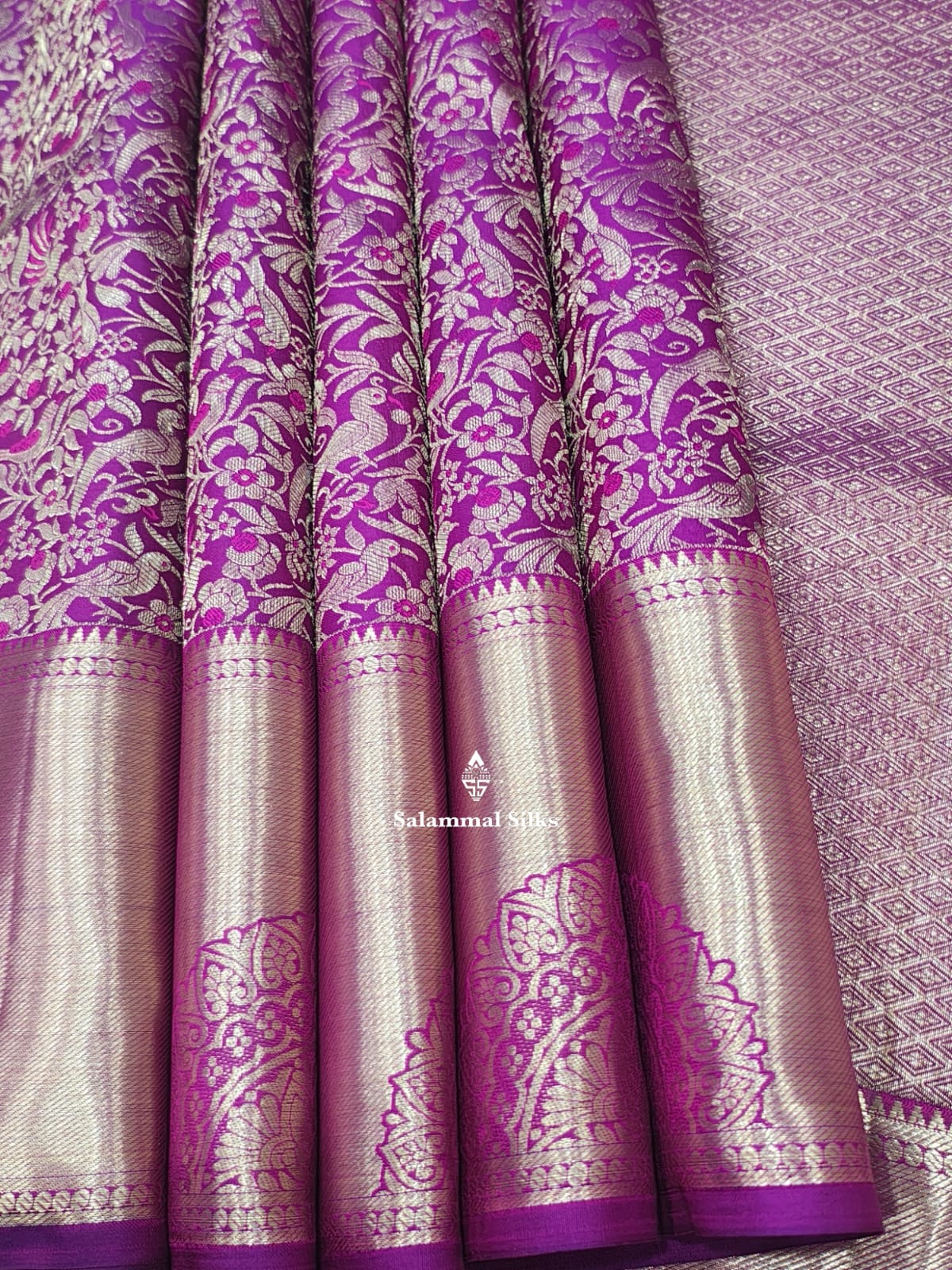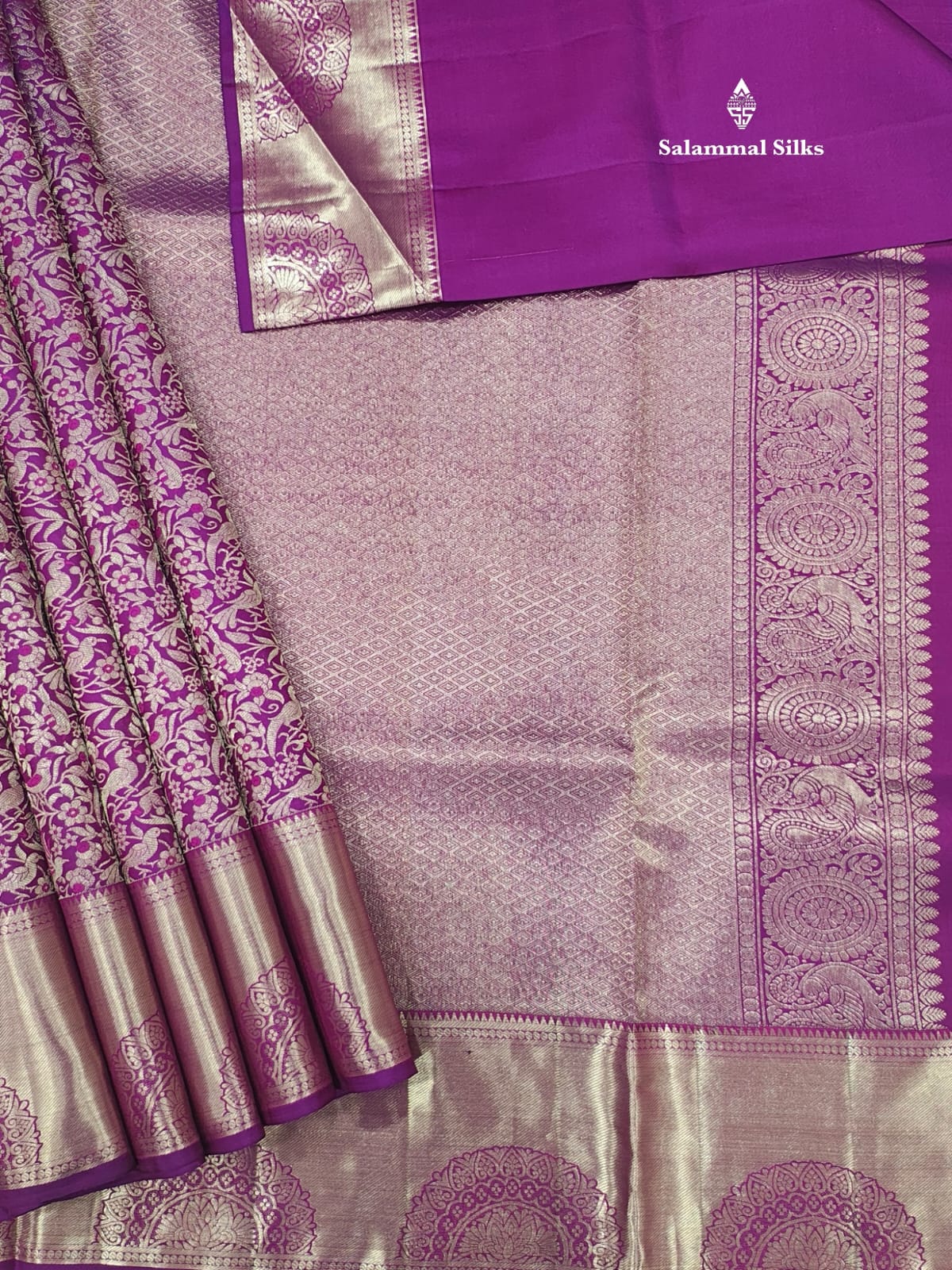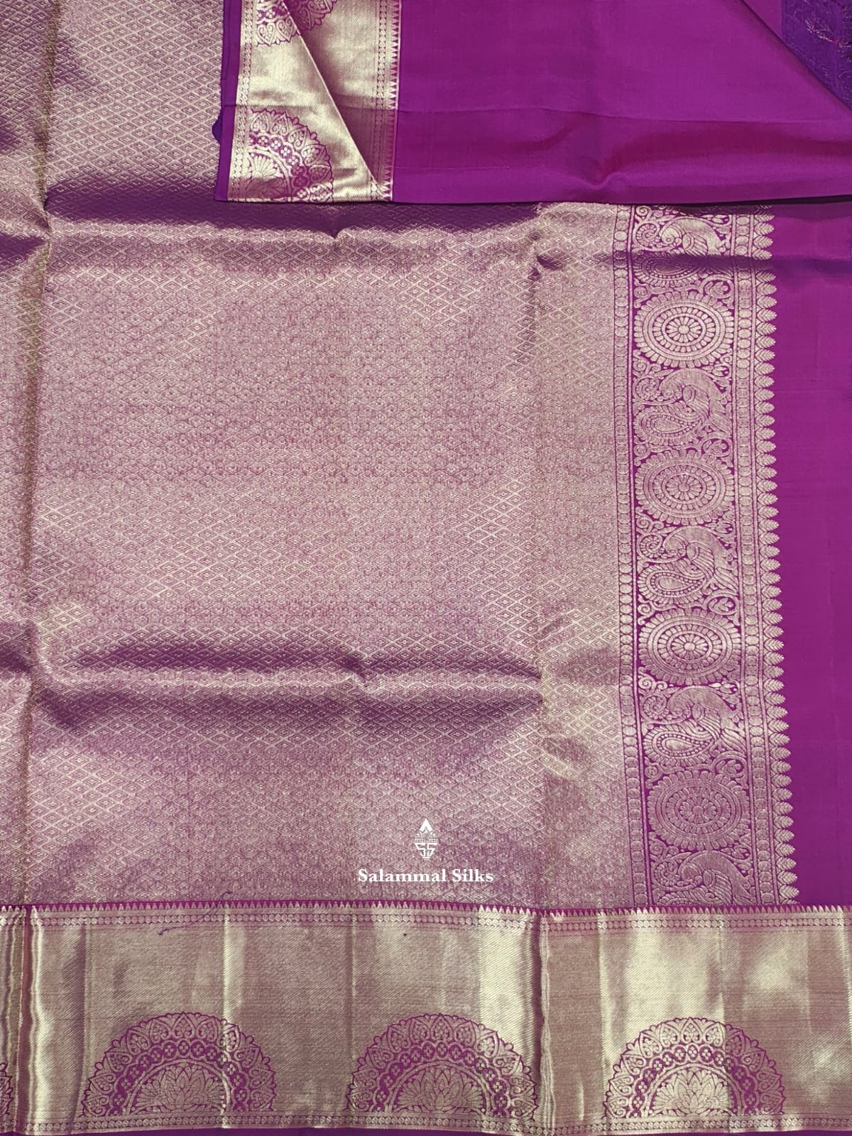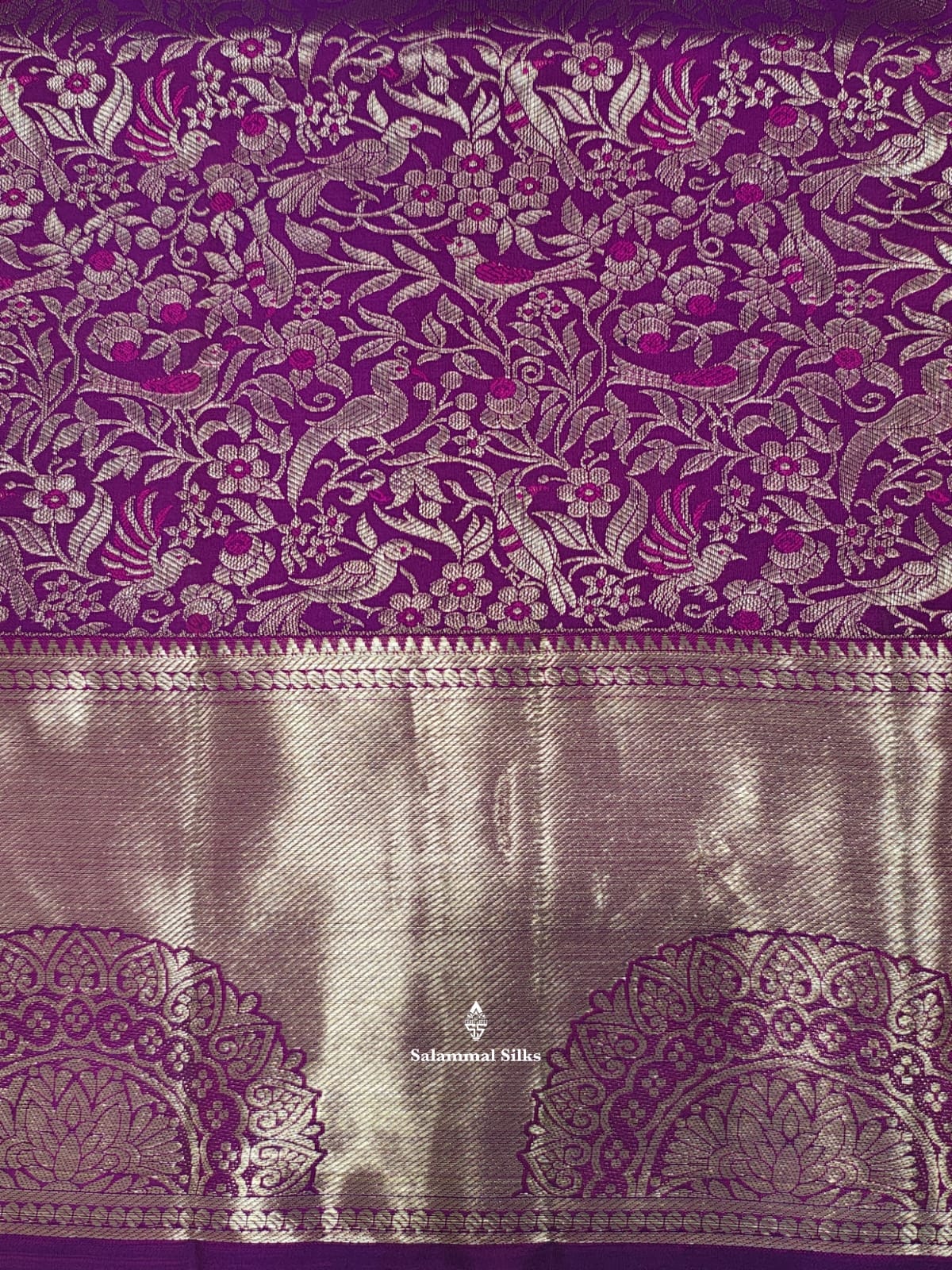 Salammal is known for its handloom sarees. In some sarees, there is cross-weaving between the body and the pallu, which is a sign of pure handloom sarees. This can be seen in Kanchipuram embossed sarees.