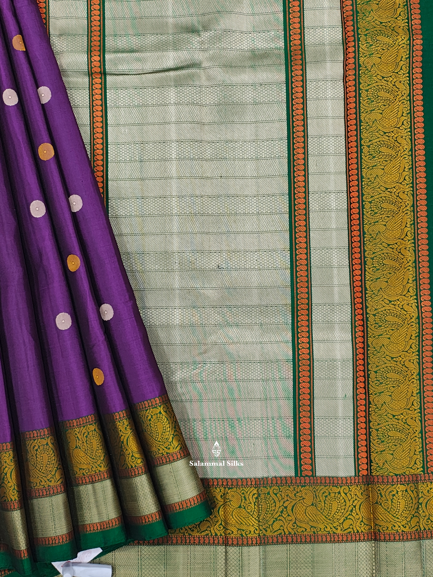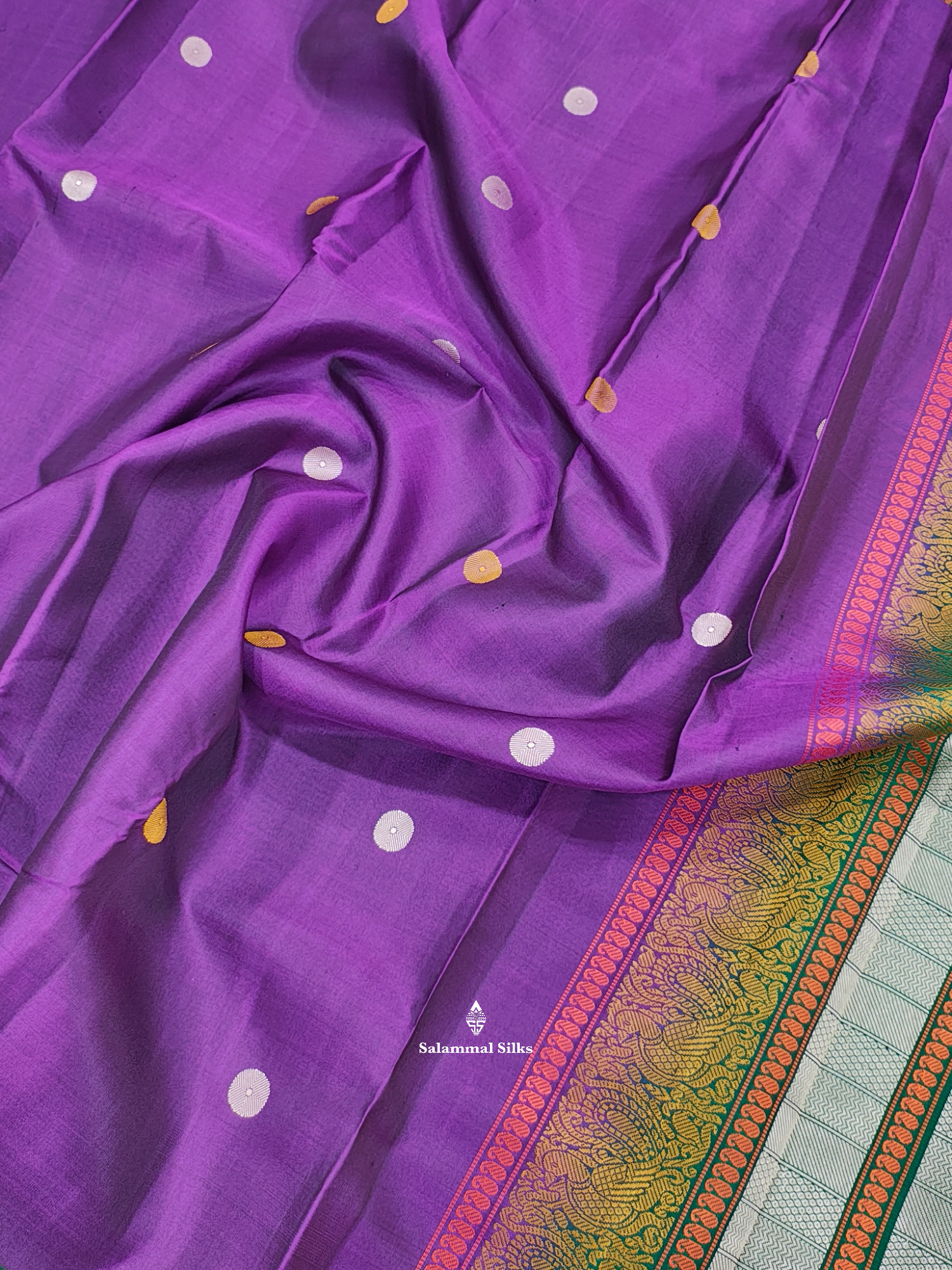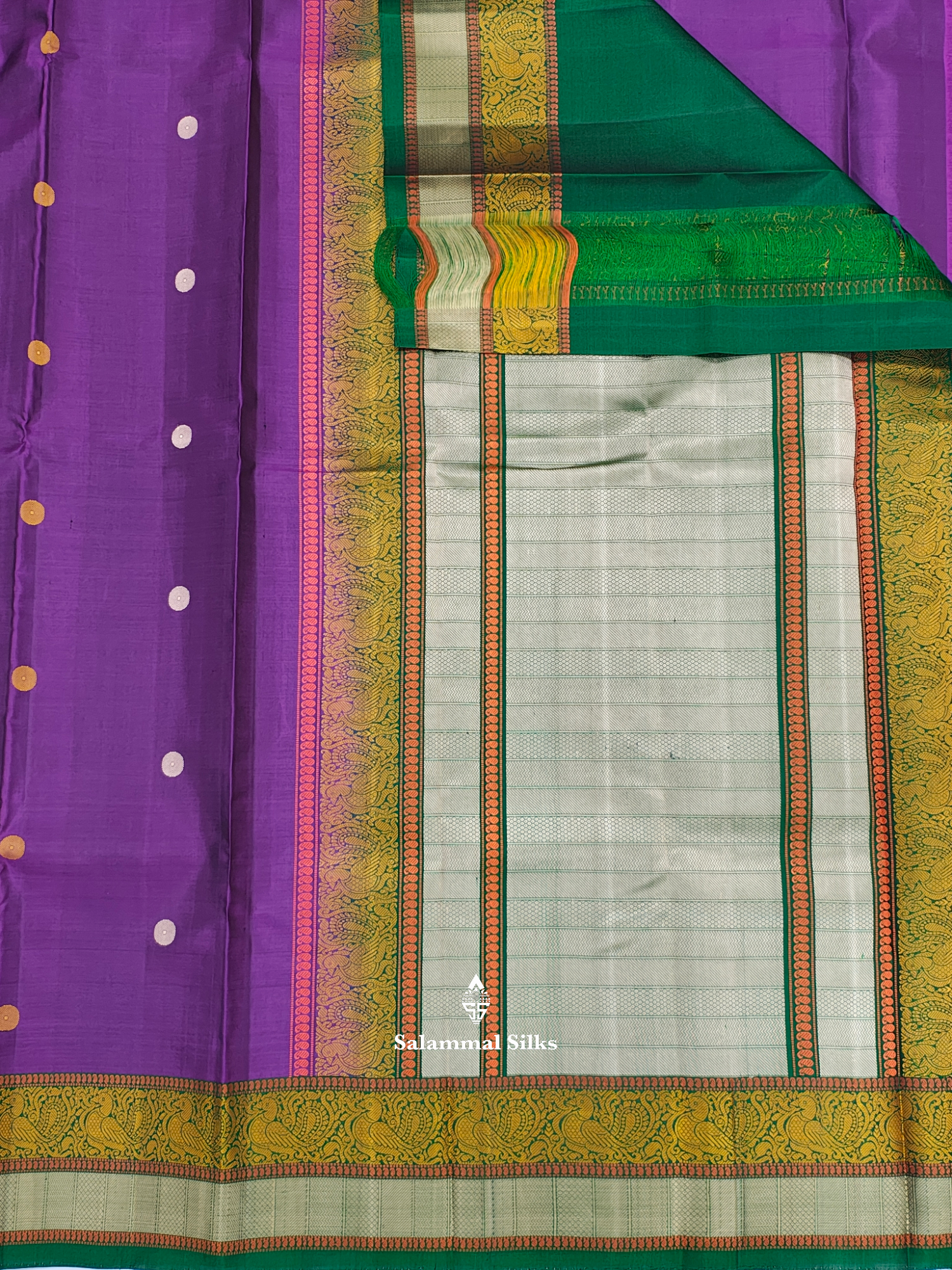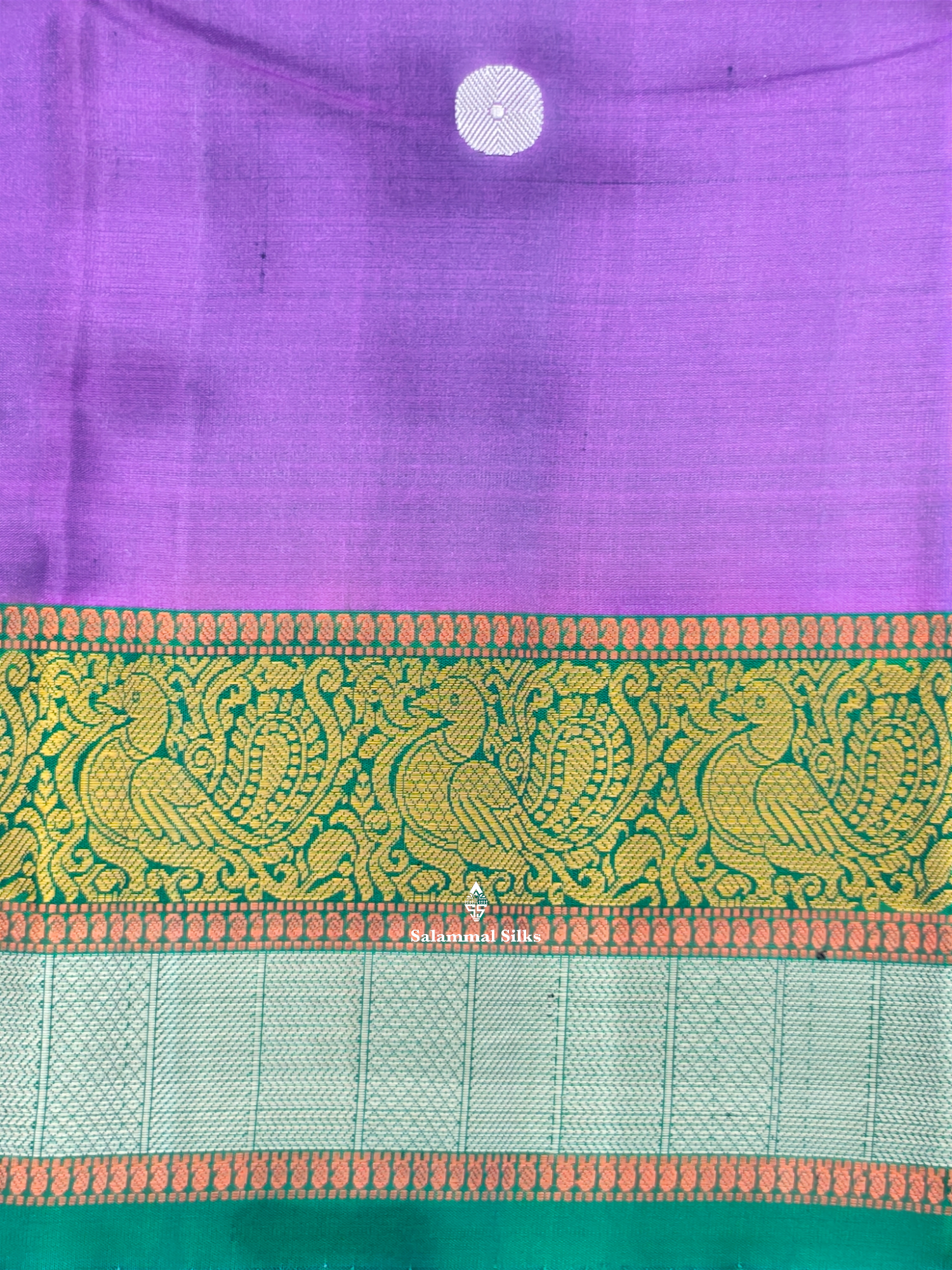 Salammal is known for its handloom sarees. In some sarees, there is cross-weaving between the body and the pallu, which is a sign of pure handloom sarees. This can be seen in Kanchipuram embossed sarees.