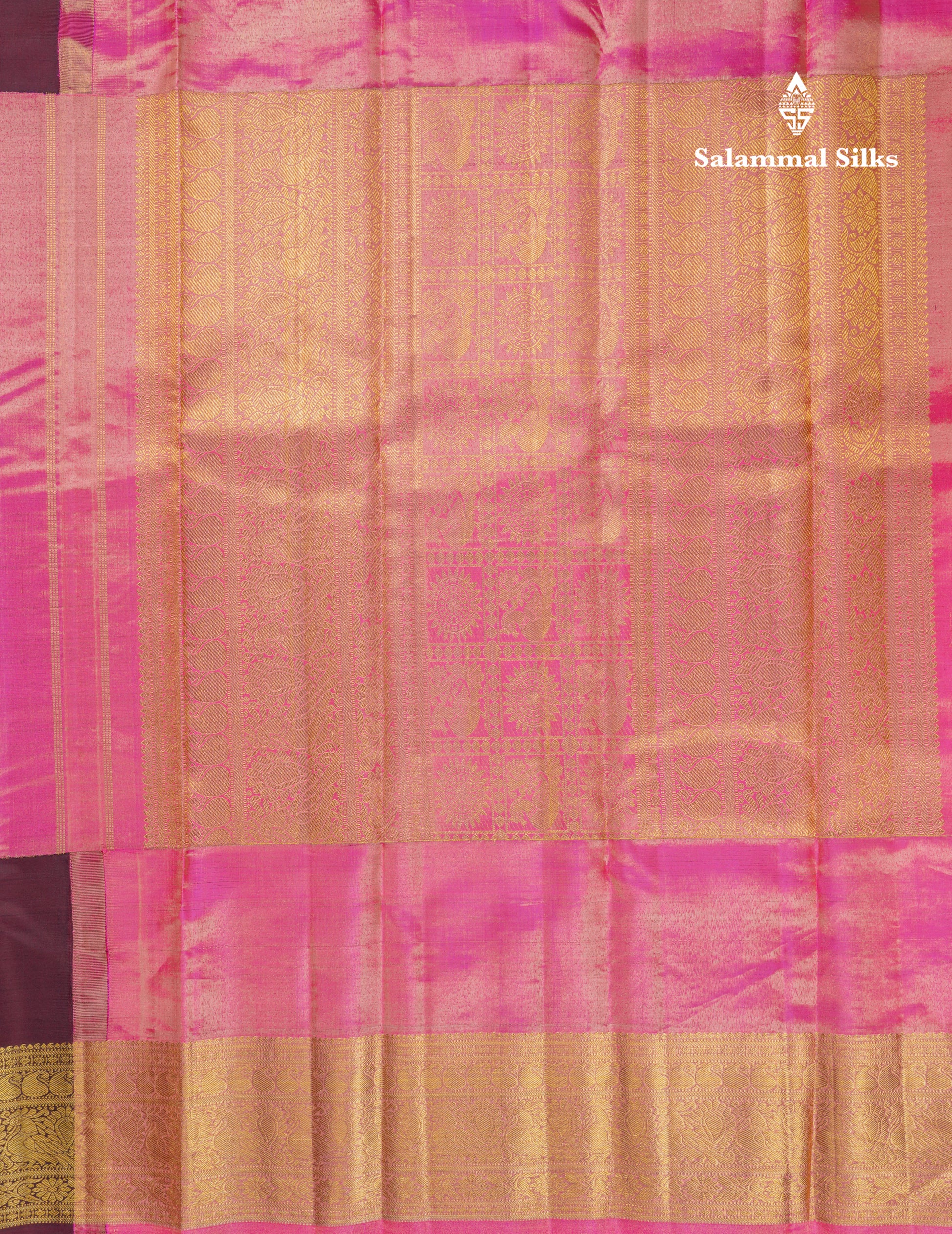 Salammal is known for its handloom sarees. In some sarees, there is cross-weaving between the body and the pallu, which is a sign of pure handloom sarees. This can be seen in Kanchipuram embossed sarees.
