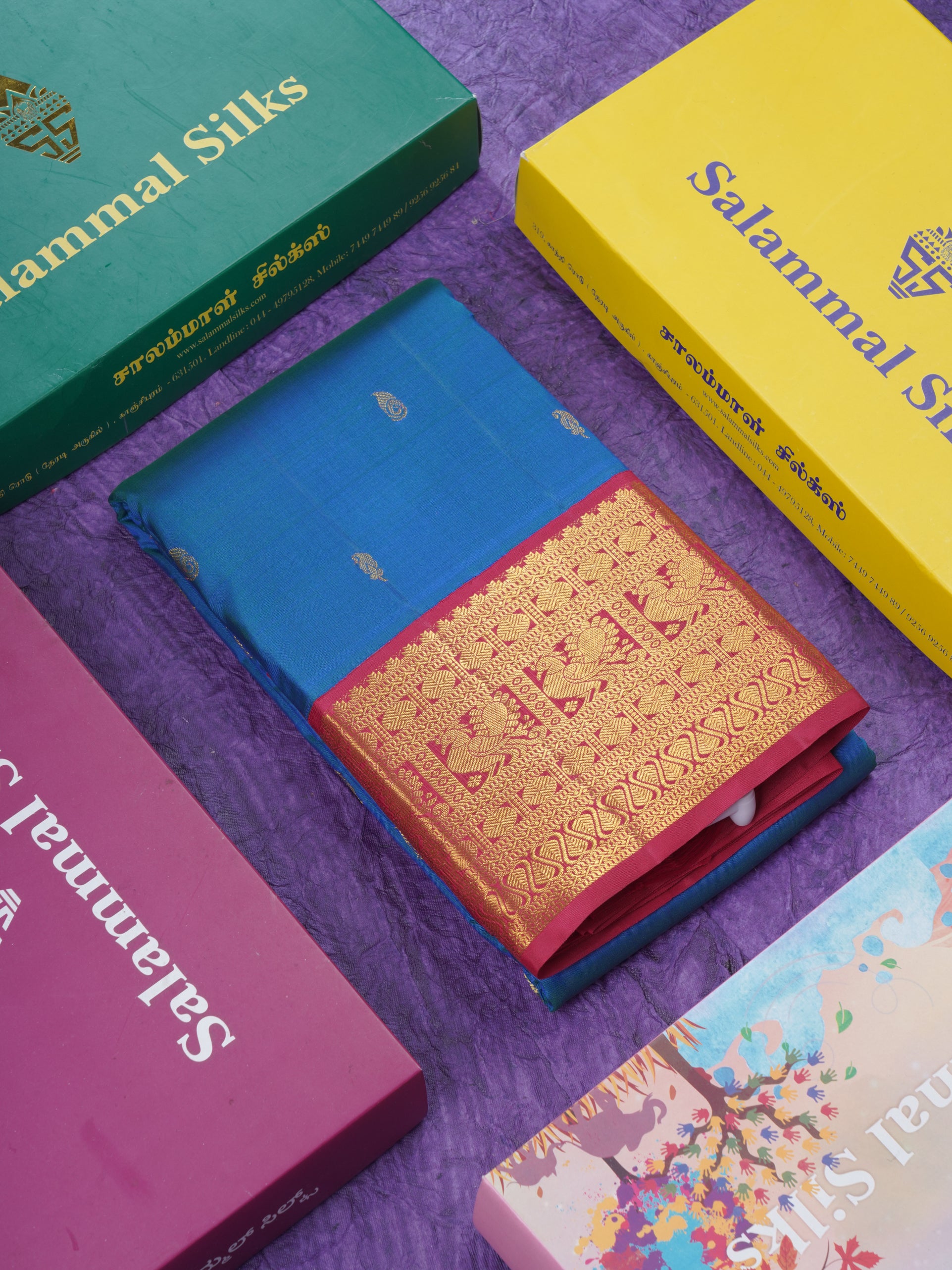 Salammal is known for its handloom sarees. In some sarees, there is cross-weaving between the body and the pallu, which is a sign of pure handloom sarees. This can be seen in Kanchipuram embossed sarees.