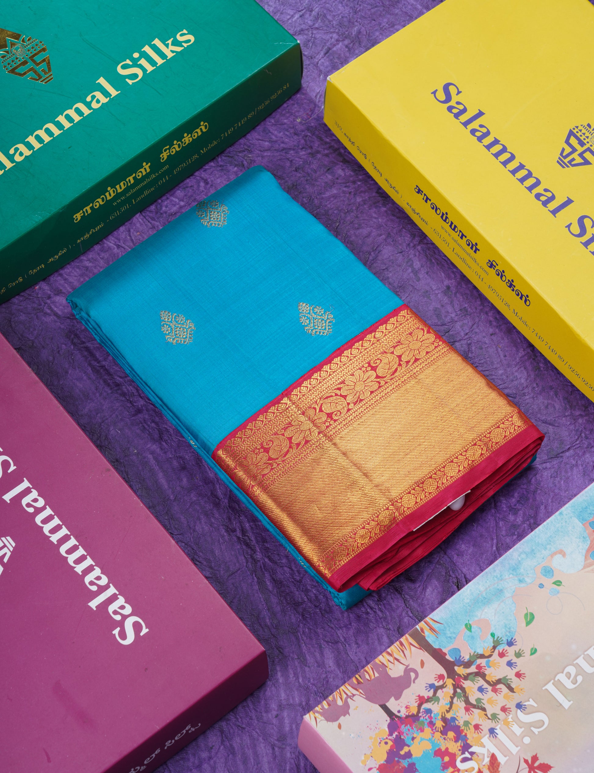 Salammal is known for its handloom sarees. In some sarees, there is cross-weaving between the body and the pallu, which is a sign of pure handloom sarees. This can be seen in Kanchipuram embossed sarees.