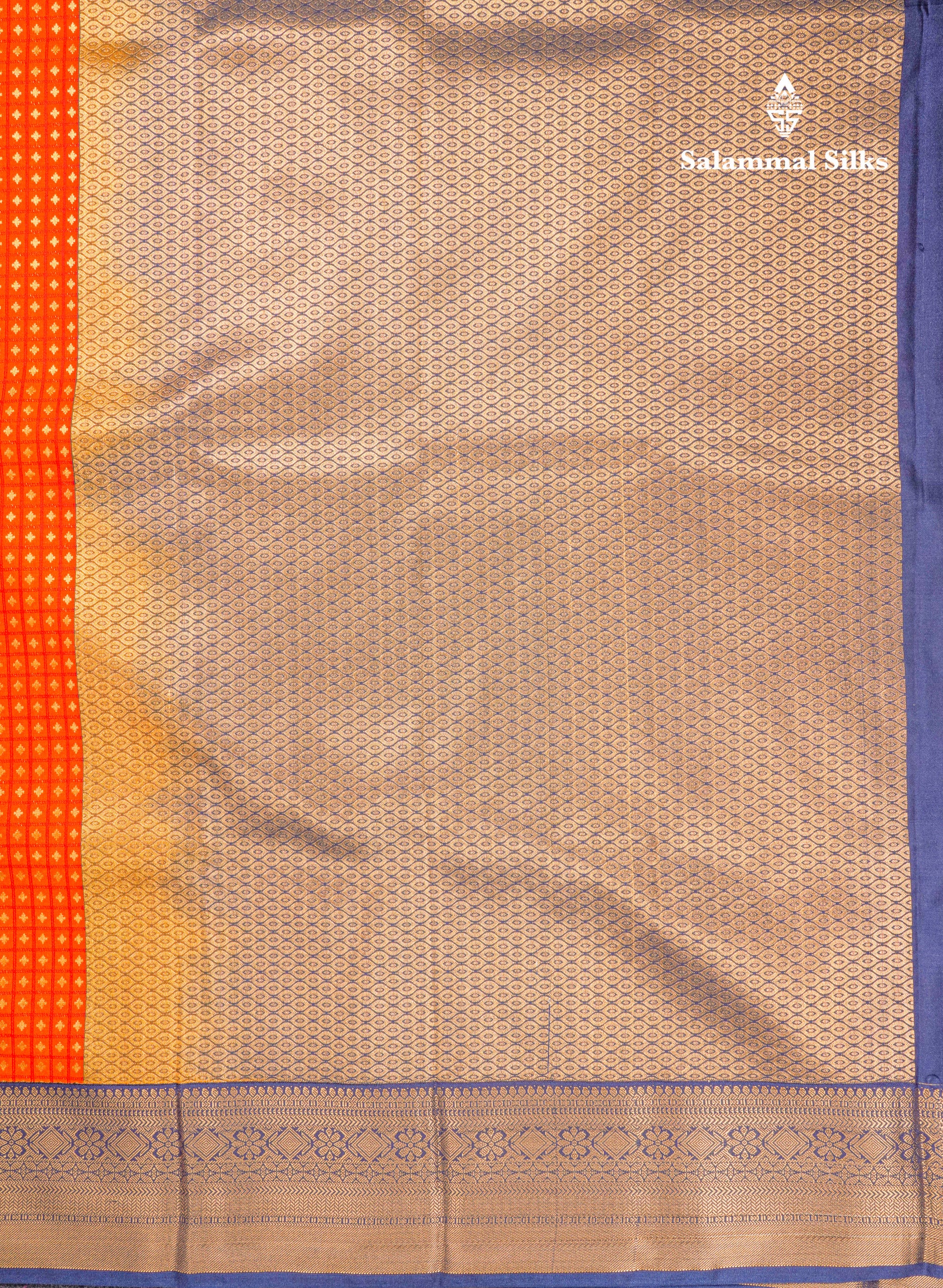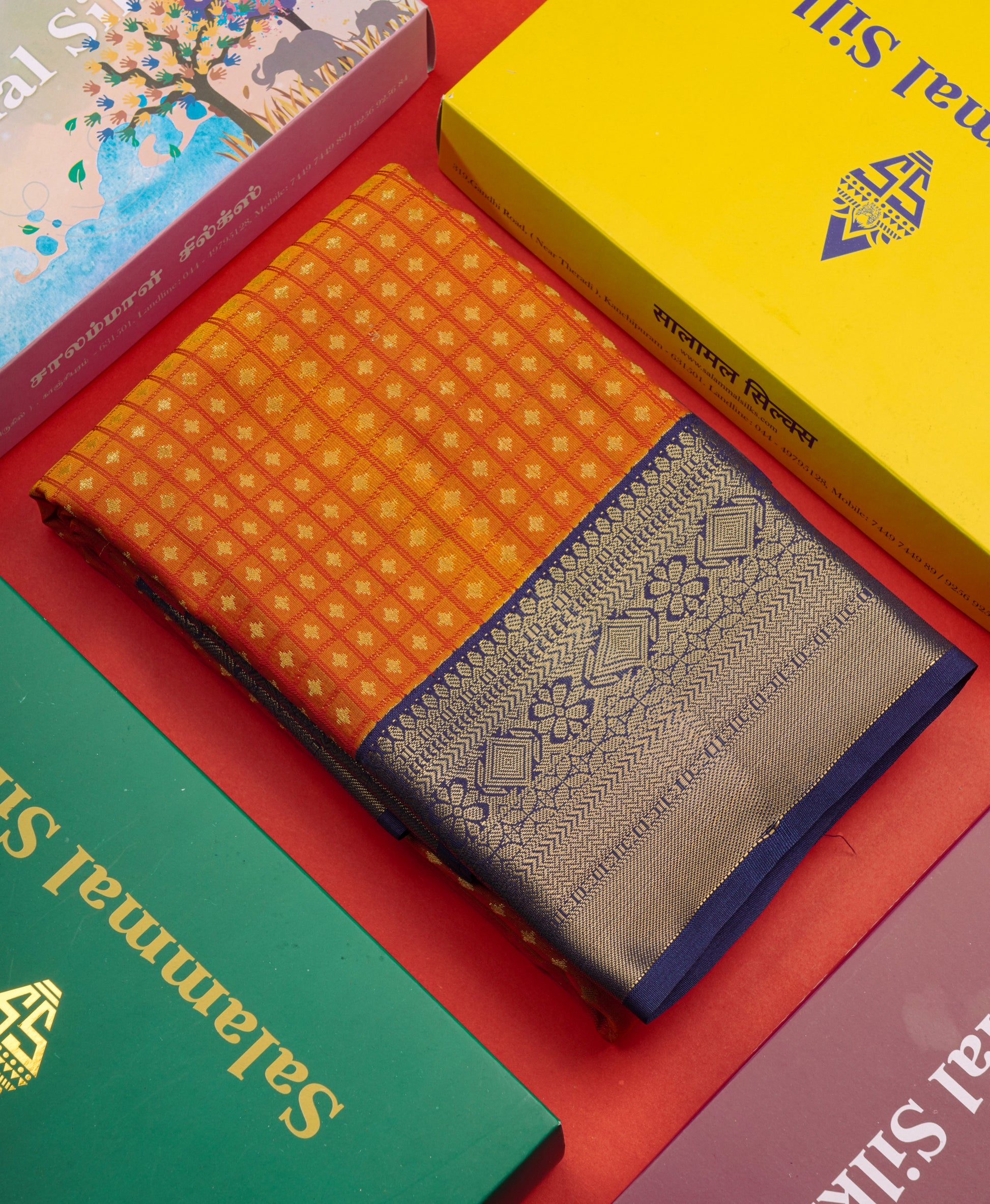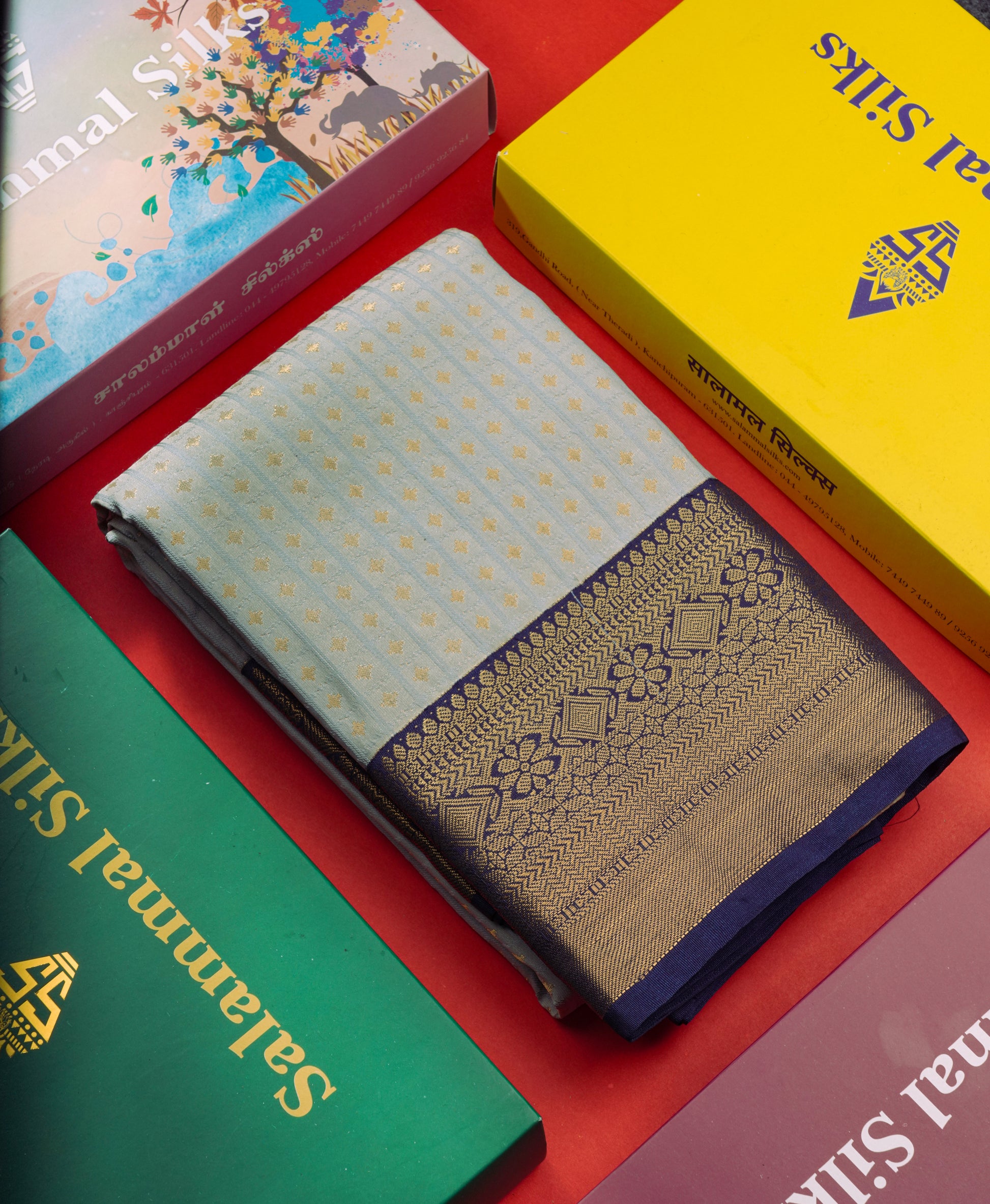 Salammal is known for its handloom sarees. In some sarees, there is cross-weaving between the body and the pallu, which is a sign of pure handloom sarees. This can be seen in Kanchipuram embossed sarees.