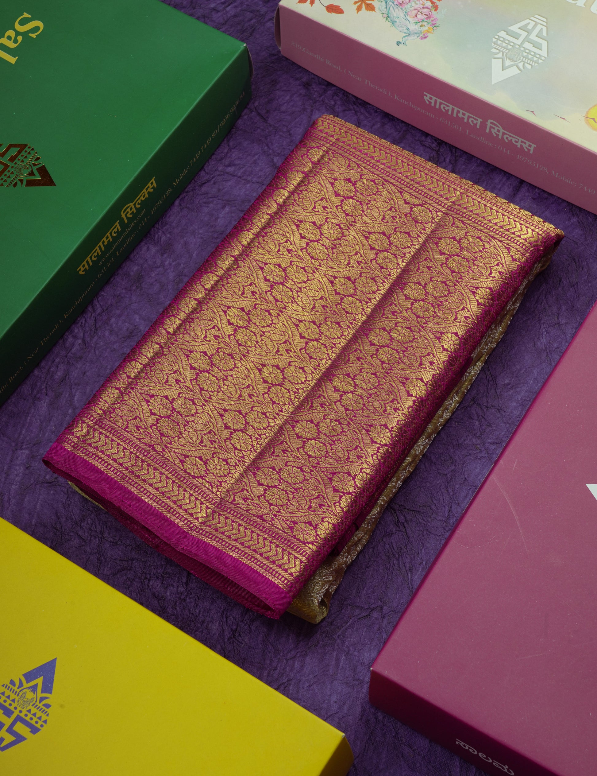 Salammal is known for its handloom sarees. In some sarees, there is cross-weaving between the body and the pallu, which is a sign of pure handloom sarees. This can be seen in Kanchipuram embossed sarees.