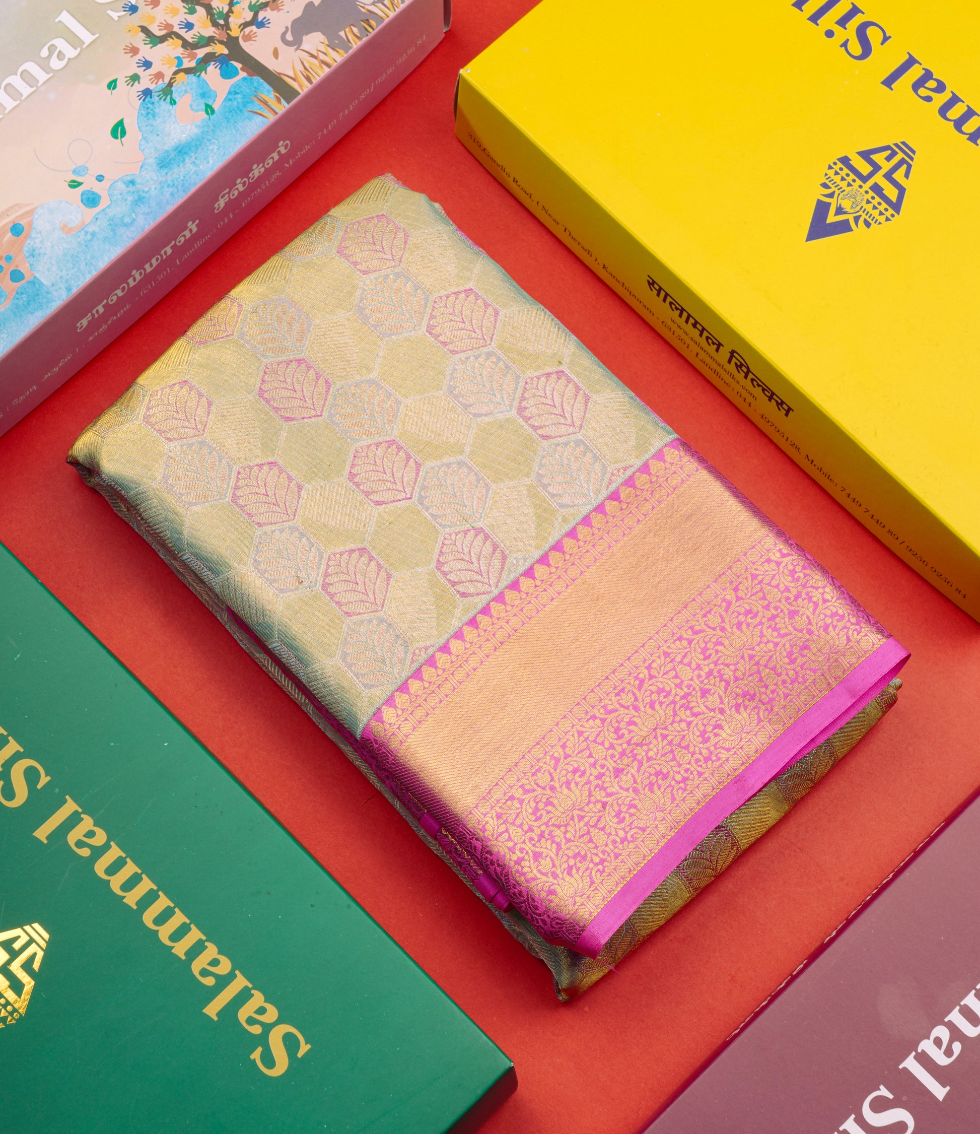 Light Green Colour Pure Kanjivaram Tissue Silk Saree with Pink Border