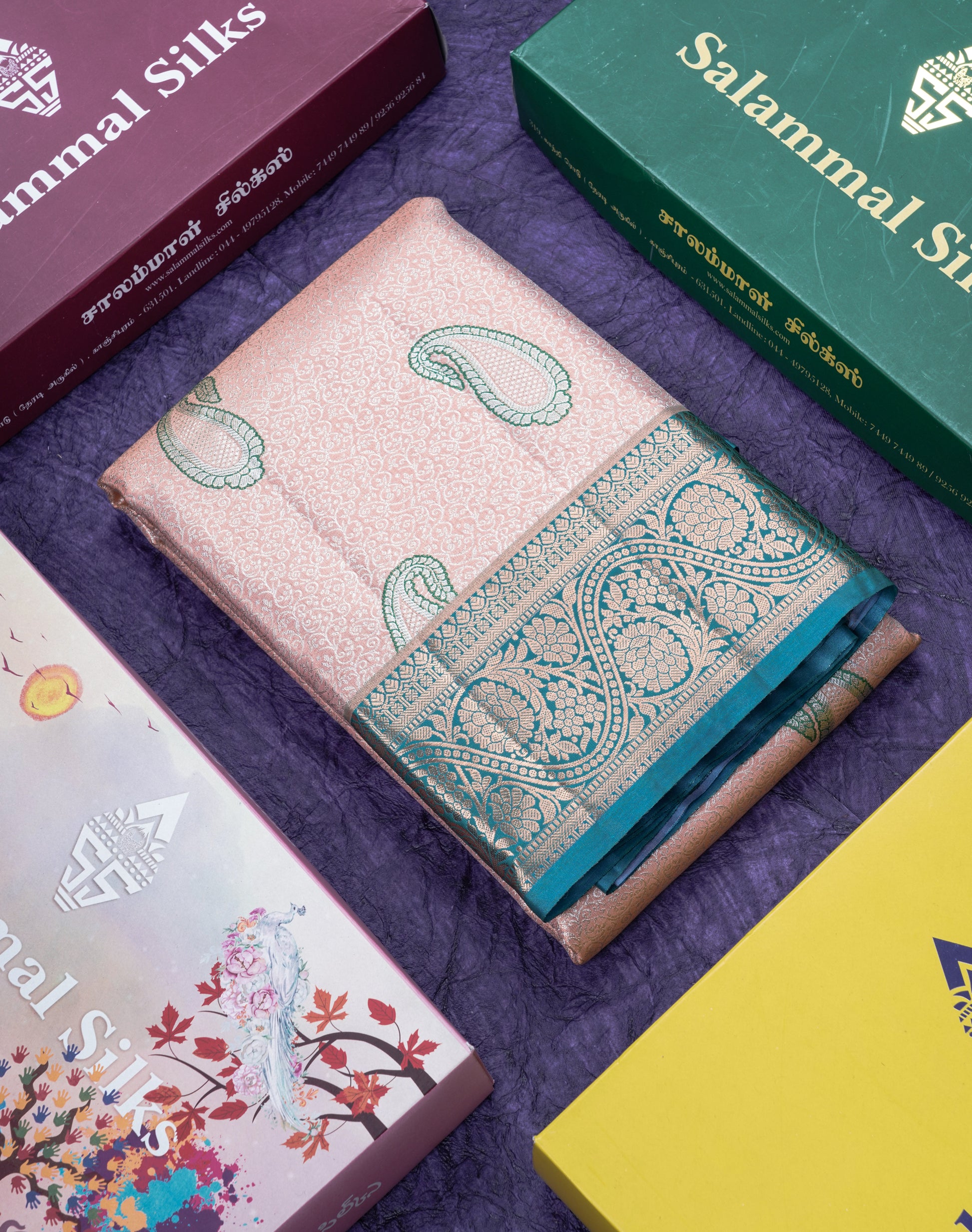 Salammal is known for its handloom sarees. In some sarees, there is cross-weaving between the body and the pallu, which is a sign of pure handloom sarees. This can be seen in Kanchipuram embossed sarees.