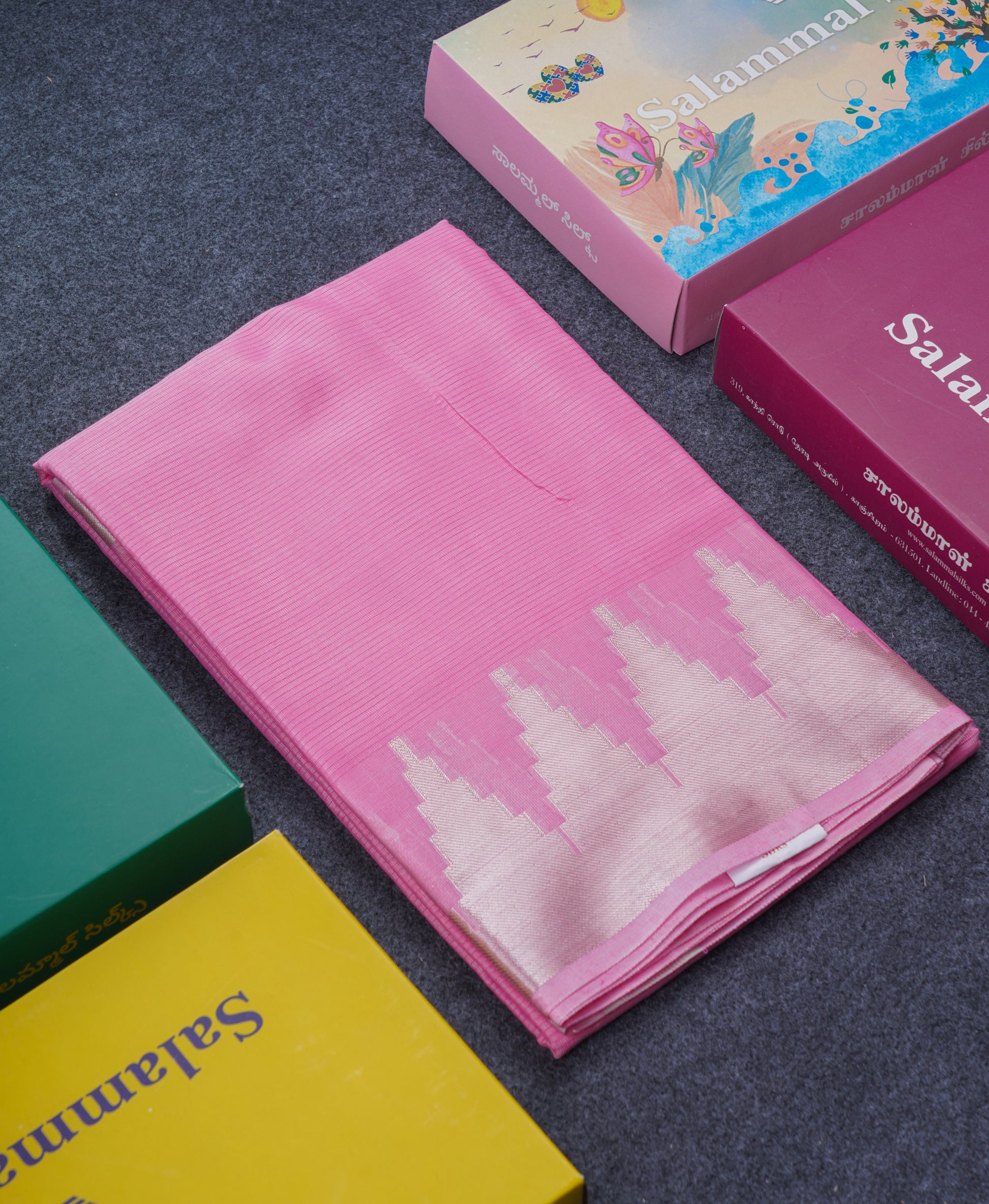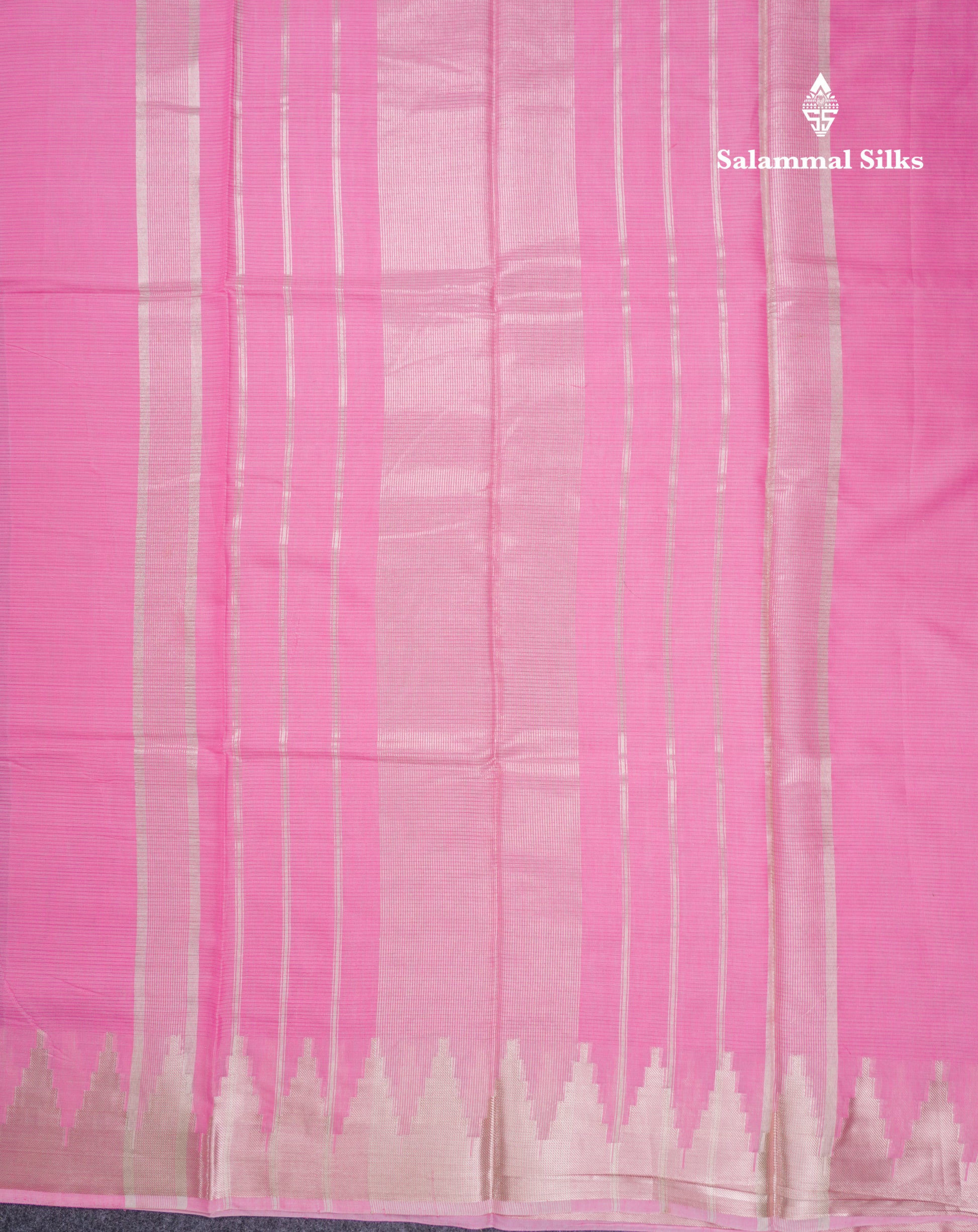 Salammal is known for its handloom sarees. In some sarees, there is cross-weaving between the body and the pallu, which is a sign of pure handloom sarees. This can be seen in Kanchipuram embossed sarees.