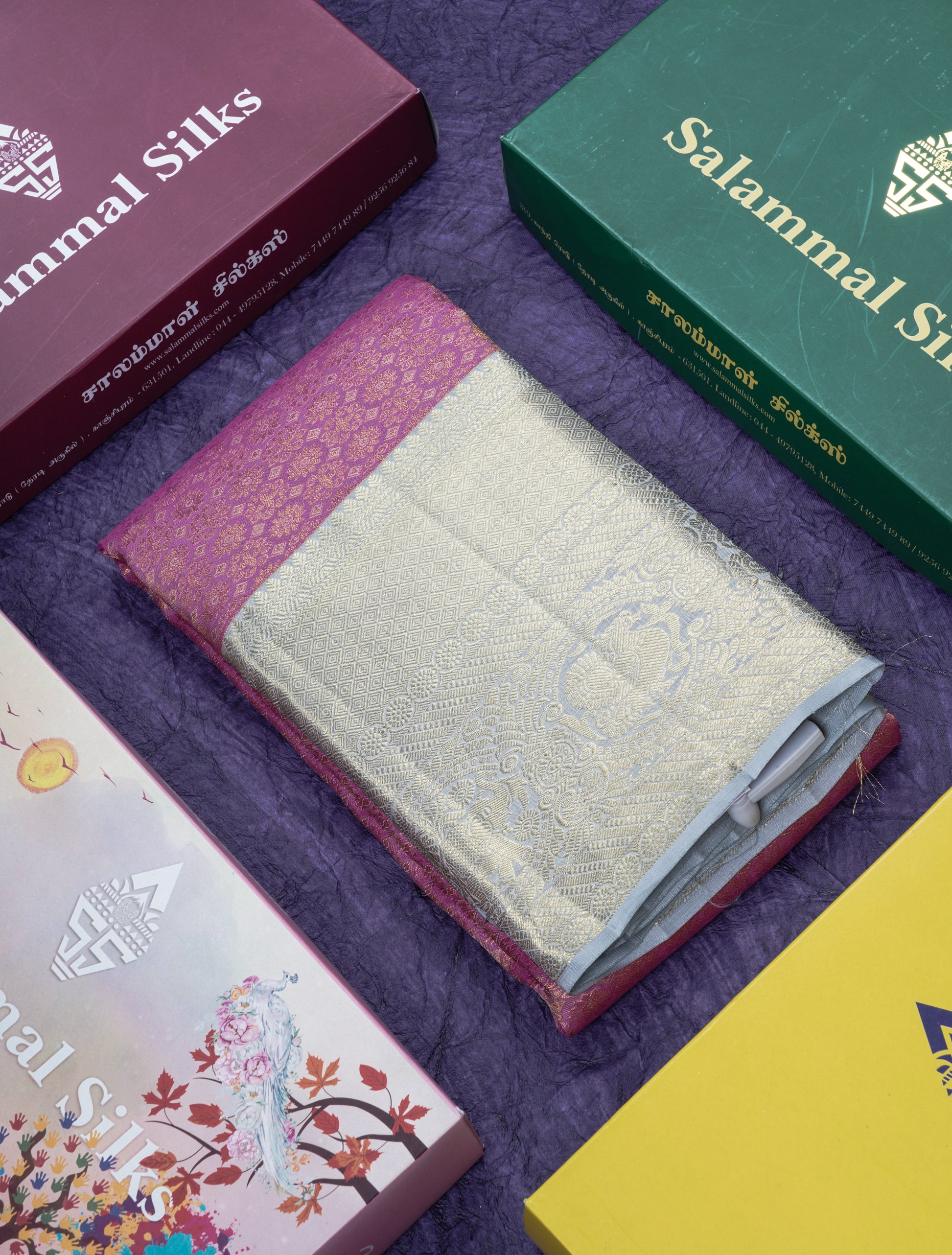 Salammal is known for its handloom sarees. In some sarees, there is cross-weaving between the body and the pallu, which is a sign of pure handloom sarees. This can be seen in Kanchipuram embossed sarees.