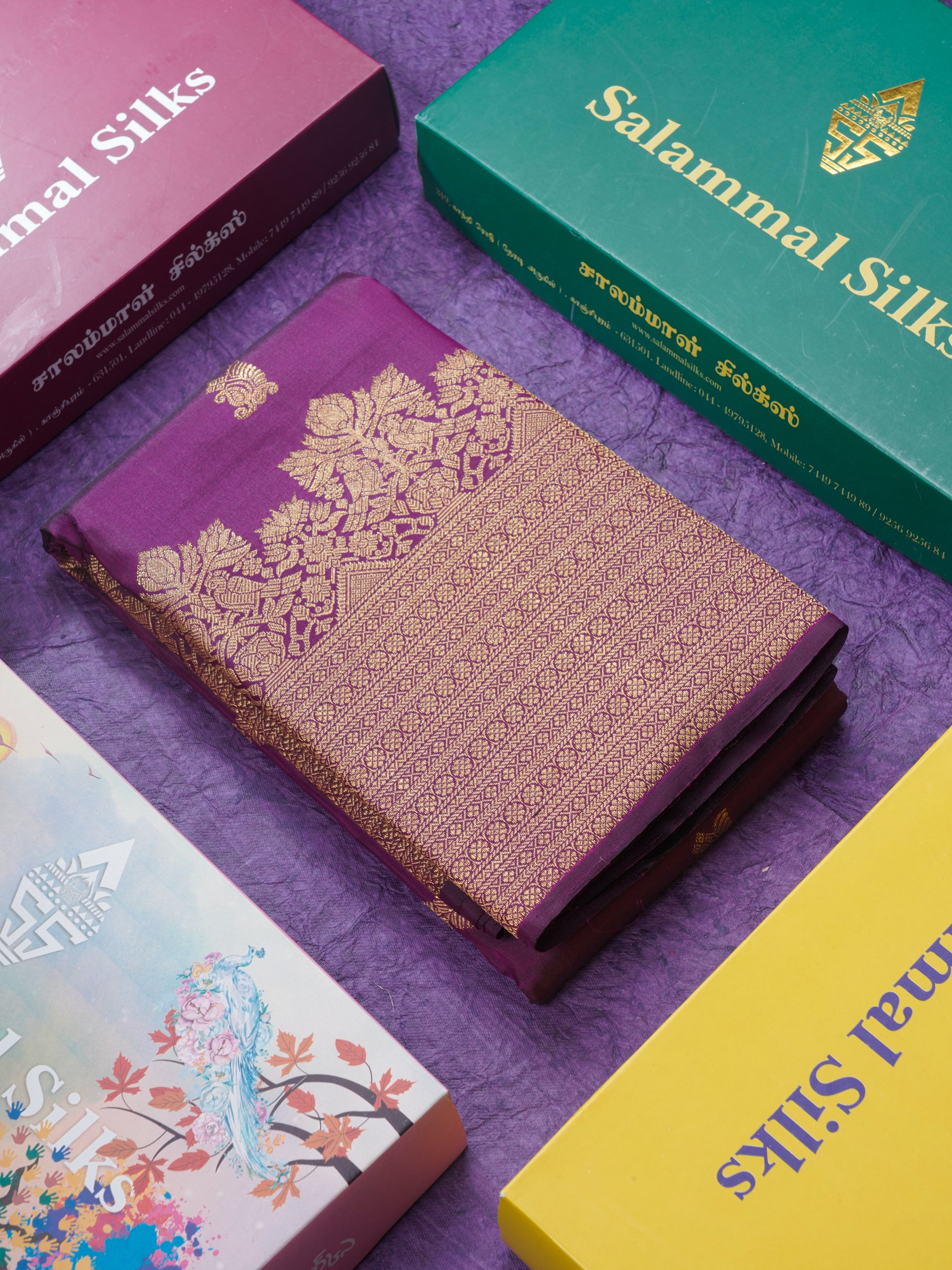 Salammal is known for its handloom sarees. In some sarees, there is cross-weaving between the body and the pallu, which is a sign of pure handloom sarees. This can be seen in Kanchipuram embossed sarees.