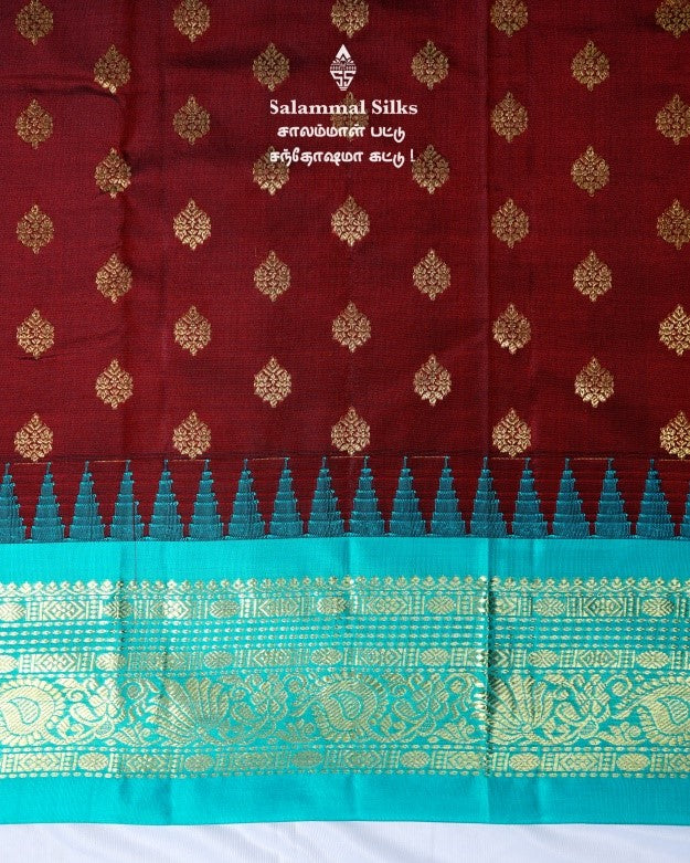 Maroon with Sapphire Green Kanjivaram Silk Saree.