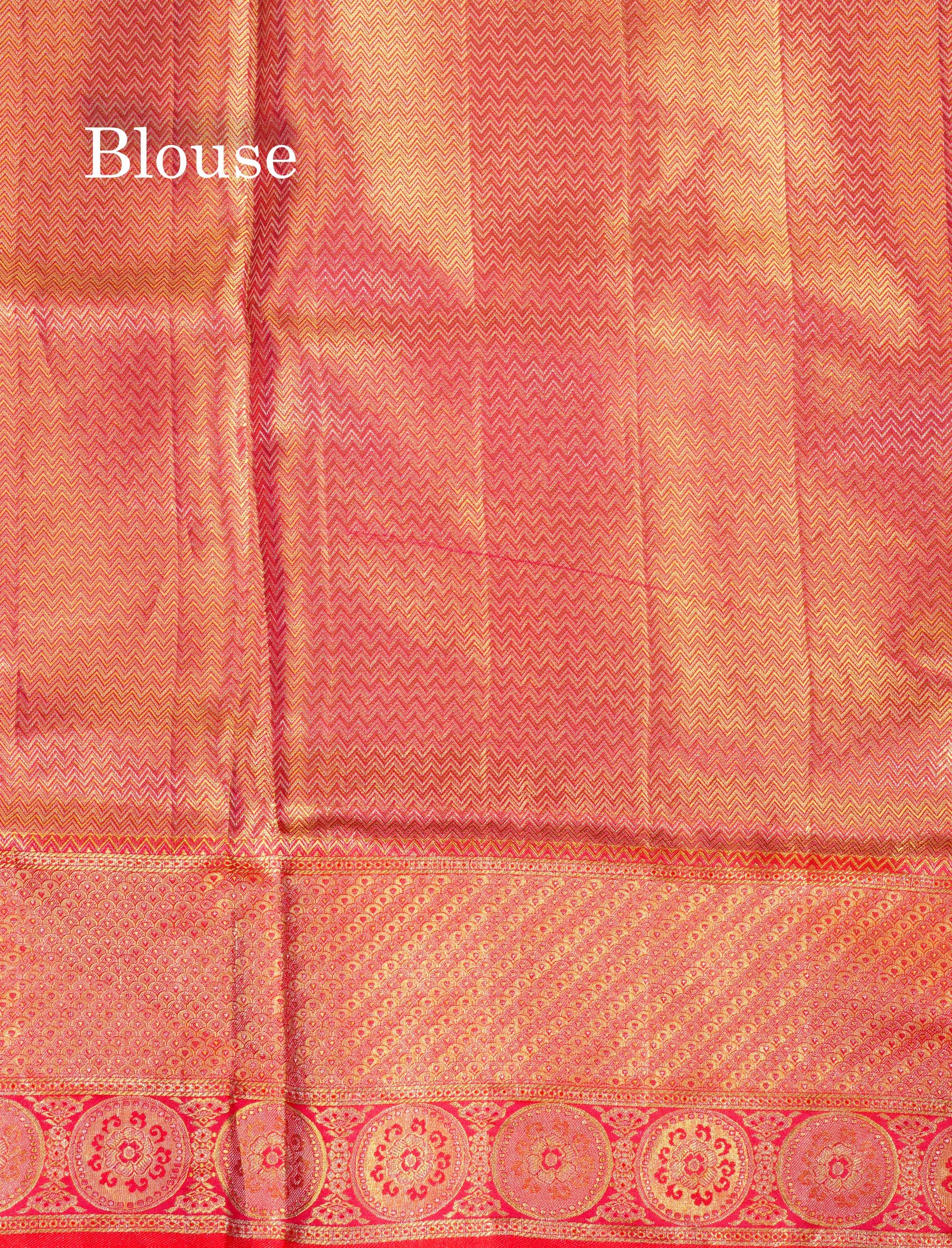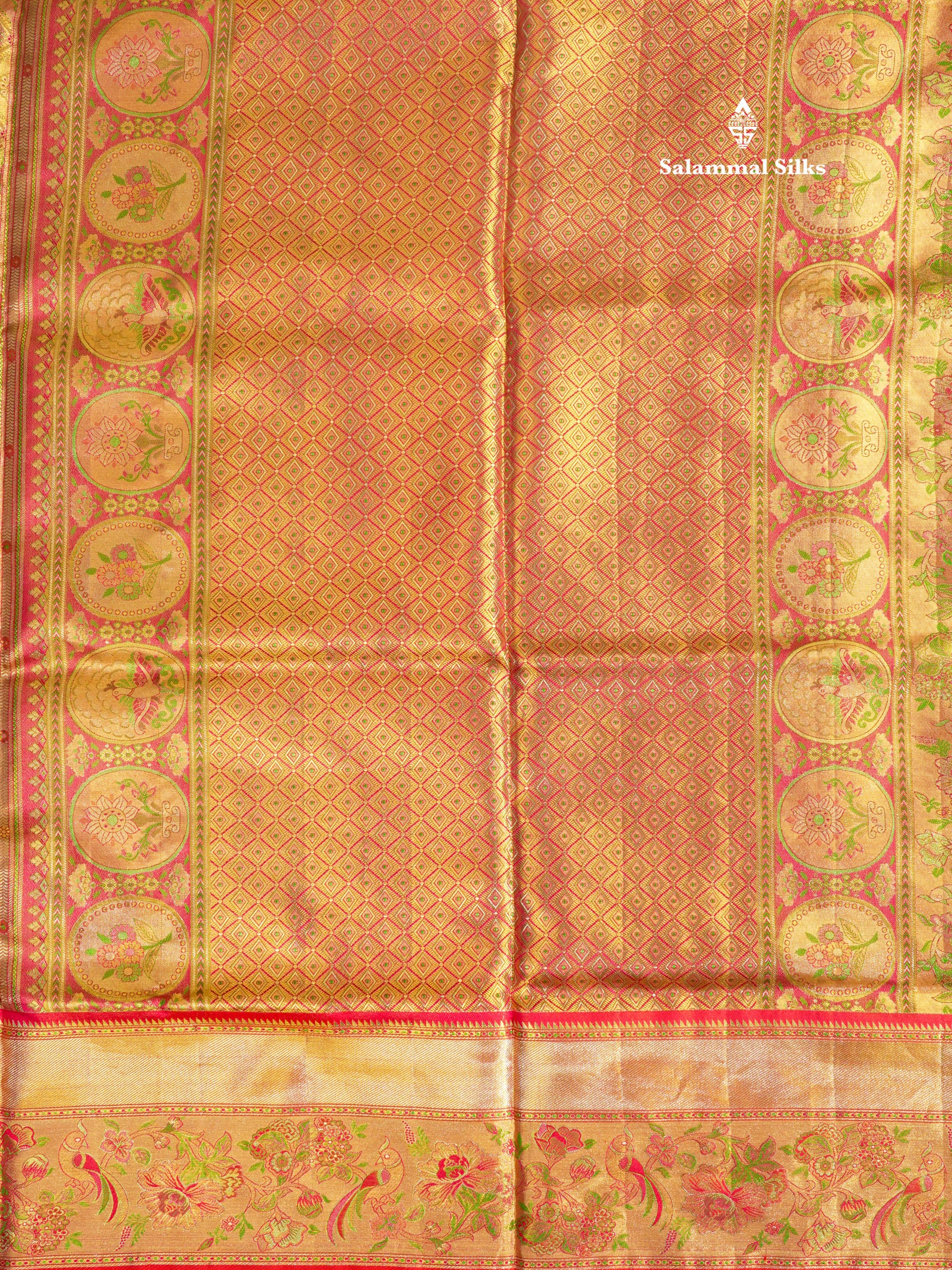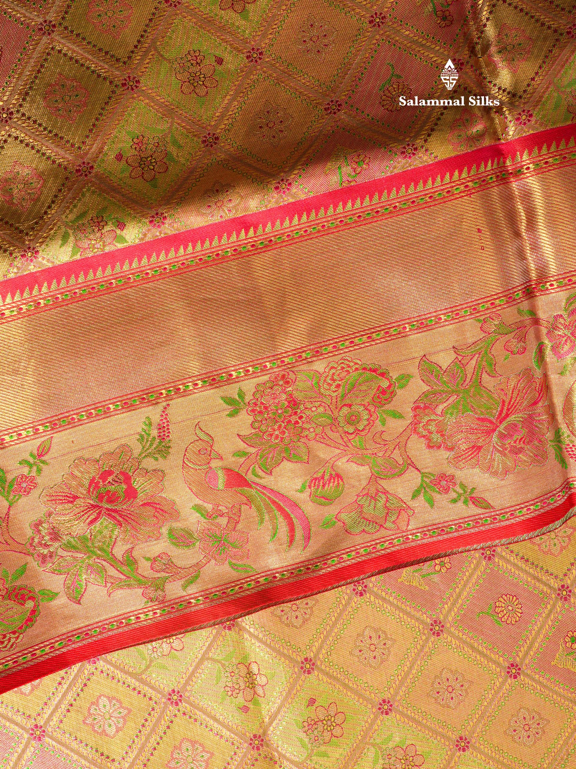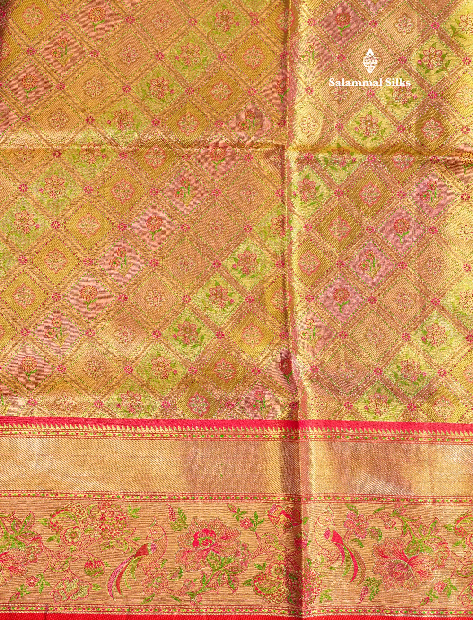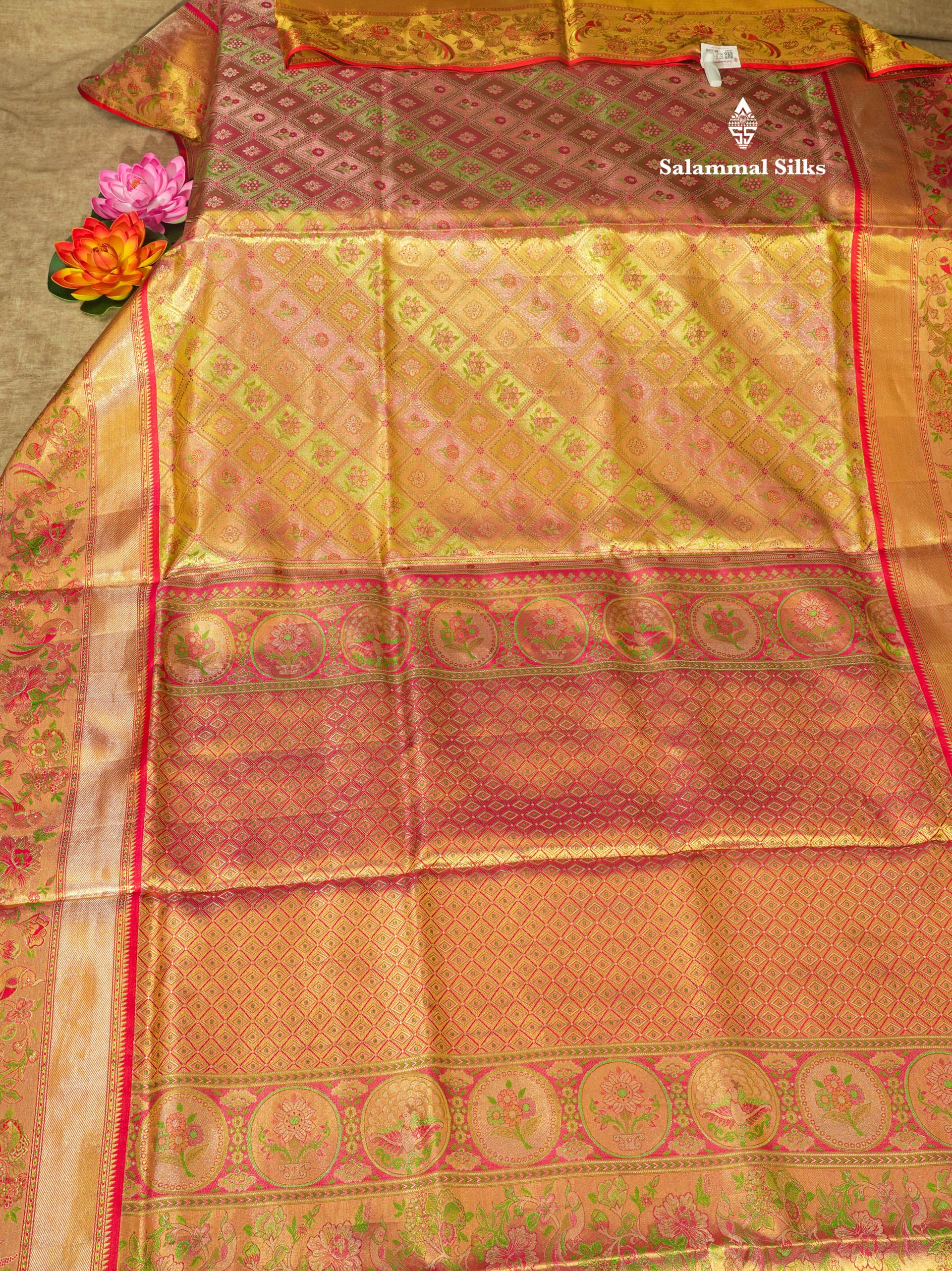 Multicolour Menakari Work Tissue Bridal Pure Kanjivaram Silk Saree With Contrast Chilly Red Border