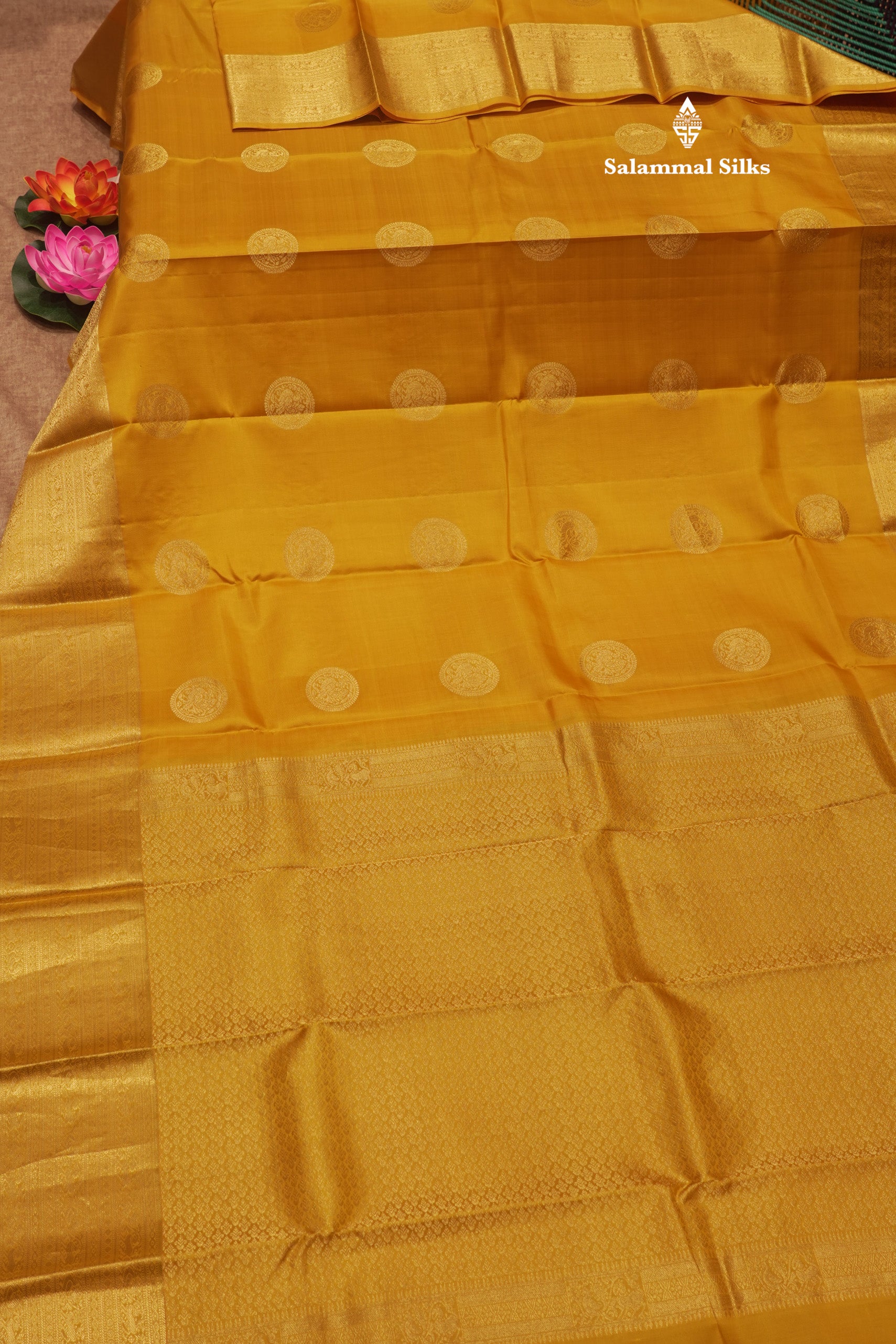 Salammal is known for its handloom sarees. In some sarees, there is cross-weaving between the body and the pallu, which is a sign of pure handloom sarees. This can be seen in Kanchipuram embossed sarees.