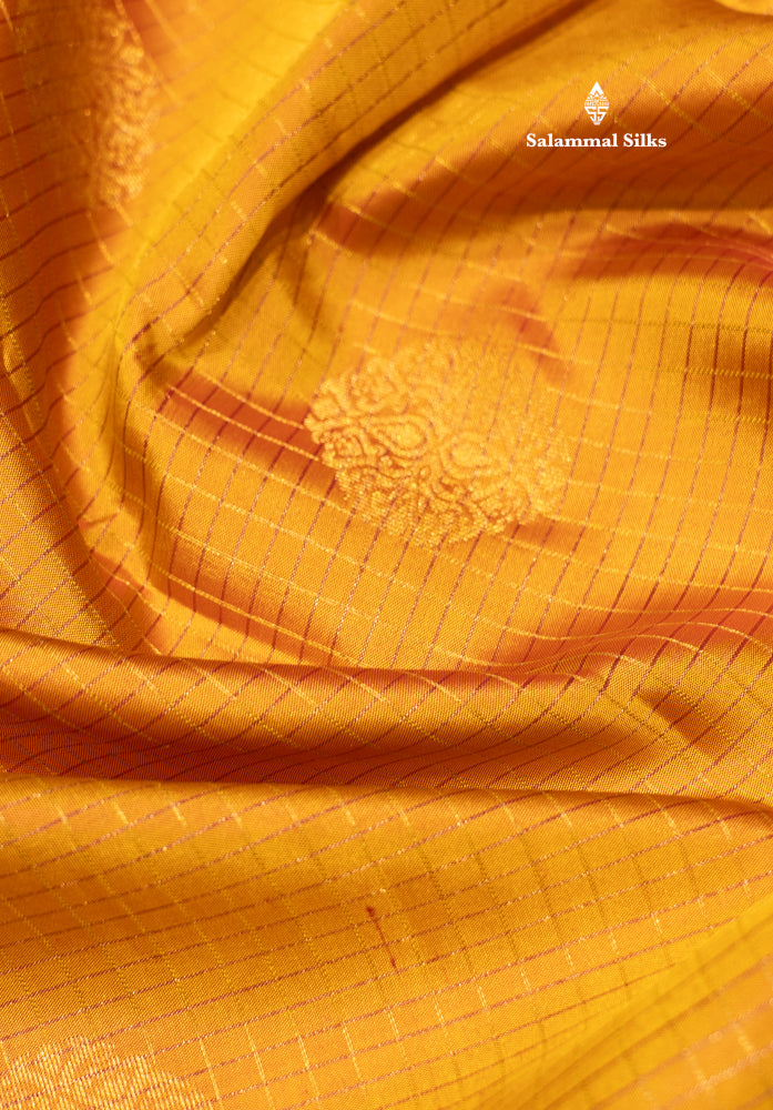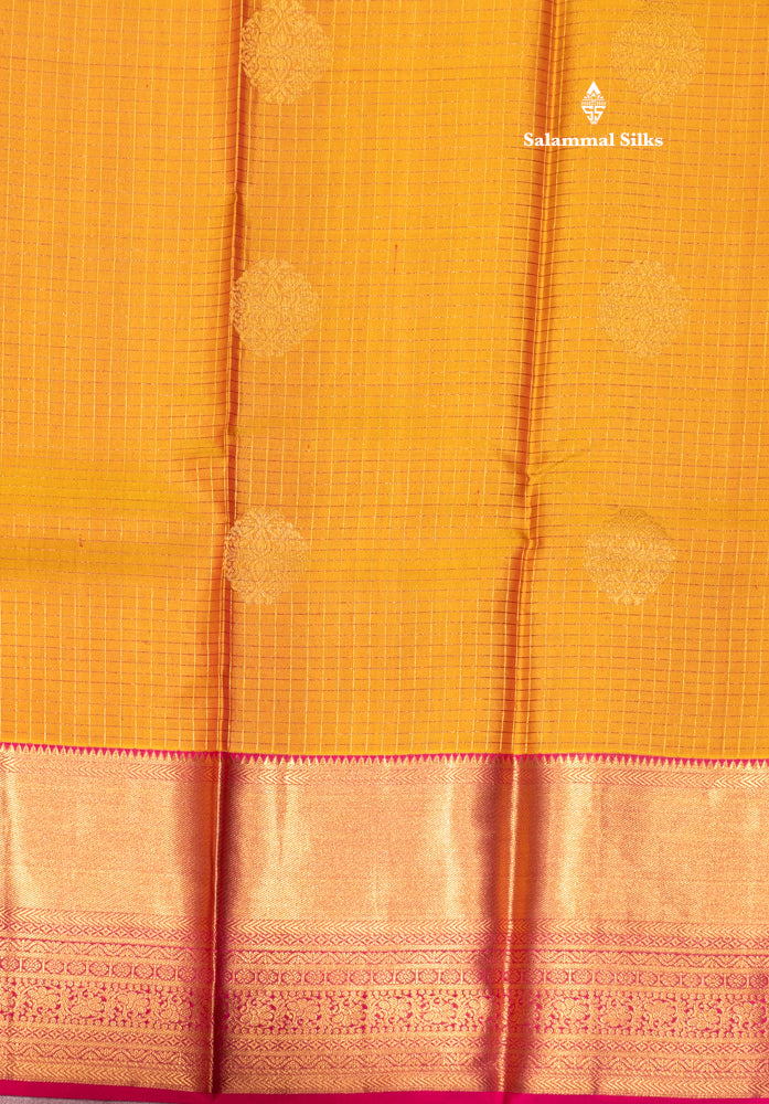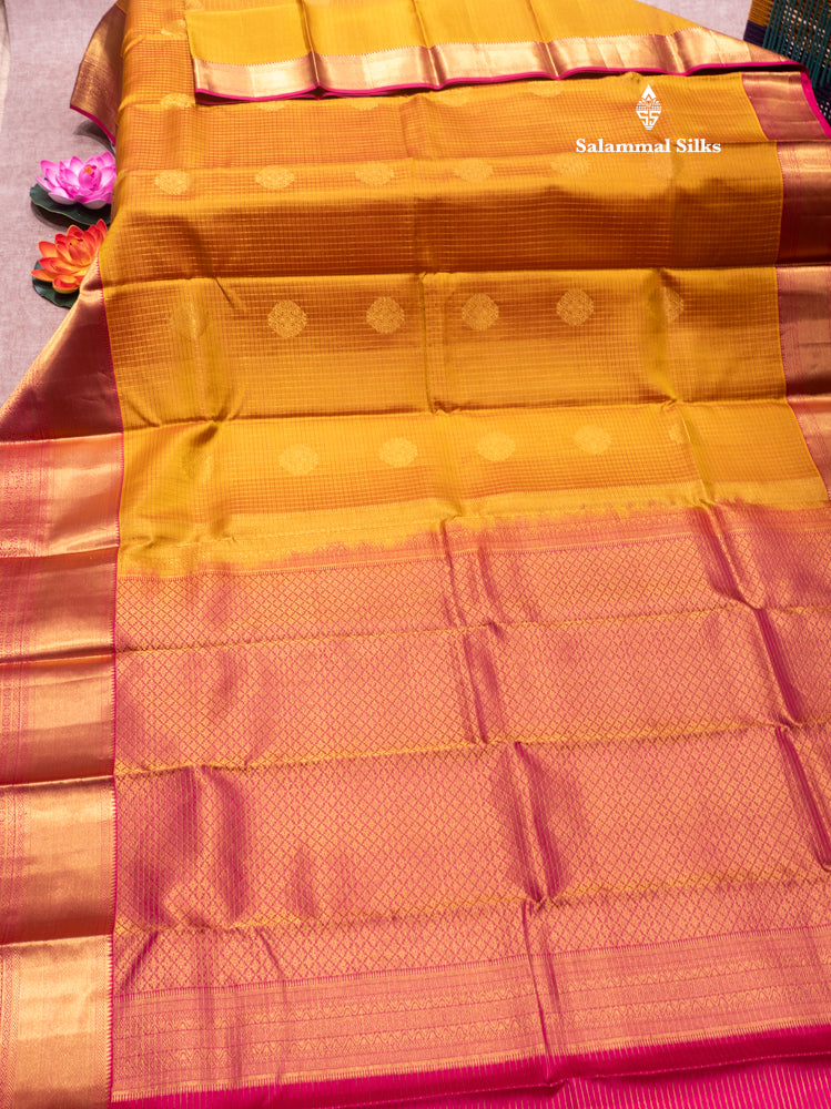 Mustard Yellow Colour Small Zari Checks Pure Kanjivaram Silk Saree With Pink Border