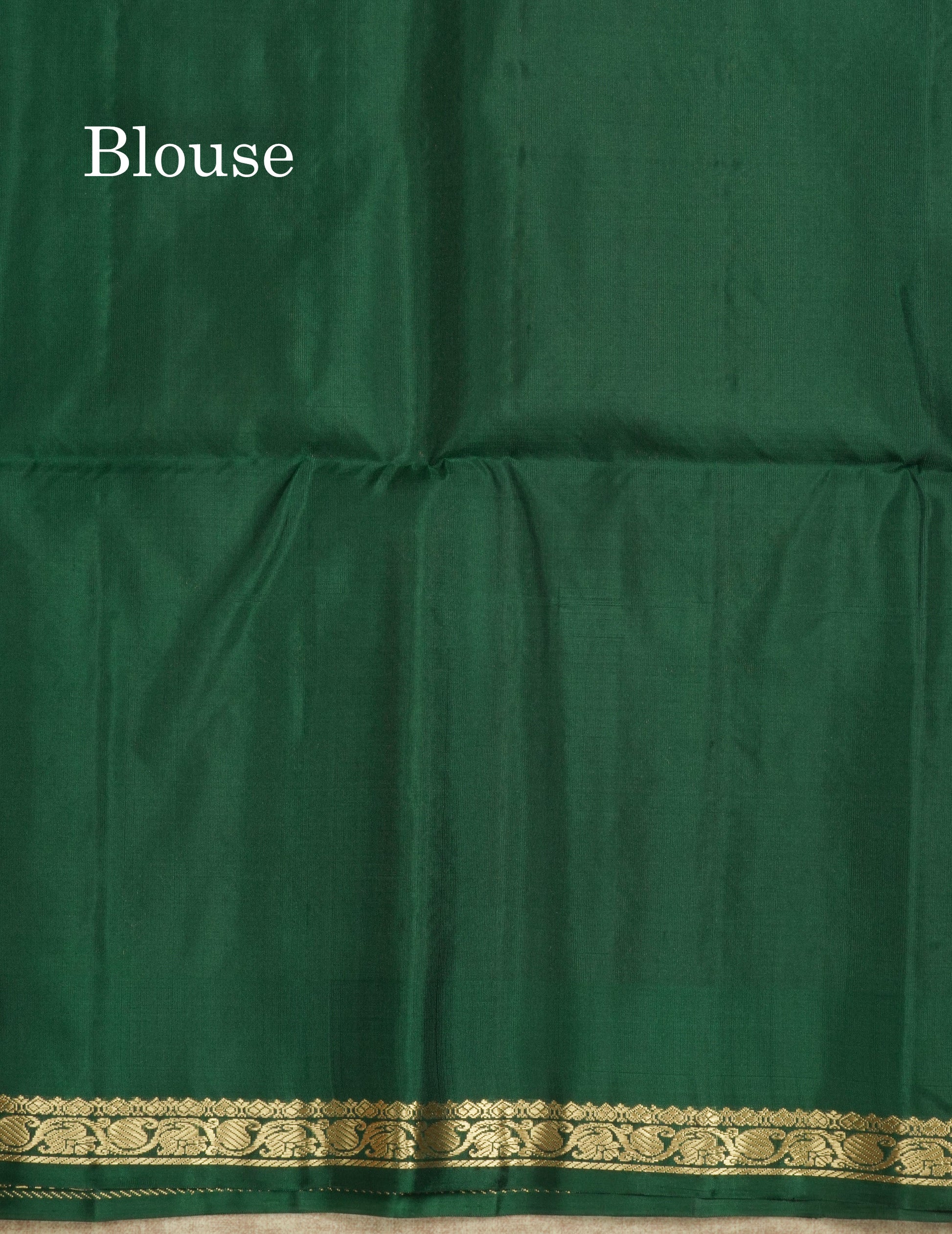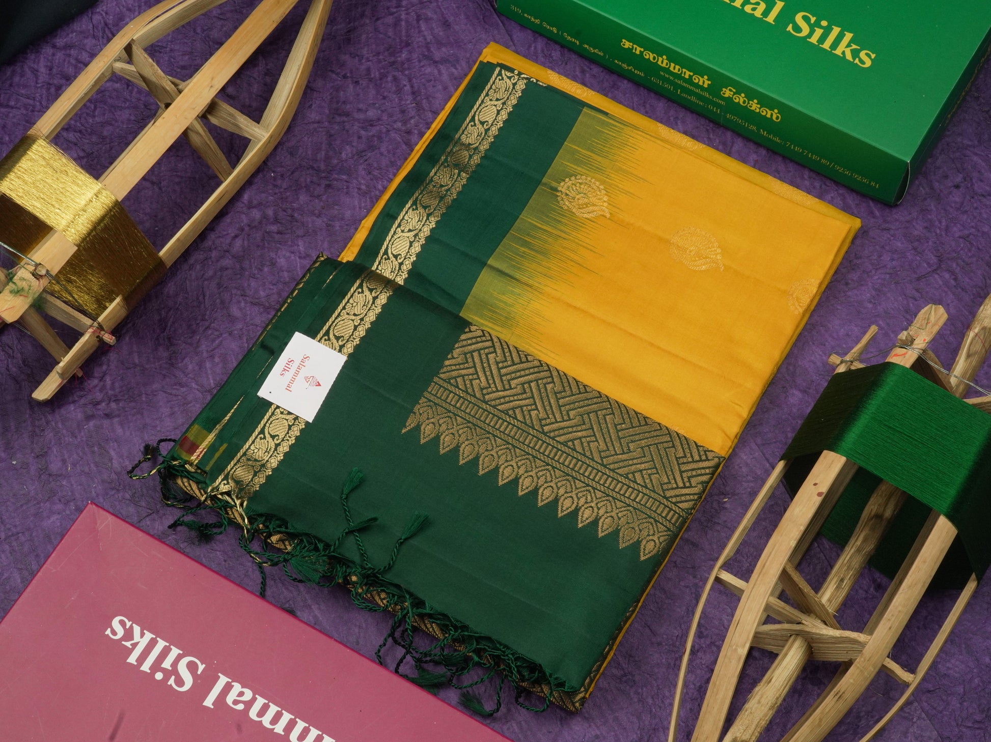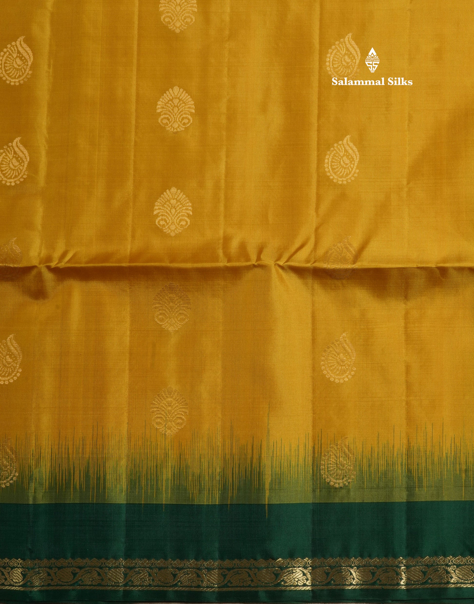 Mustard Yellow Pure Kanjivaram Soft Silk Saree With Contrast Bottle Green Small Traditional Border