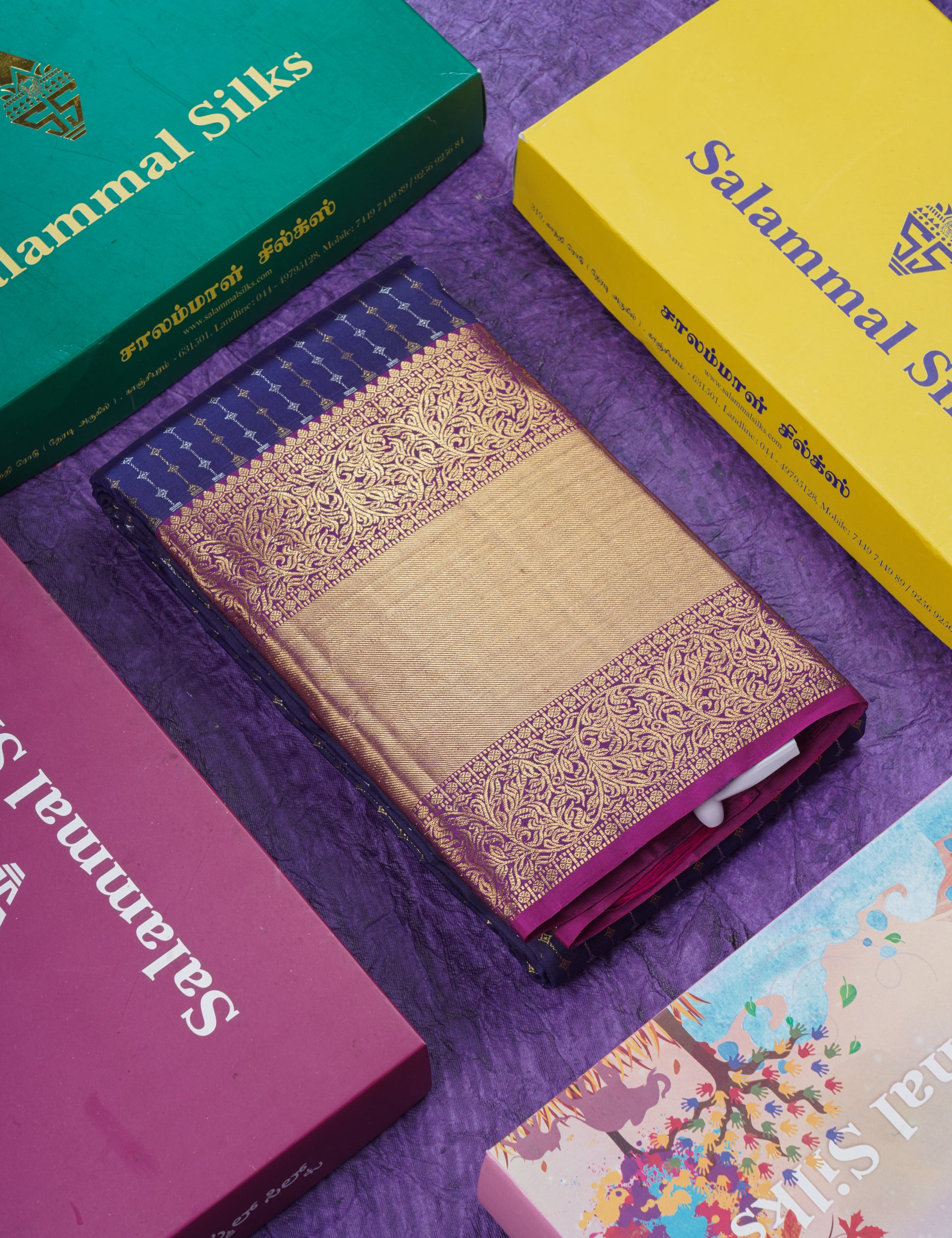 Salammal is known for its handloom sarees. In some sarees, there is cross-weaving between the body and the pallu, which is a sign of pure handloom sarees. This can be seen in Kanchipuram embossed sarees.