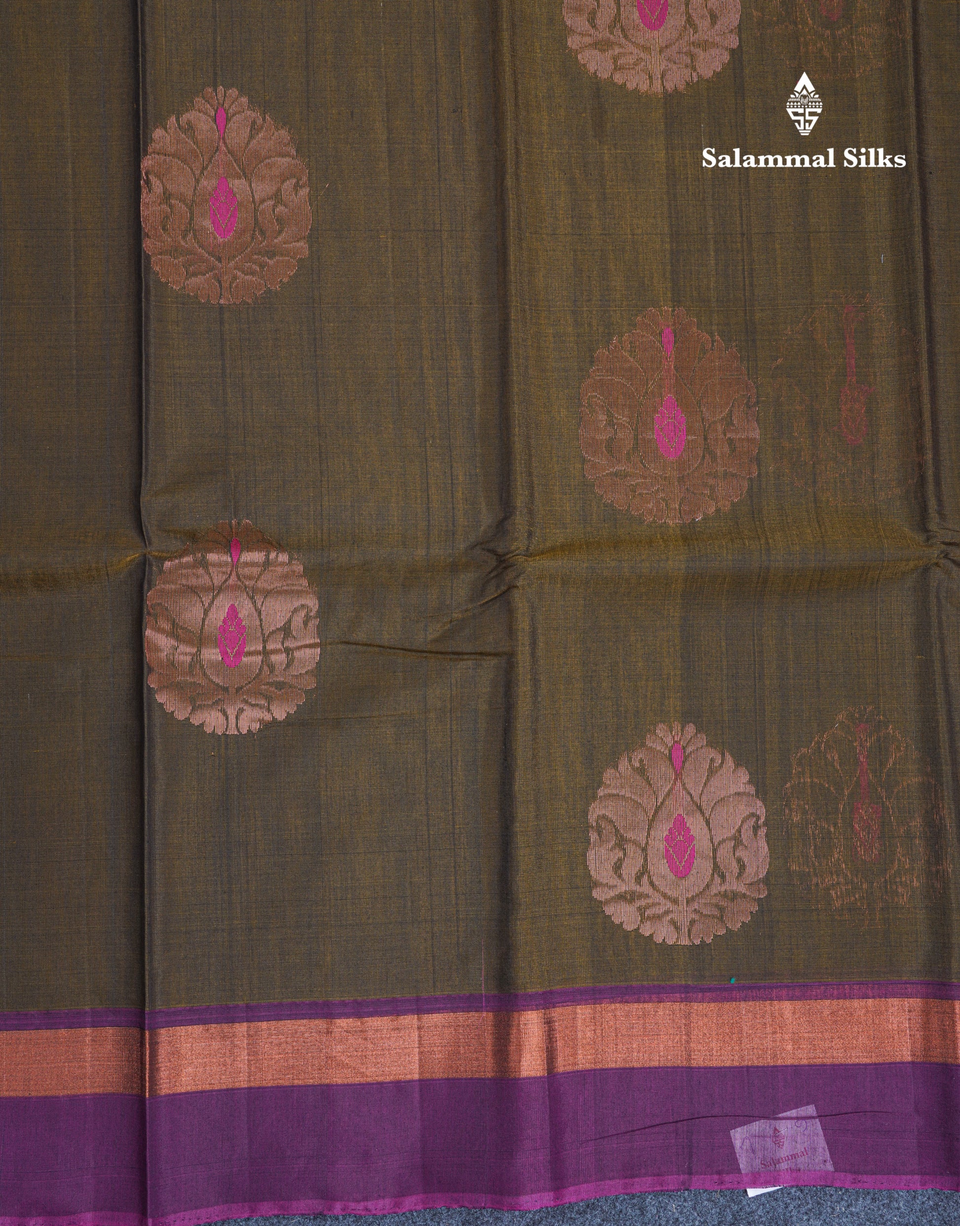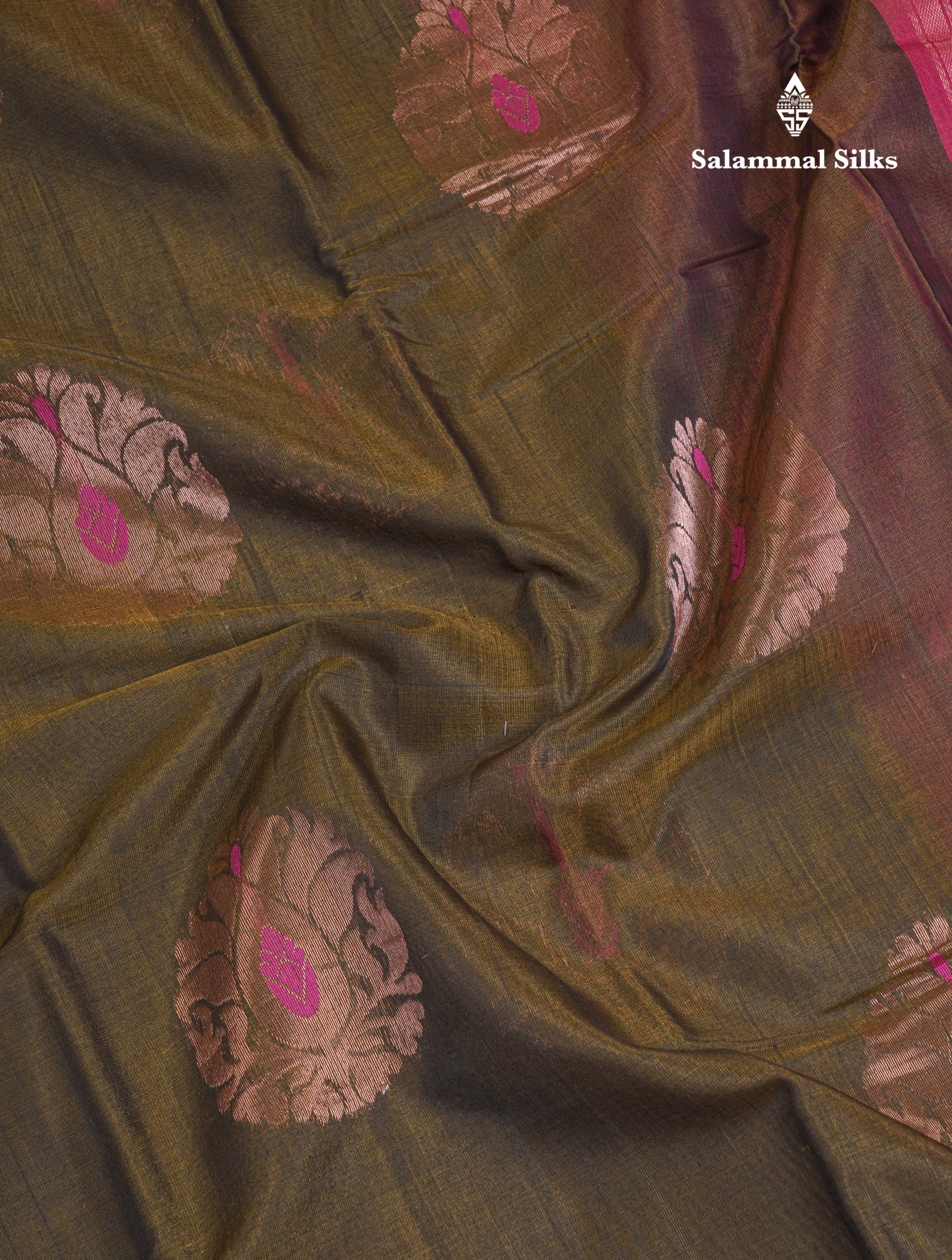 Salammal is known for its handloom sarees. In some sarees, there is cross-weaving between the body and the pallu, which is a sign of pure handloom sarees. This can be seen in Kanchipuram embossed sarees.