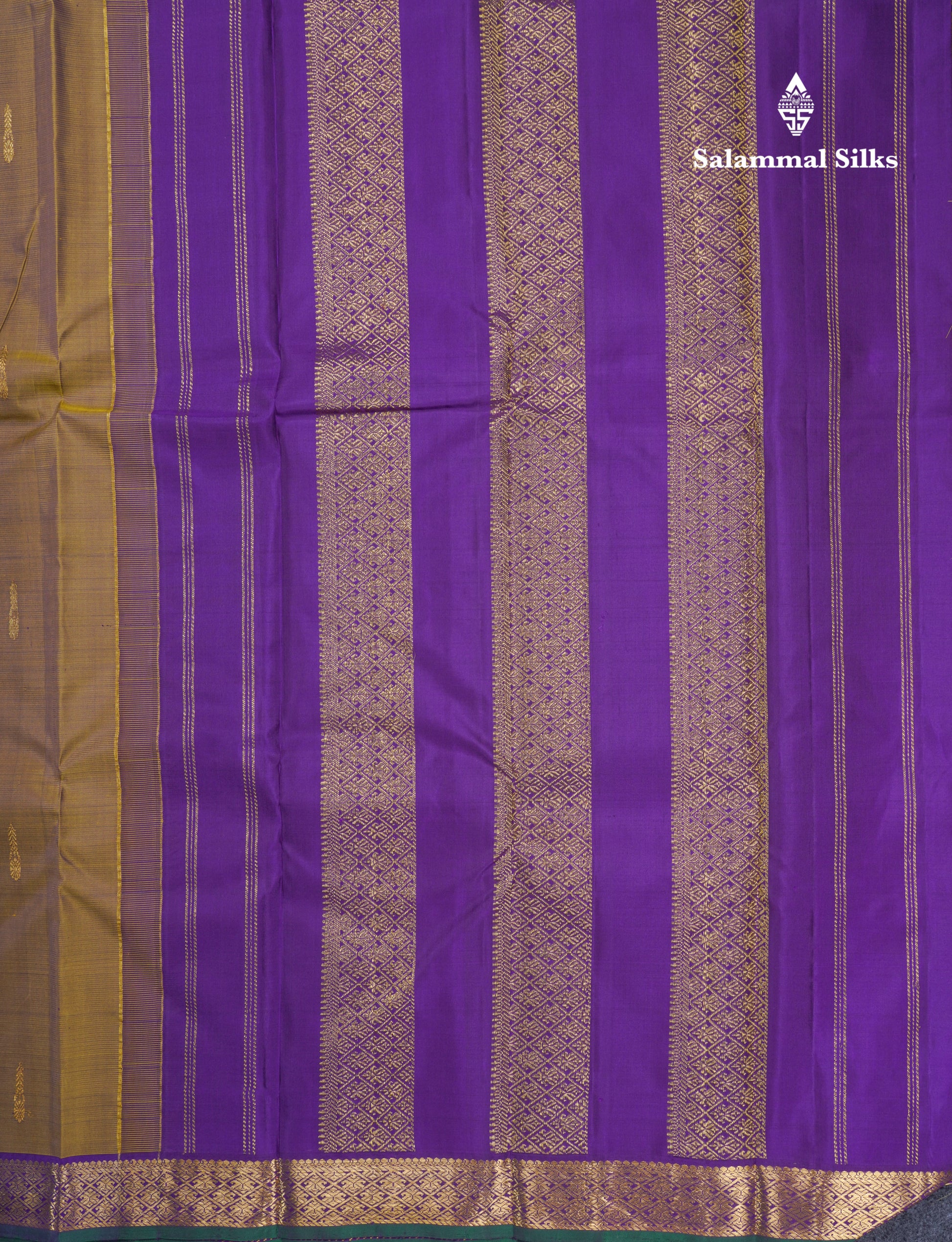 Olive Mustard Yellow Pure Kanjivaram Silk Saree With Contrast Dark Purple Small Traditional Border