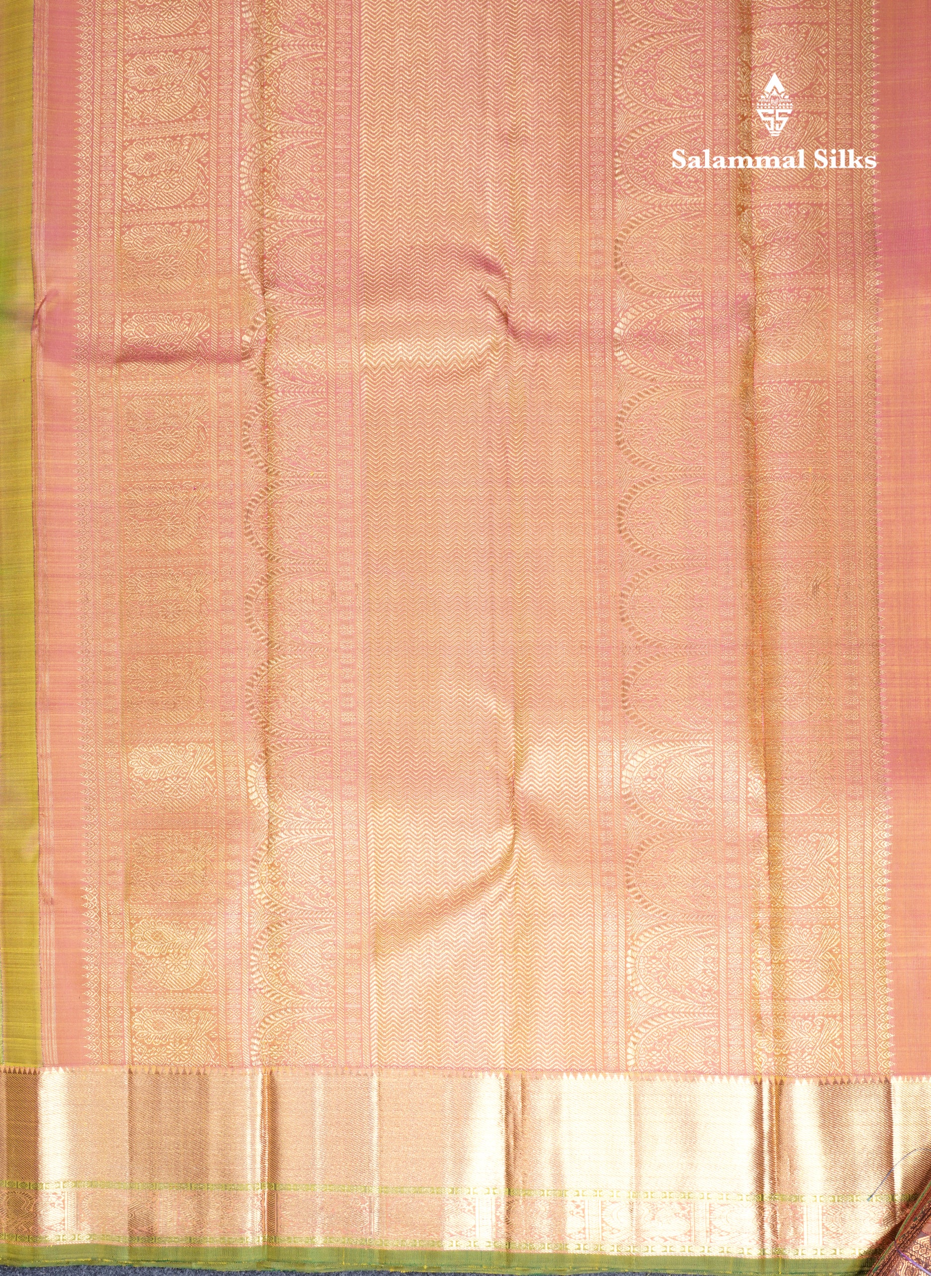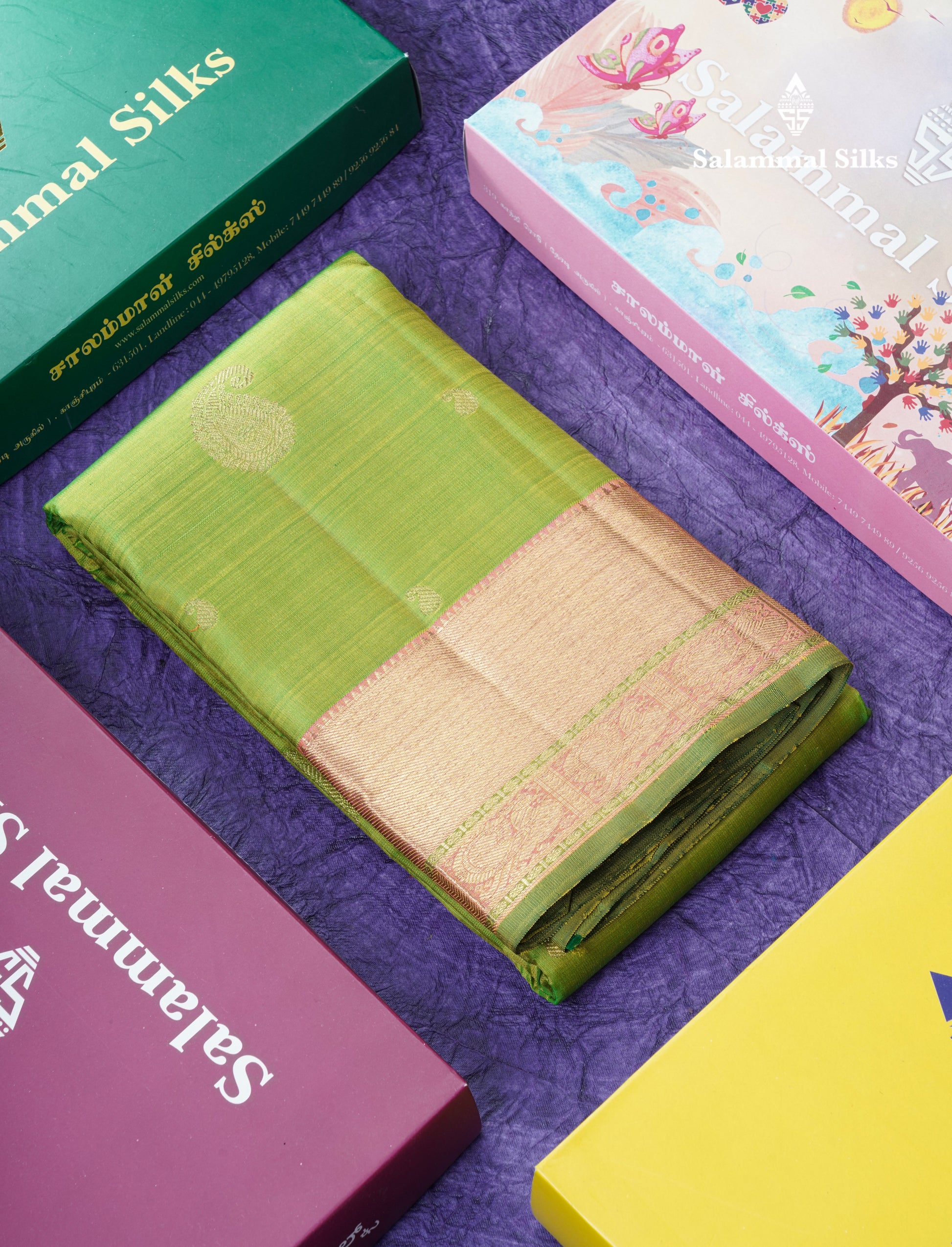 Parrot Green Traditional Buttas Pure Kanjivaram Silk Saree Pure Zari with Pink Border