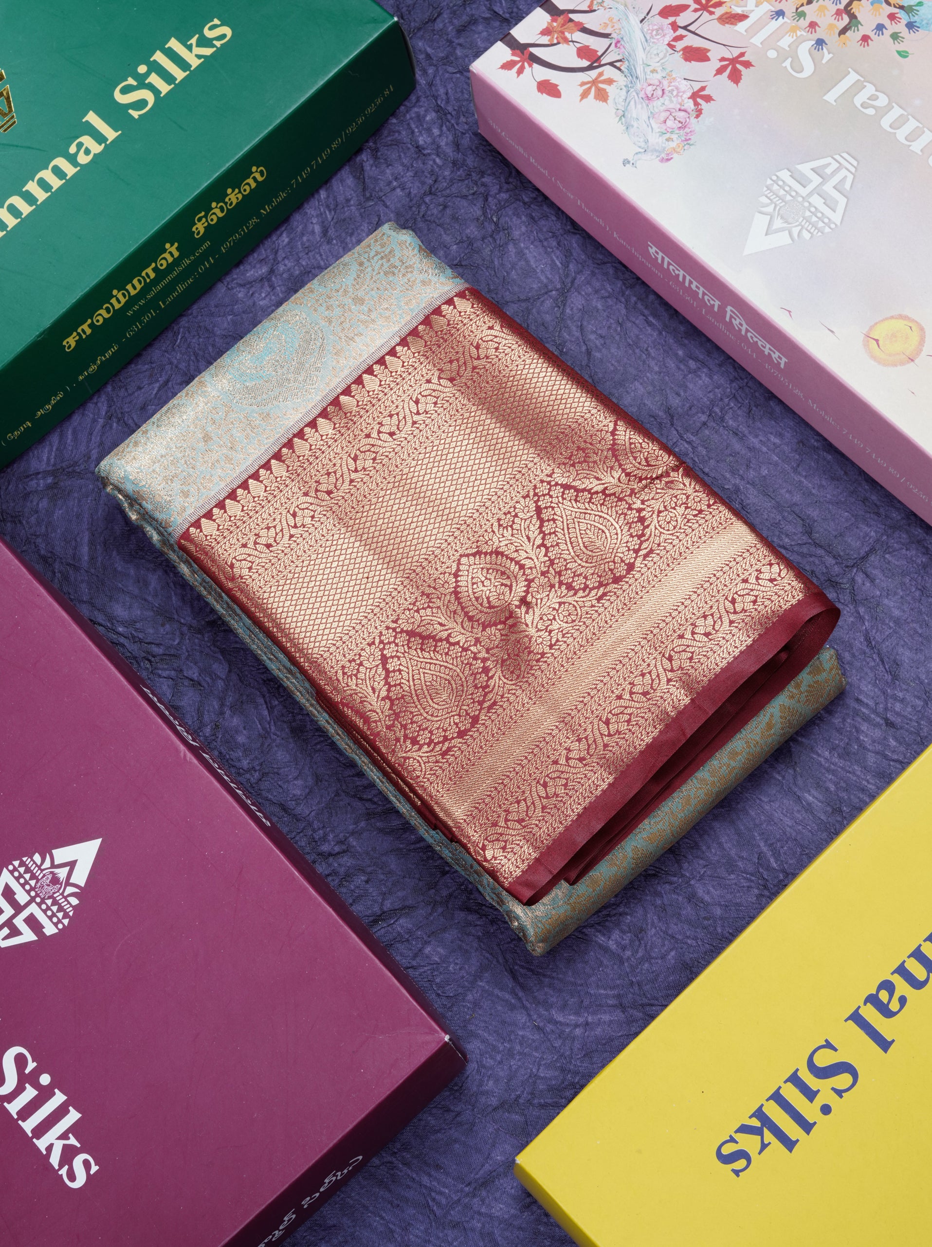 Salammal is known for its handloom sarees. In some sarees, there is cross-weaving between the body and the pallu, which is a sign of pure handloom sarees. This can be seen in Kanchipuram embossed sarees.