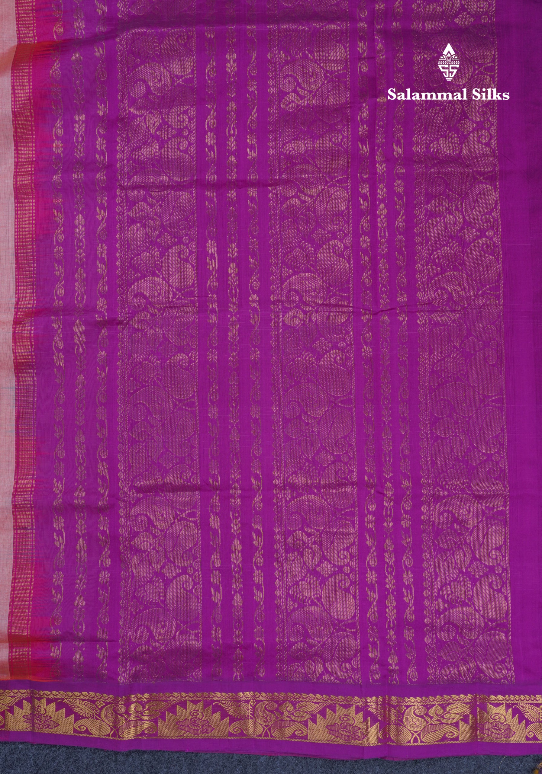 Salammal is known for its handloom sarees. In some sarees, there is cross-weaving between the body and the pallu, which is a sign of pure handloom sarees. This can be seen in Kanchipuram embossed sarees.