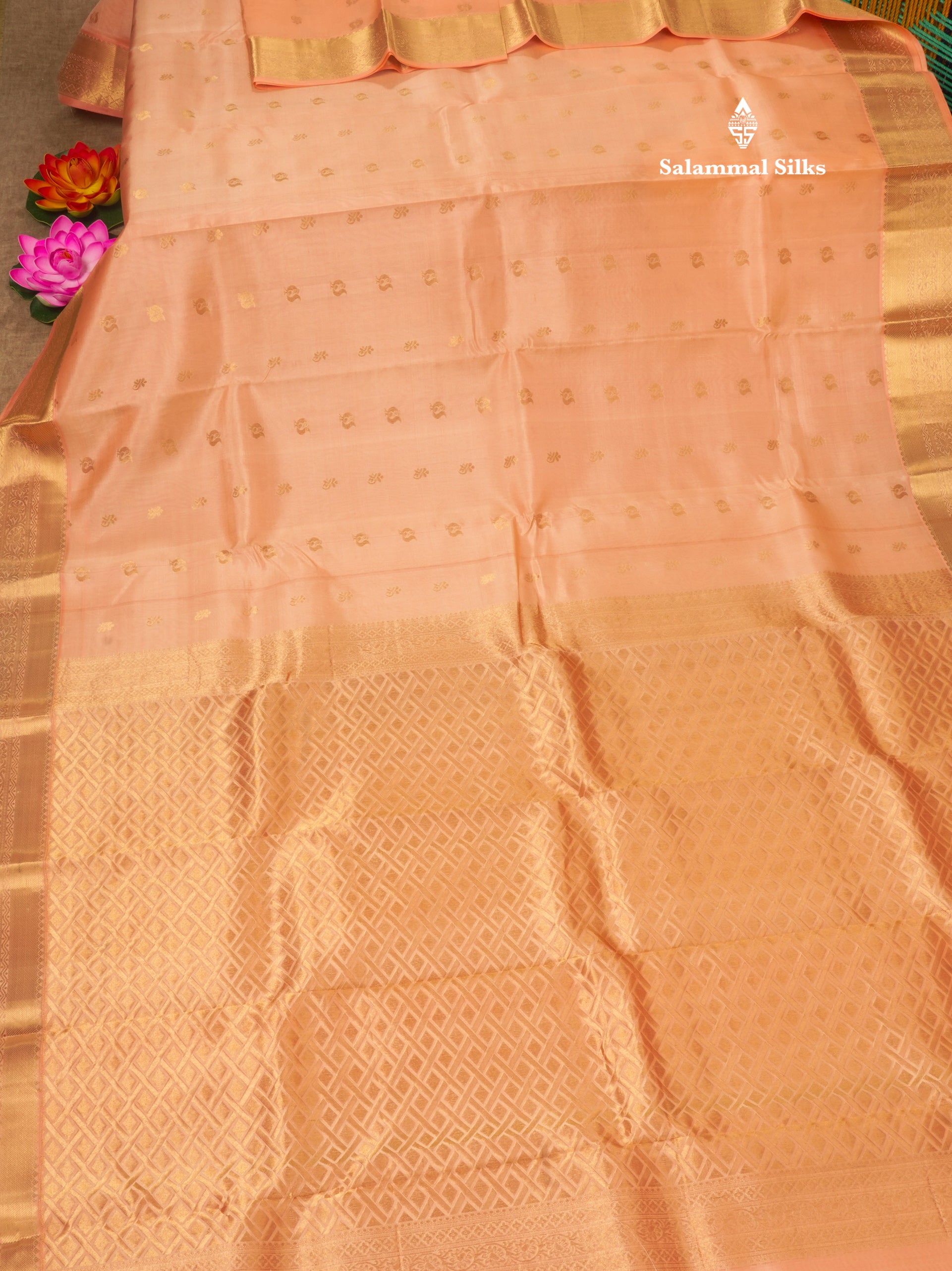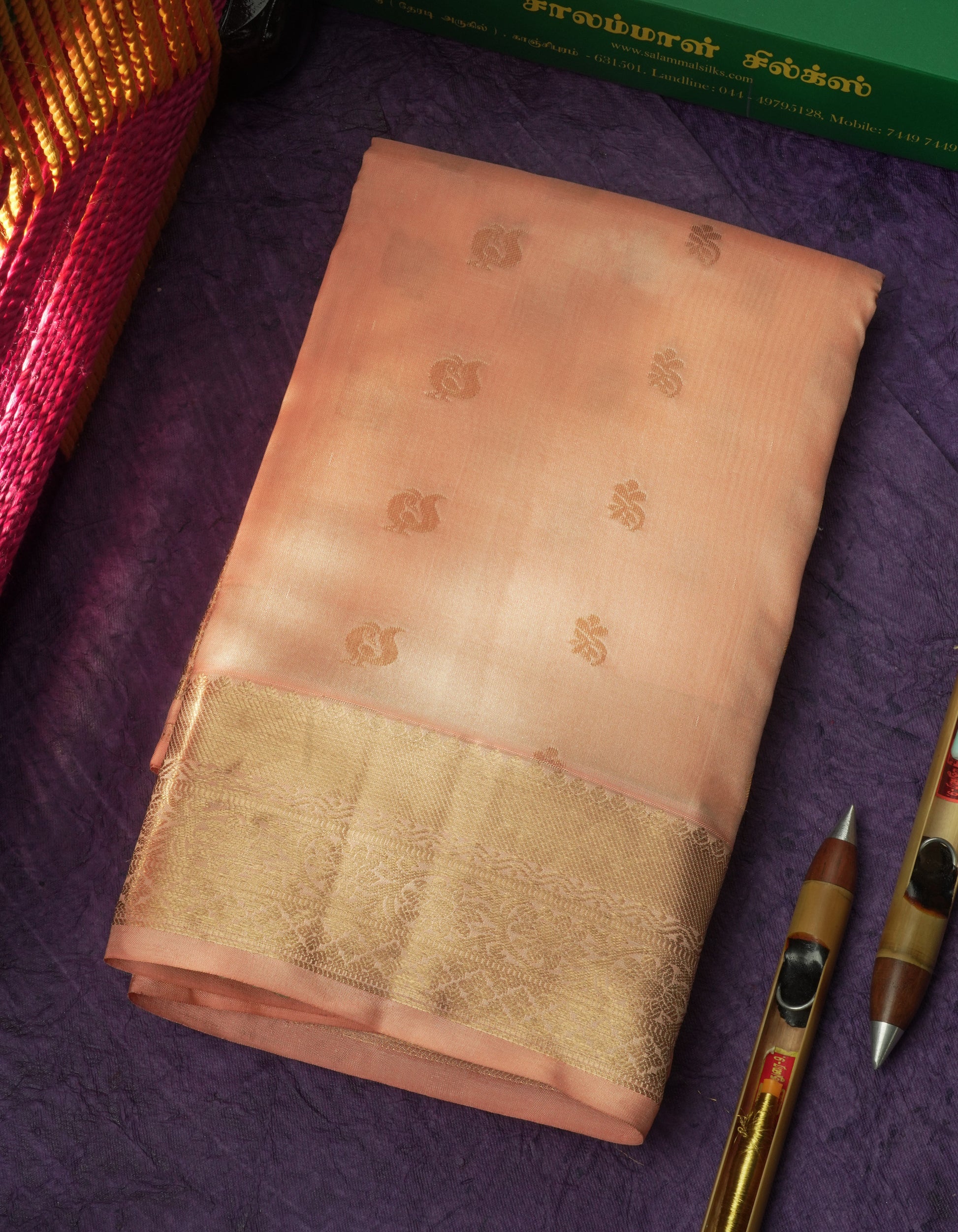 Salammal is known for its handloom sarees. In some sarees, there is cross-weaving between the body and the pallu, which is a sign of pure handloom sarees. This can be seen in Kanchipuram embossed sarees.