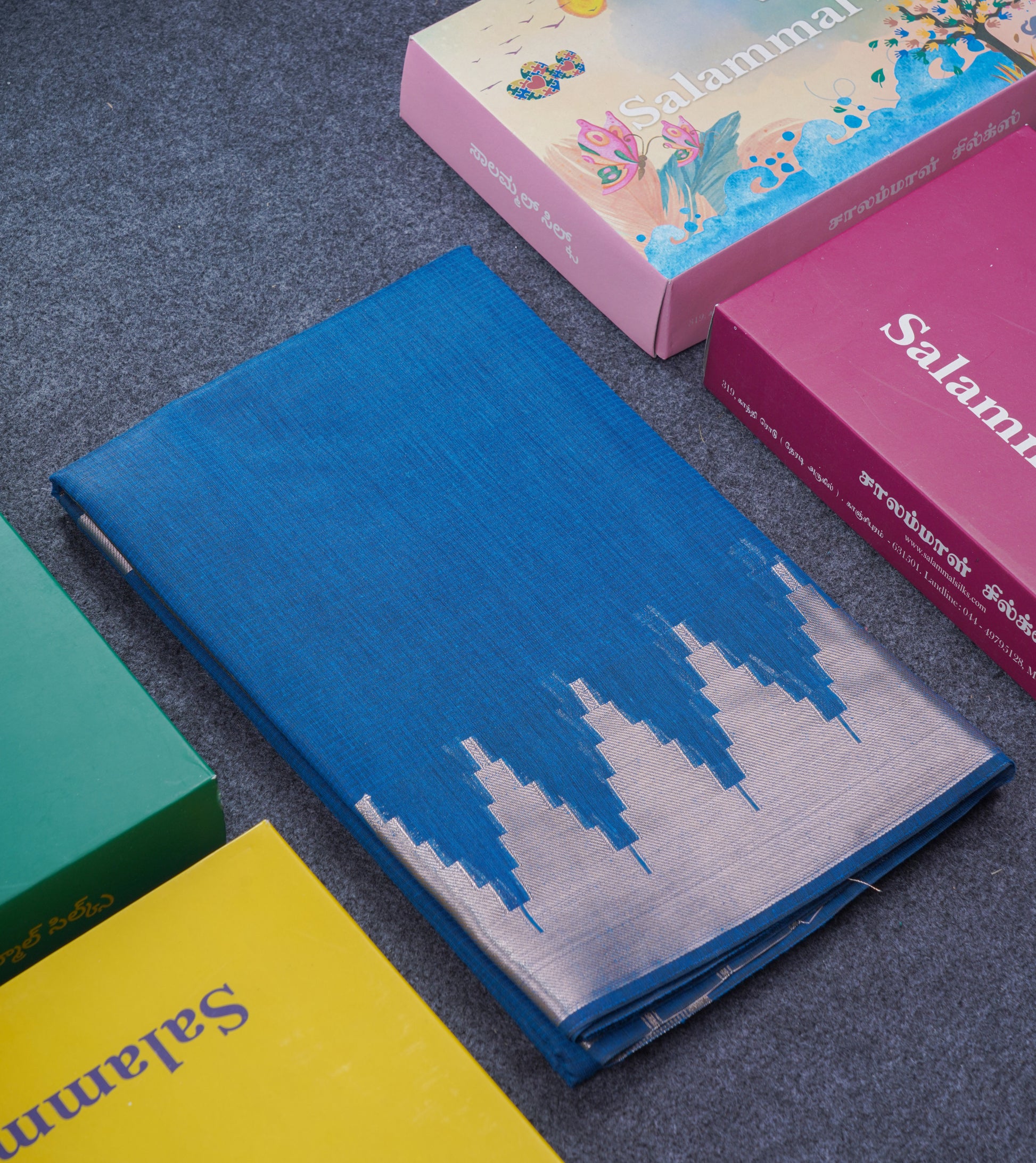 Salammal is known for its handloom sarees. In some sarees, there is cross-weaving between the body and the pallu, which is a sign of pure handloom sarees. This can be seen in Kanchipuram embossed sarees.