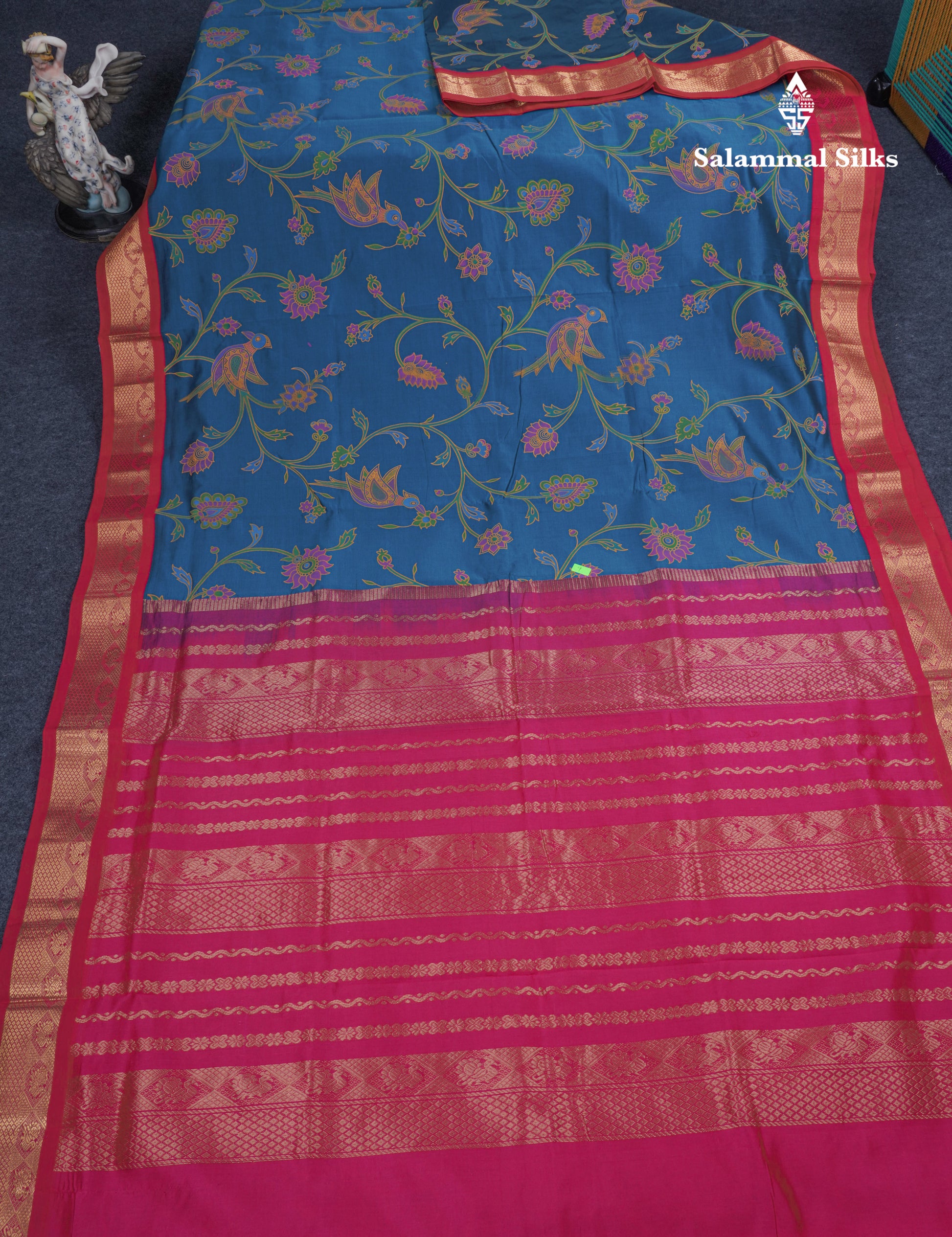 Peacock Blue Pichwai Print Semi Silk Cotton Saree With Contrast Reddish Pink Traditional Border