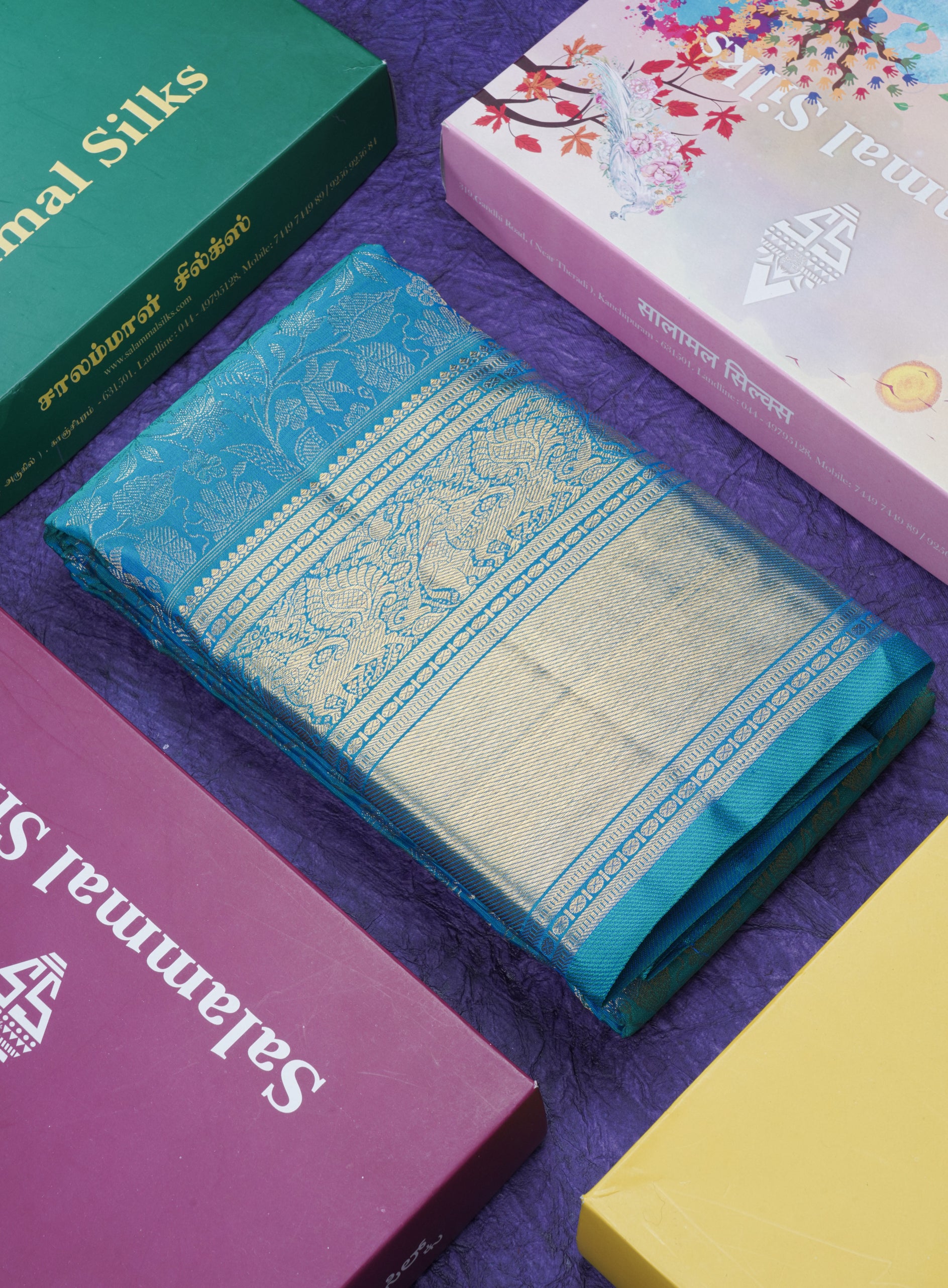 Salammal is known for its handloom sarees. In some sarees, there is cross-weaving between the body and the pallu, which is a sign of pure handloom sarees. This can be seen in Kanchipuram embossed sarees.