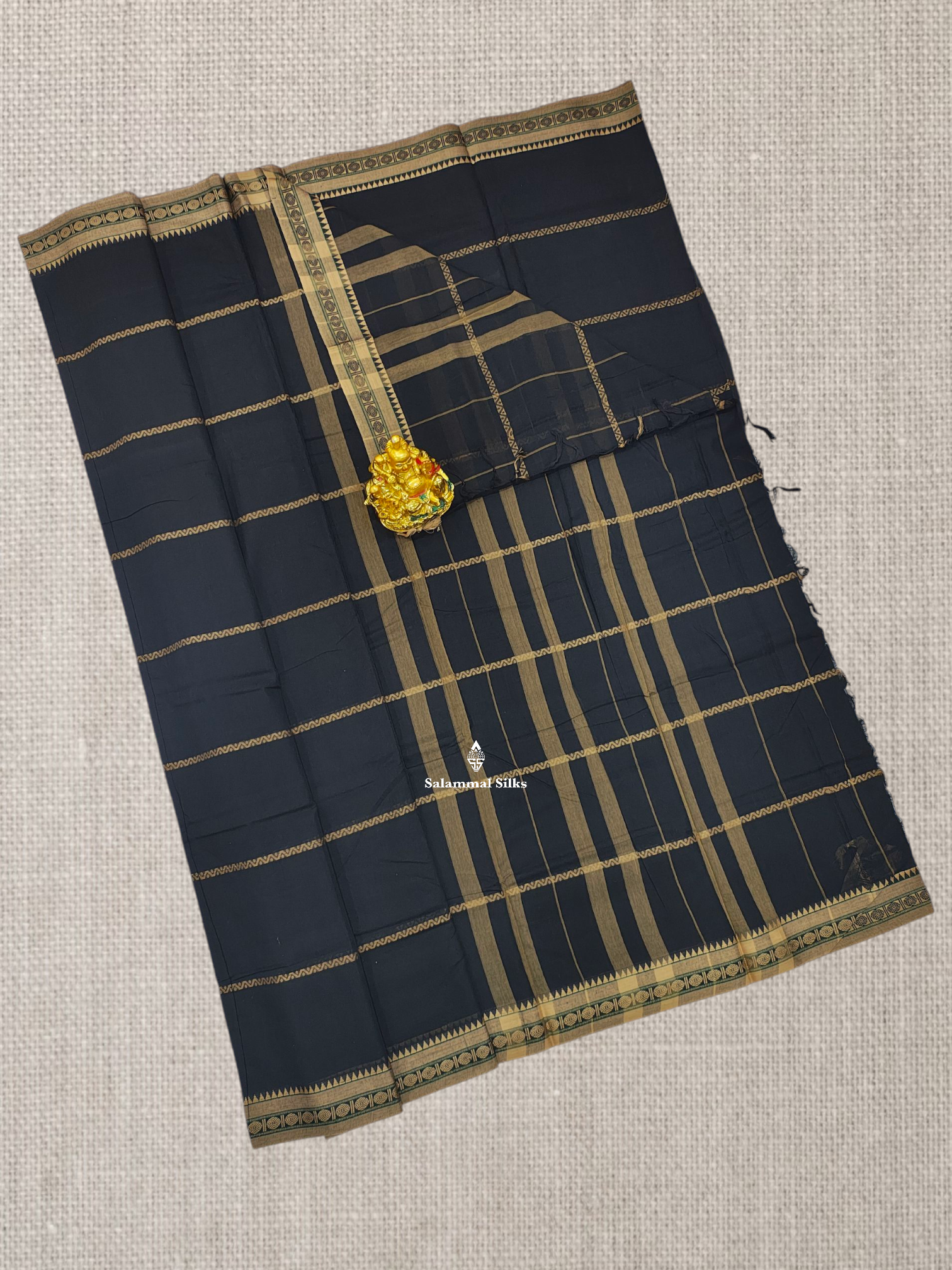 Peacock Blue Thread Lines Pure Cotton Saree With Mustard Yellow Border