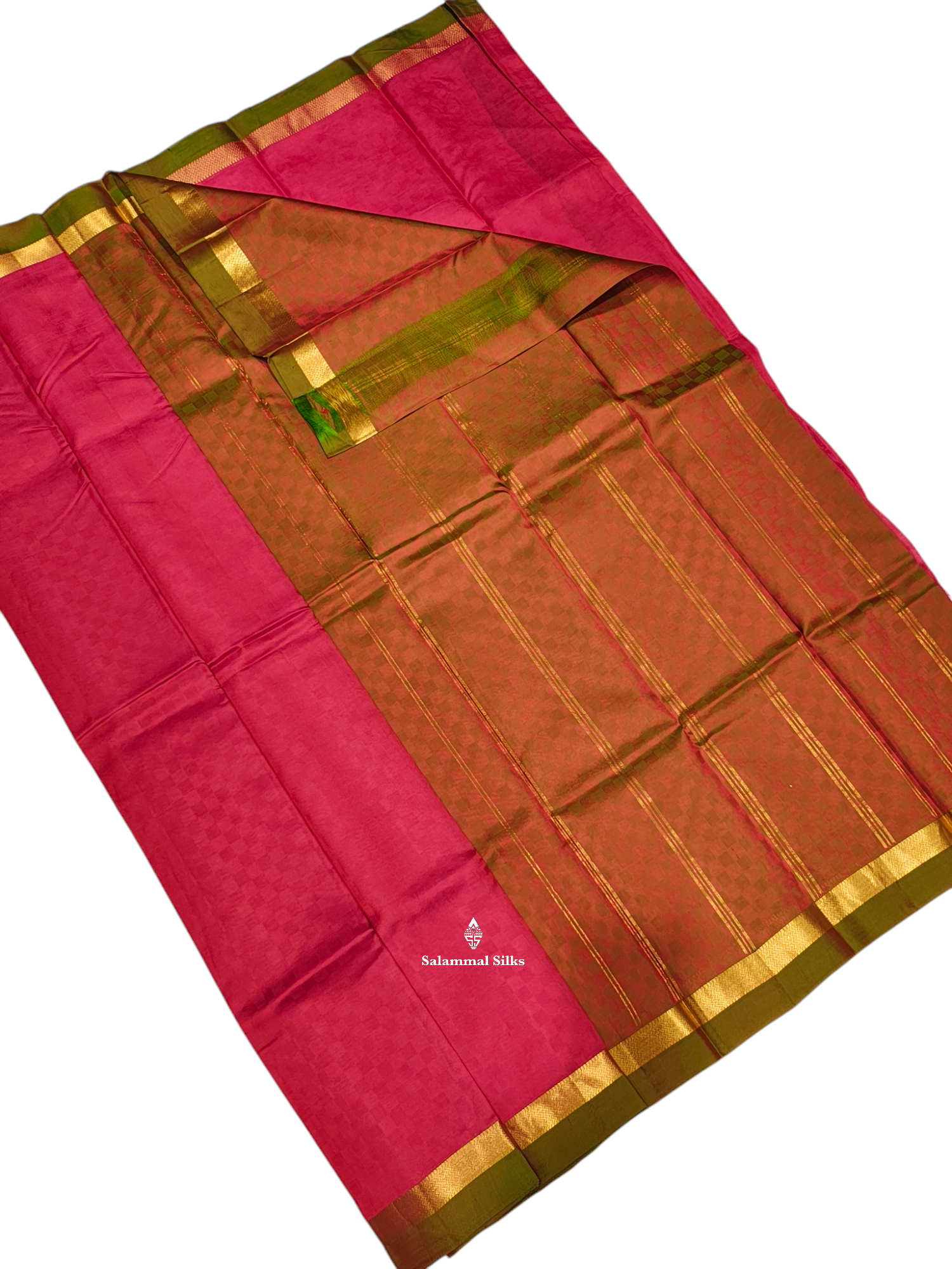 Salammal is known for its handloom sarees. In some sarees, there is cross-weaving between the body and the pallu, which is a sign of pure handloom sarees. This can be seen in Kanchipuram embossed sarees.