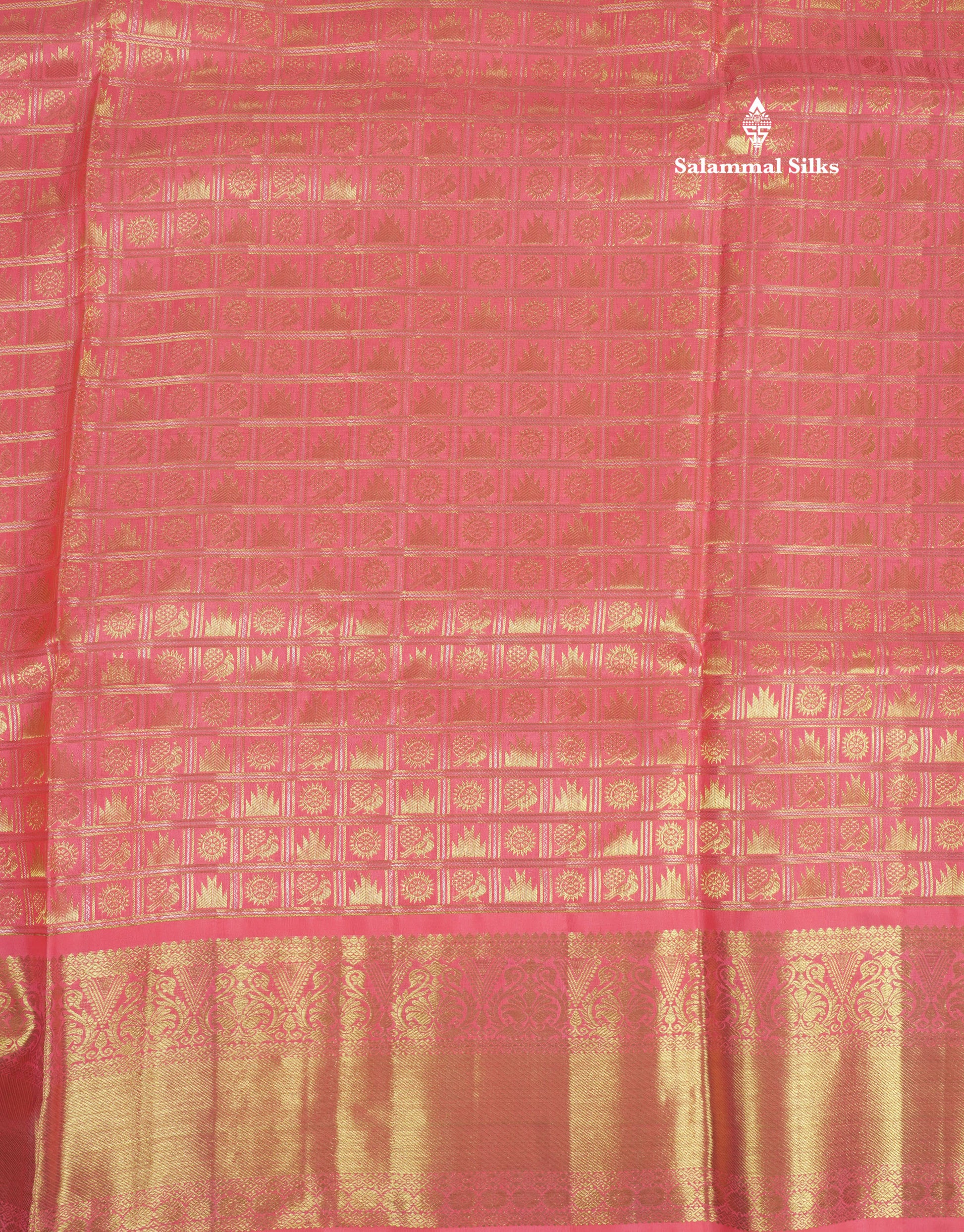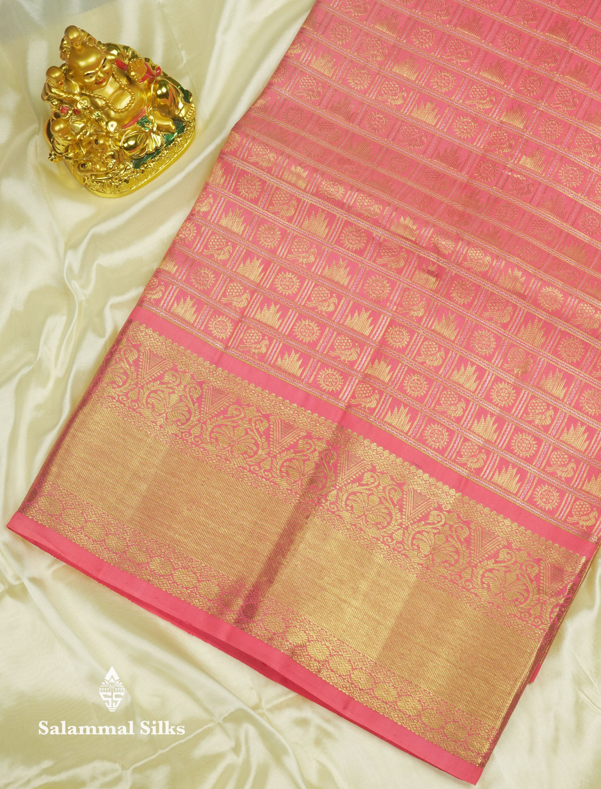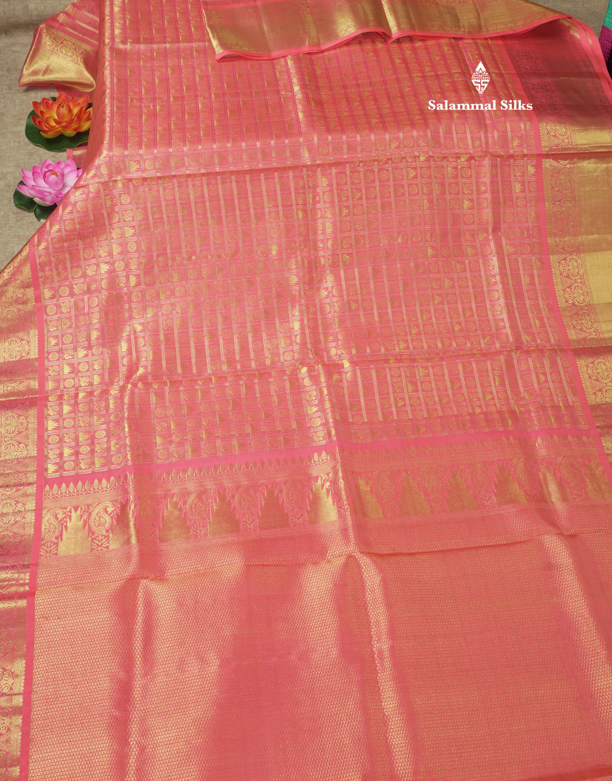 Pinkish Peach Checks With Traditional Butta Bridal Pure Kanjivaram Silk Saree With Self Border