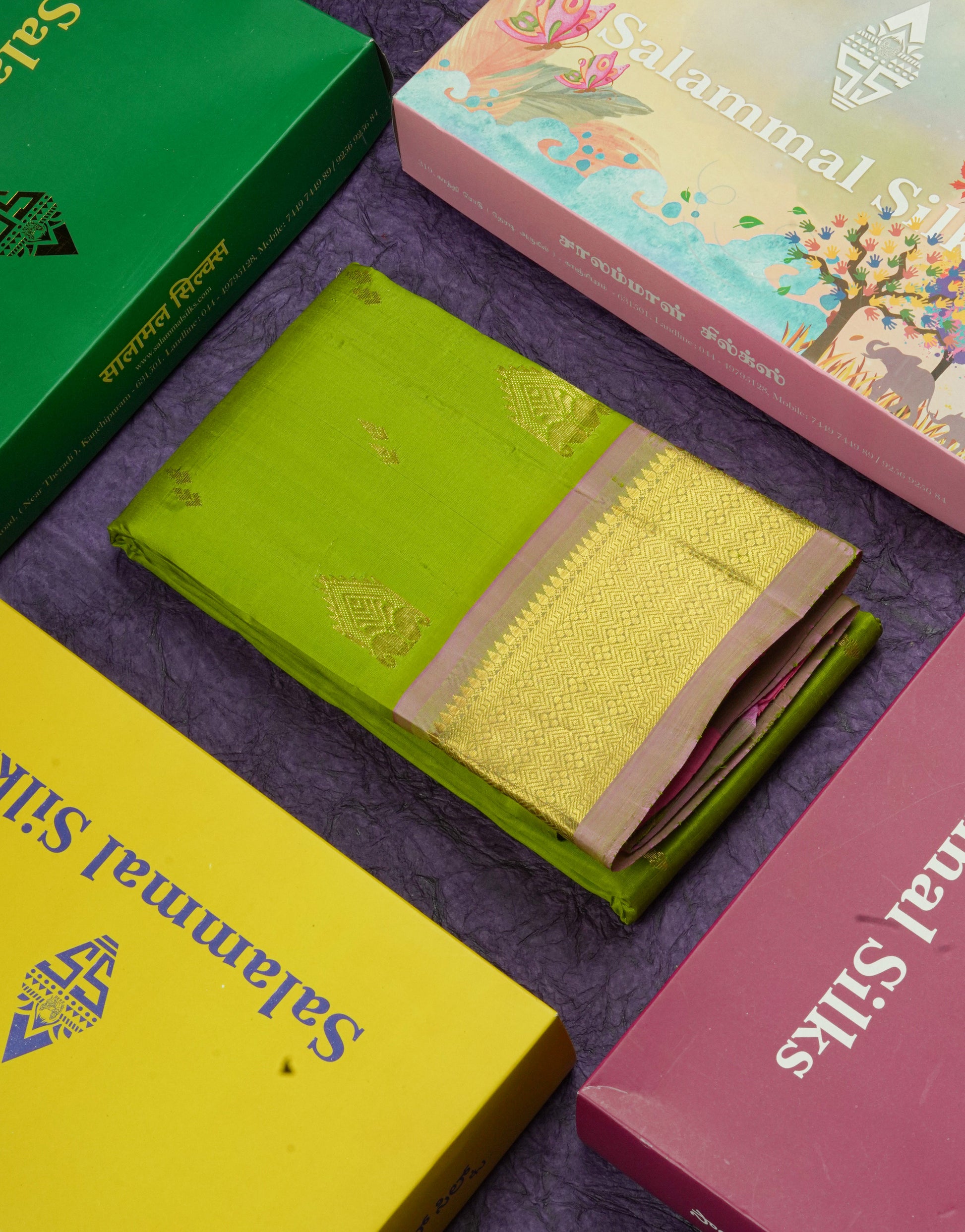 Salammal is known for its handloom sarees. In some sarees, there is cross-weaving between the body and the pallu, which is a sign of pure handloom sarees. This can be seen in Kanchipuram embossed sarees.