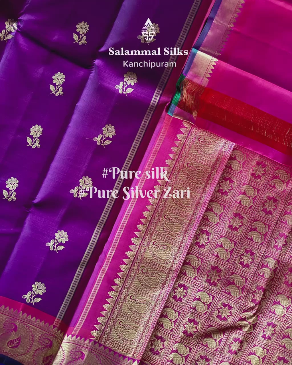 Salammal is known for its handloom sarees. In some sarees, there is cross-weaving between the body and the pallu, which is a sign of pure handloom sarees. This can be seen in Kanchipuram embossed sarees.