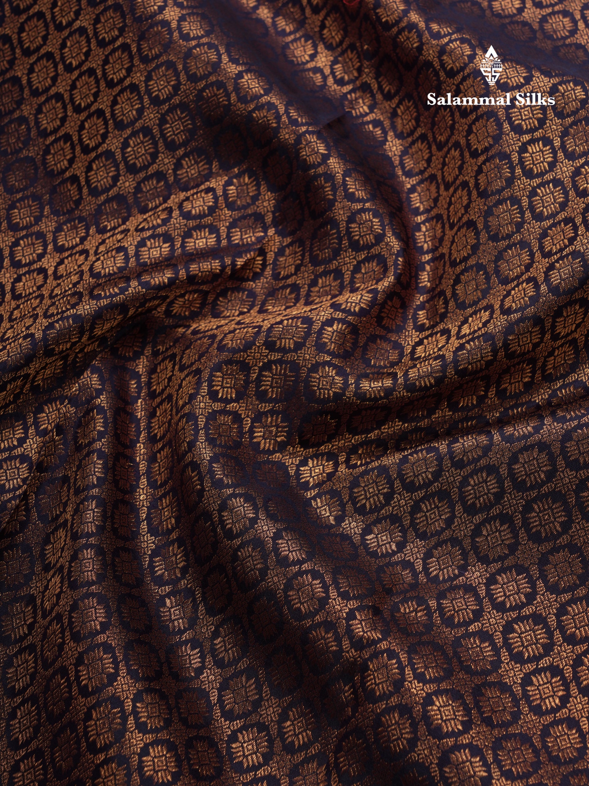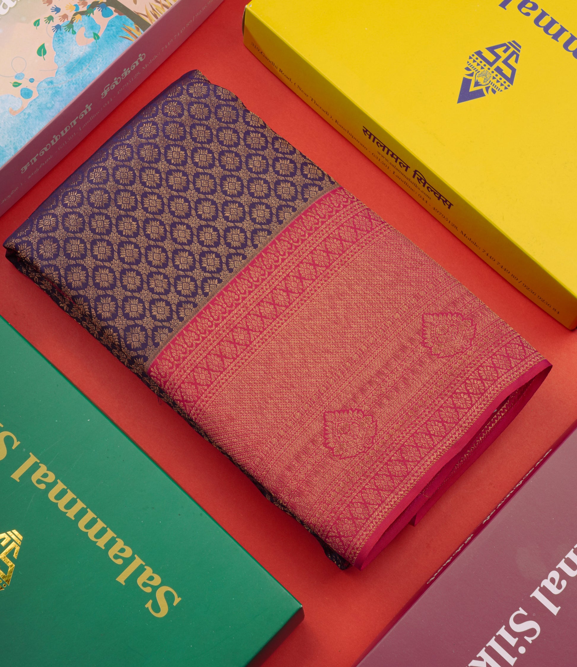 Salammal is known for its handloom sarees. In some sarees, there is cross-weaving between the body and the pallu, which is a sign of pure handloom sarees. This can be seen in Kanchipuram embossed sarees.