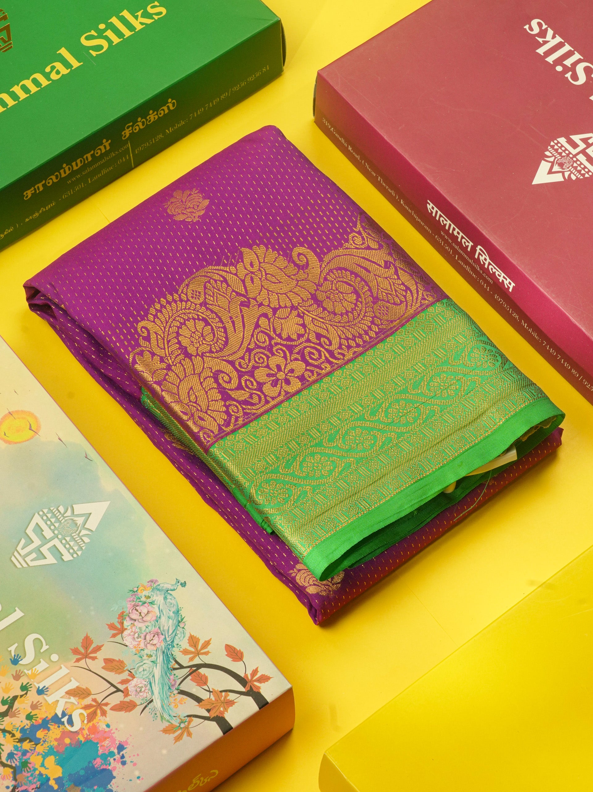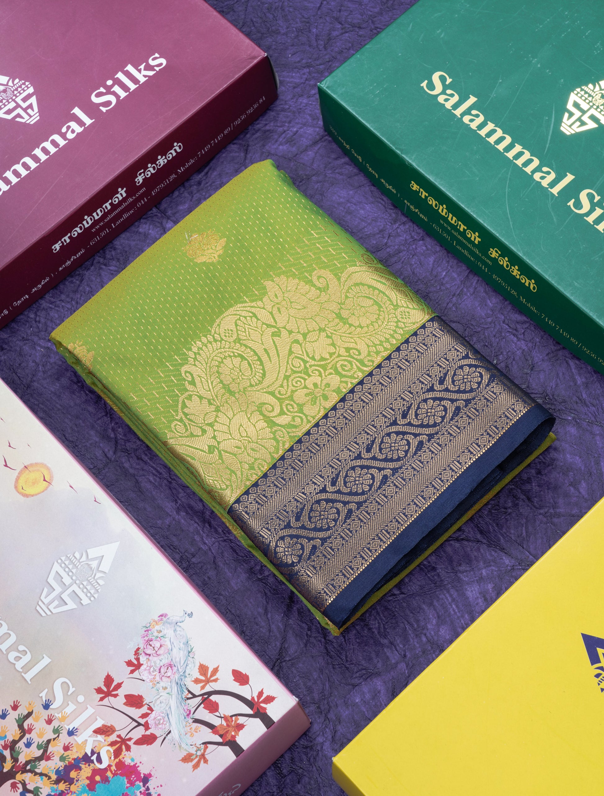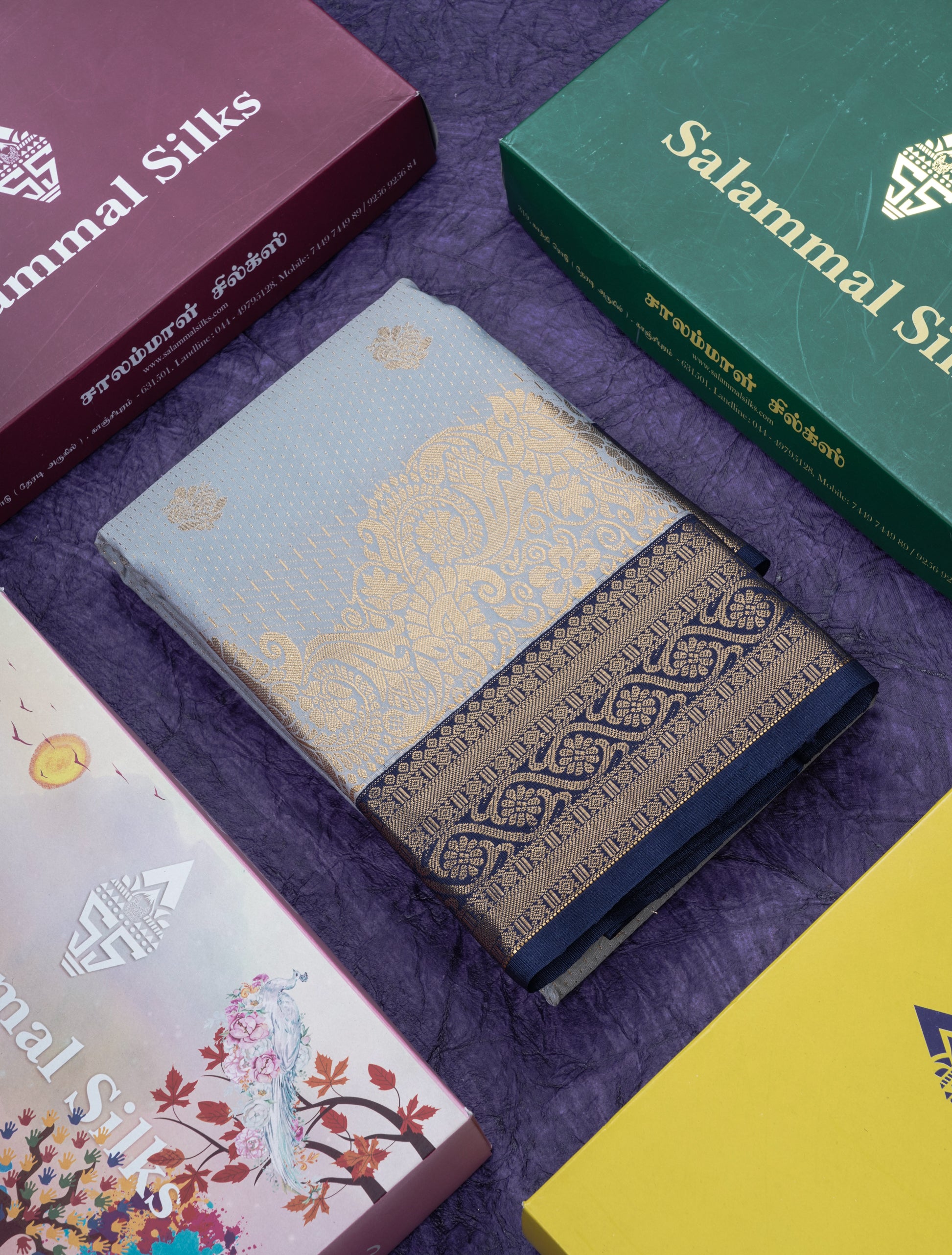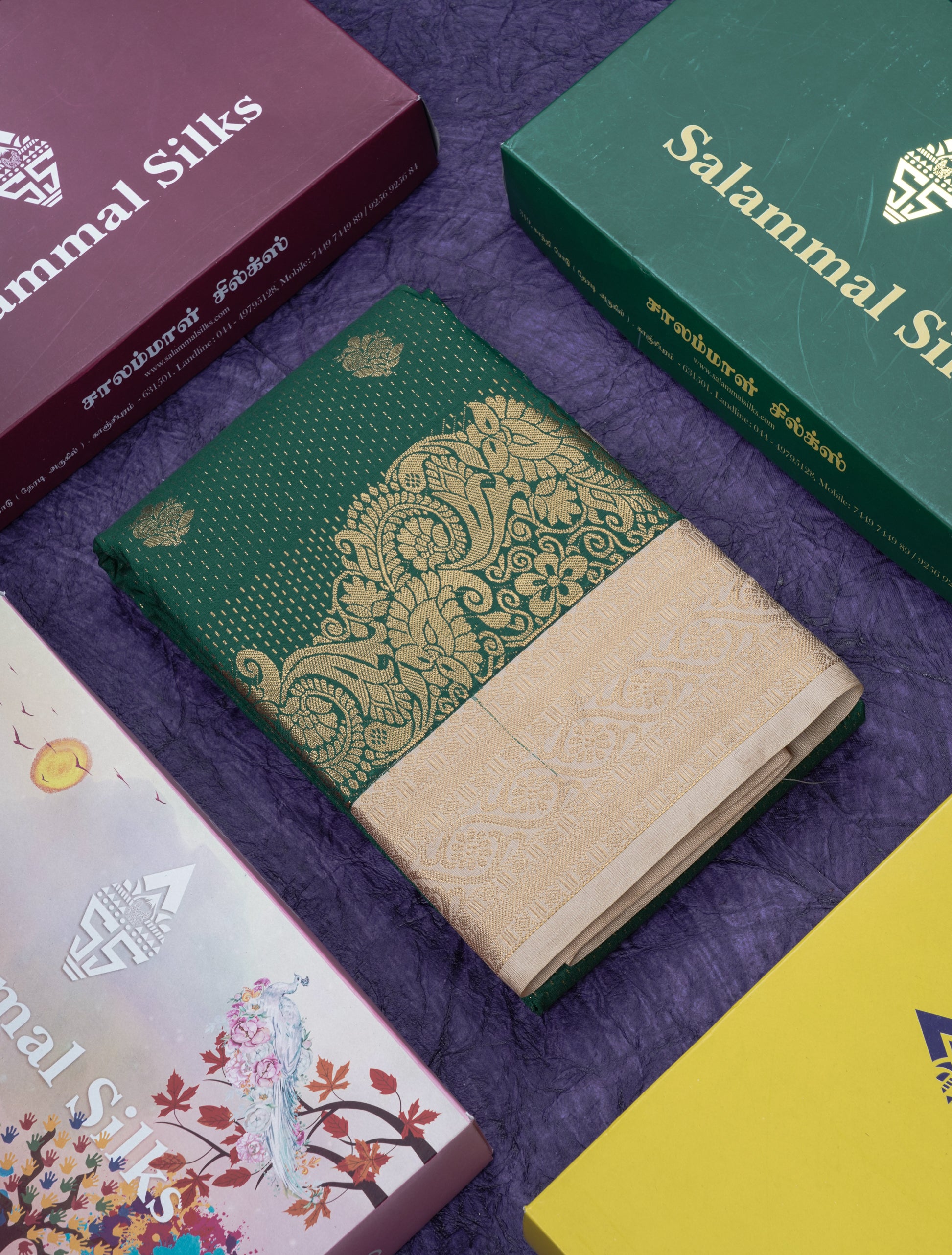 Salammal is known for its handloom sarees. In some sarees, there is cross-weaving between the body and the pallu, which is a sign of pure handloom sarees. This can be seen in Kanchipuram embossed sarees.