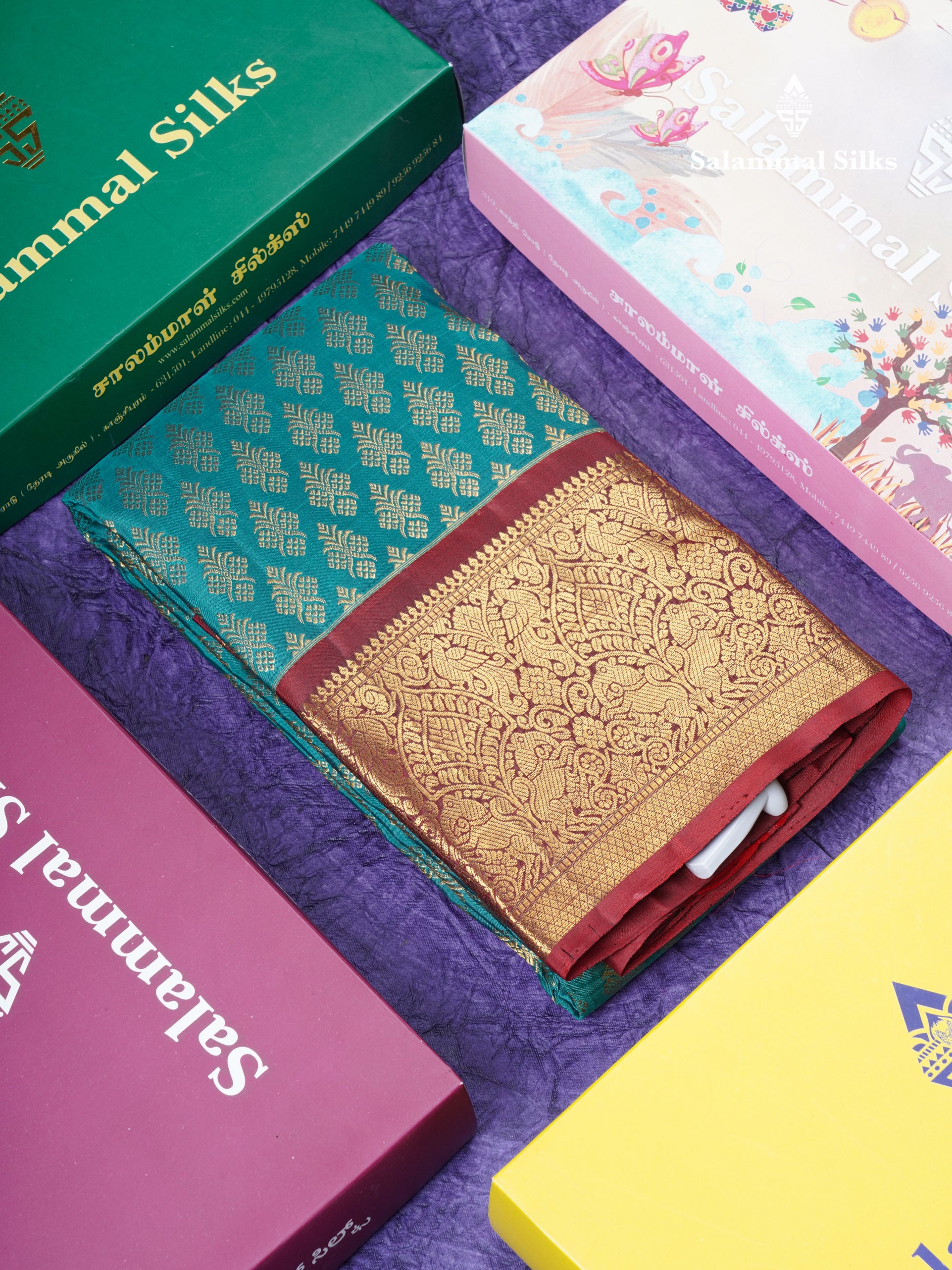 Salammal is known for its handloom sarees. In some sarees, there is cross-weaving between the body and the pallu, which is a sign of pure handloom sarees. This can be seen in Kanchipuram embossed sarees.