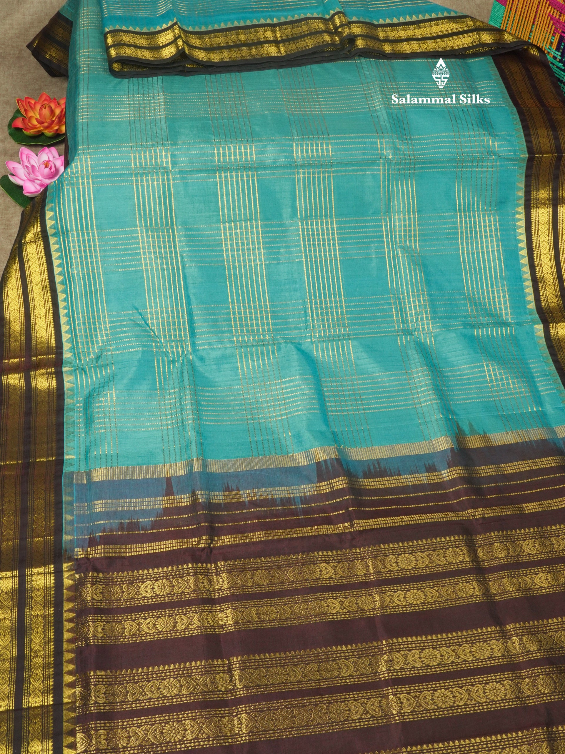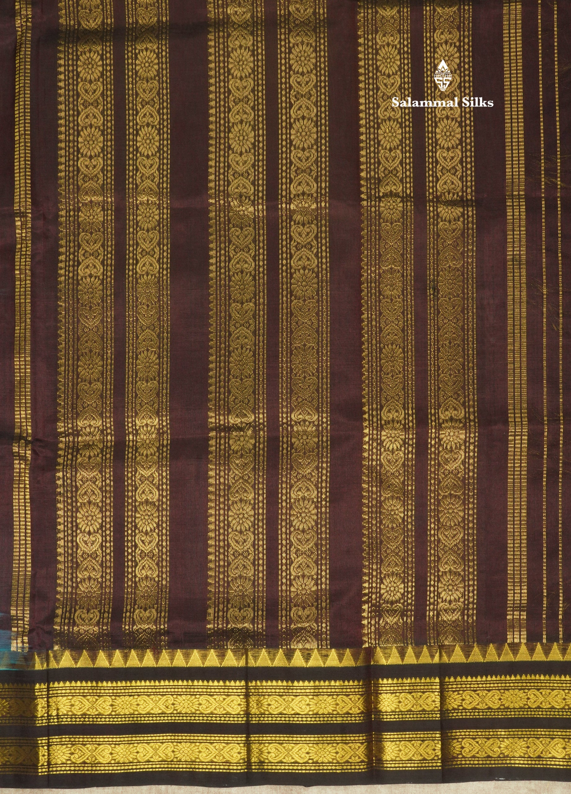 Salammal is known for its handloom sarees. In some sarees, there is cross-weaving between the body and the pallu, which is a sign of pure handloom sarees. This can be seen in Kanchipuram embossed sarees.