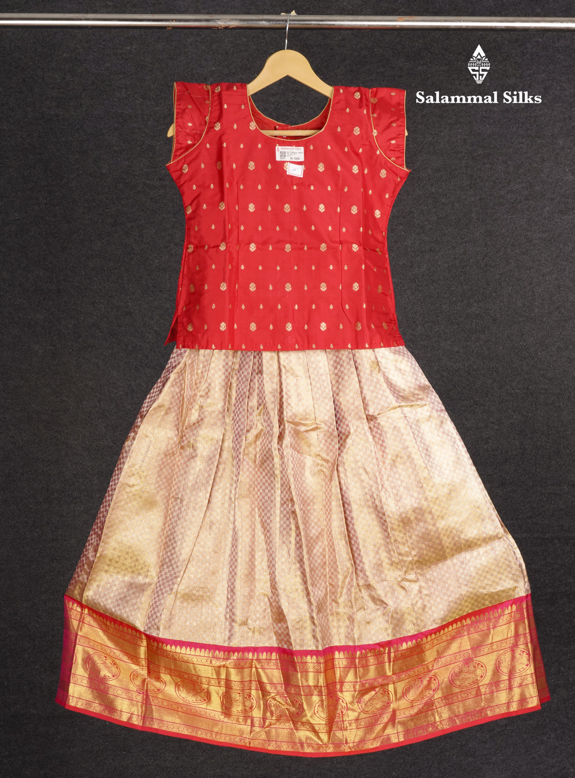 Readymade Pure Silk Pattu Pavadai - Chilly Red With Sandal Tissue (Age 10-11 yrs)