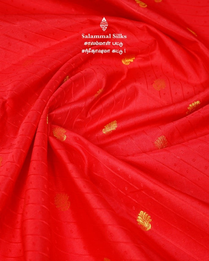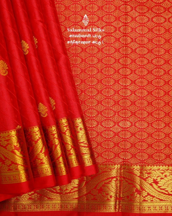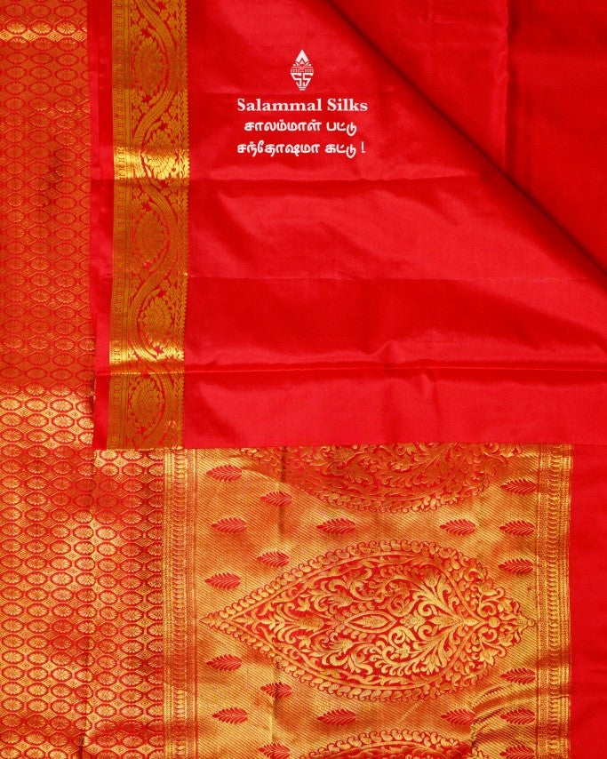 Salammal is known for its handloom sarees. In some sarees, there is cross-weaving between the body and the pallu, which is a sign of pure handloom sarees. This can be seen in Kanchipuram embossed sarees.