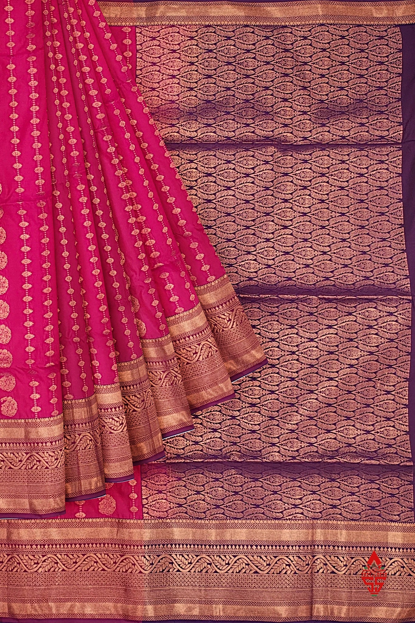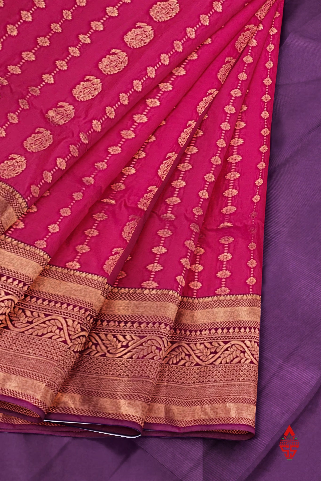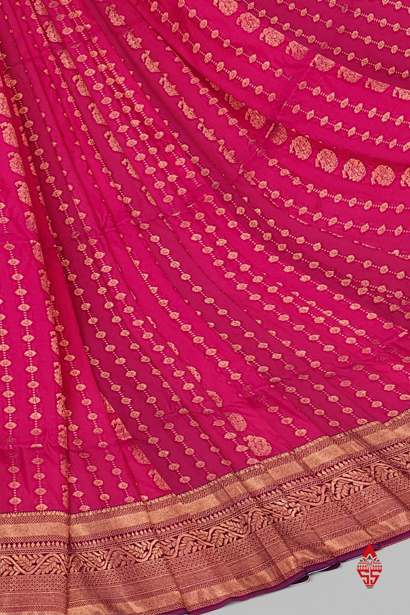 Salammal is known for its handloom sarees. In some sarees, there is cross-weaving between the body and the pallu, which is a sign of pure handloom sarees. This can be seen in Kanchipuram embossed sarees.