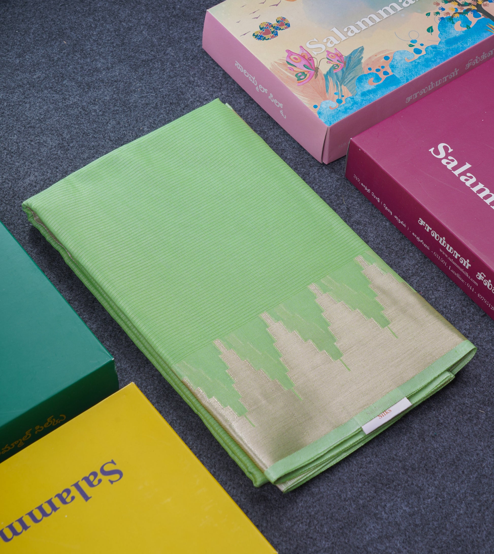 Salammal is known for its handloom sarees. In some sarees, there is cross-weaving between the body and the pallu, which is a sign of pure handloom sarees. This can be seen in Kanchipuram embossed sarees.