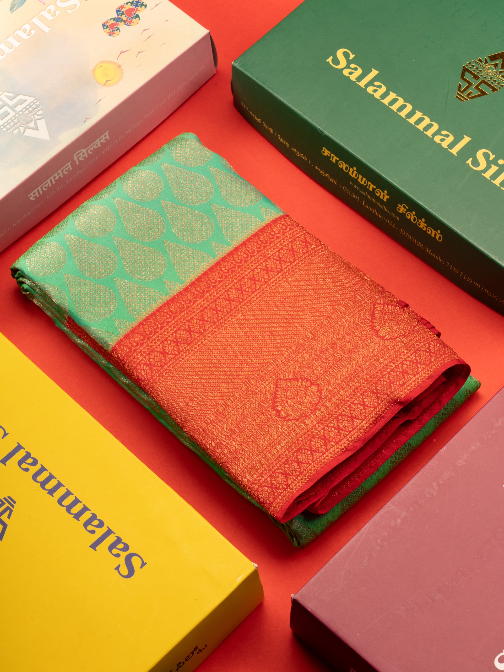 Salammal is known for its handloom sarees. In some sarees, there is cross-weaving between the body and the pallu, which is a sign of pure handloom sarees. This can be seen in Kanchipuram embossed sarees.