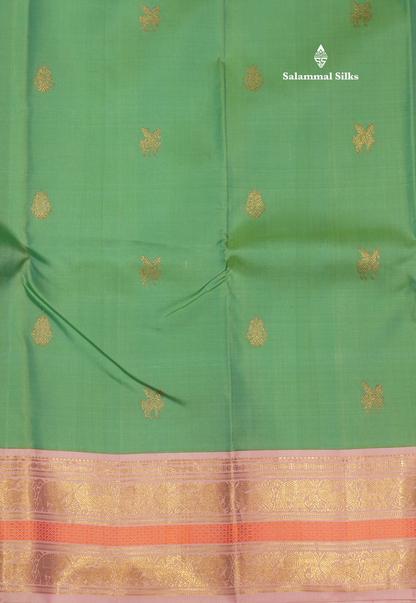 Korvai Rexona Green Colour Pure Kanjivaram Silk Saree With Contrast Baby Pink Border