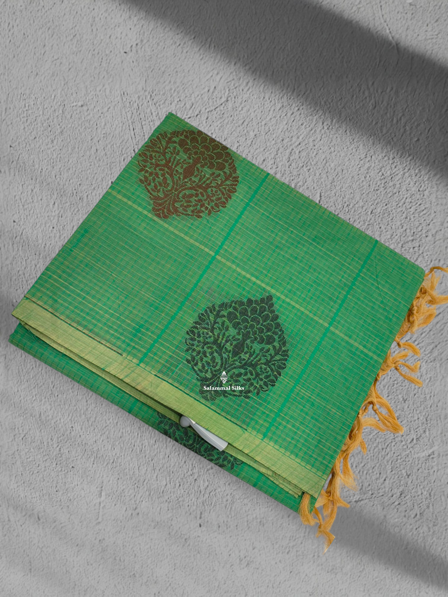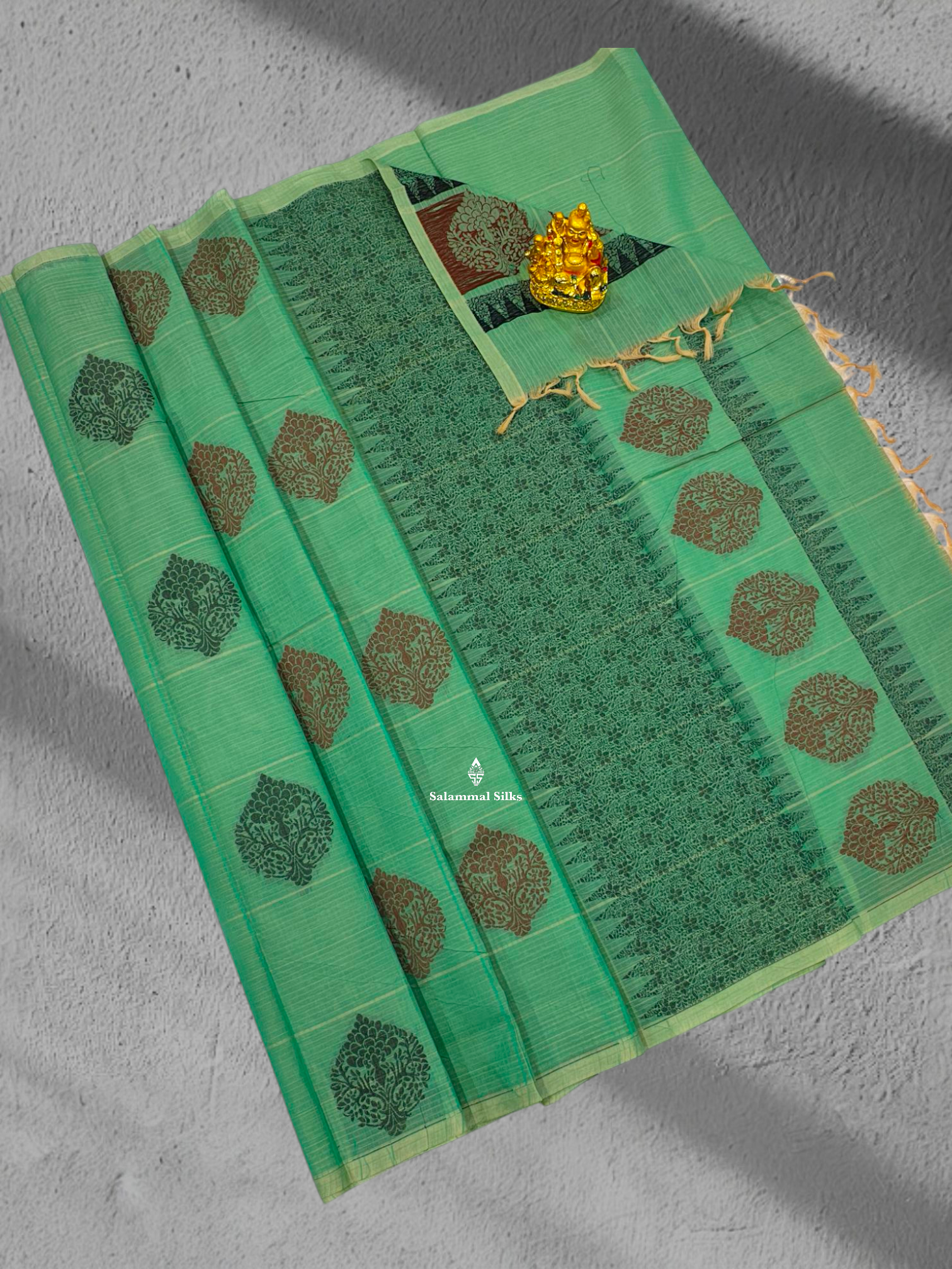 Salammal is known for its handloom sarees. In some sarees, there is cross-weaving between the body and the pallu, which is a sign of pure handloom sarees. This can be seen in Kanchipuram embossed sarees.