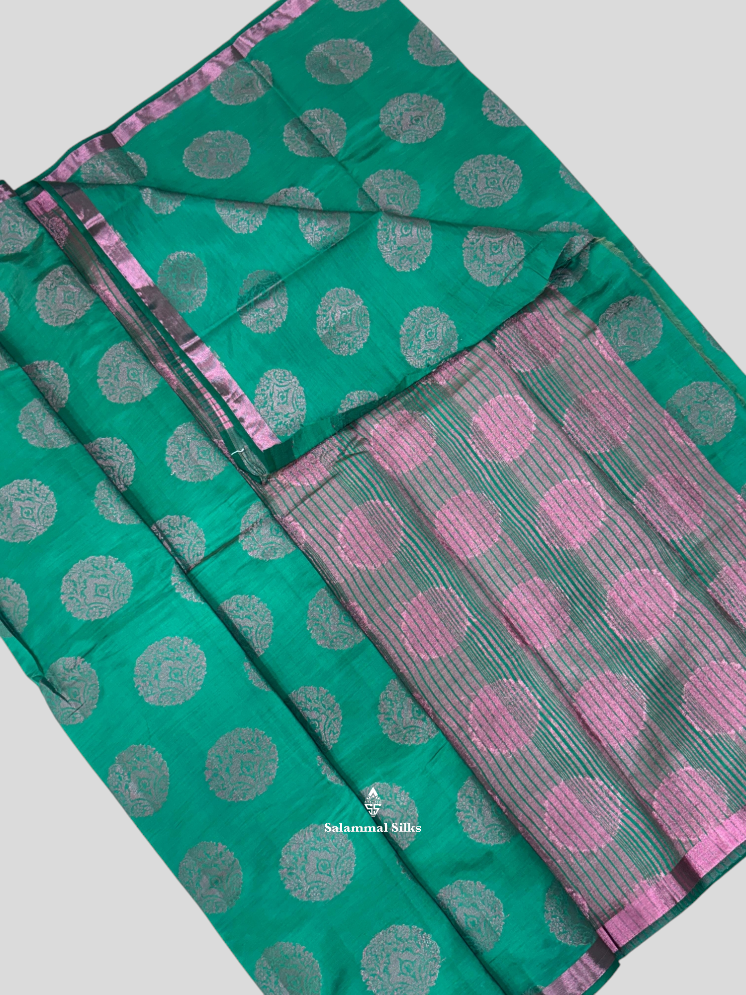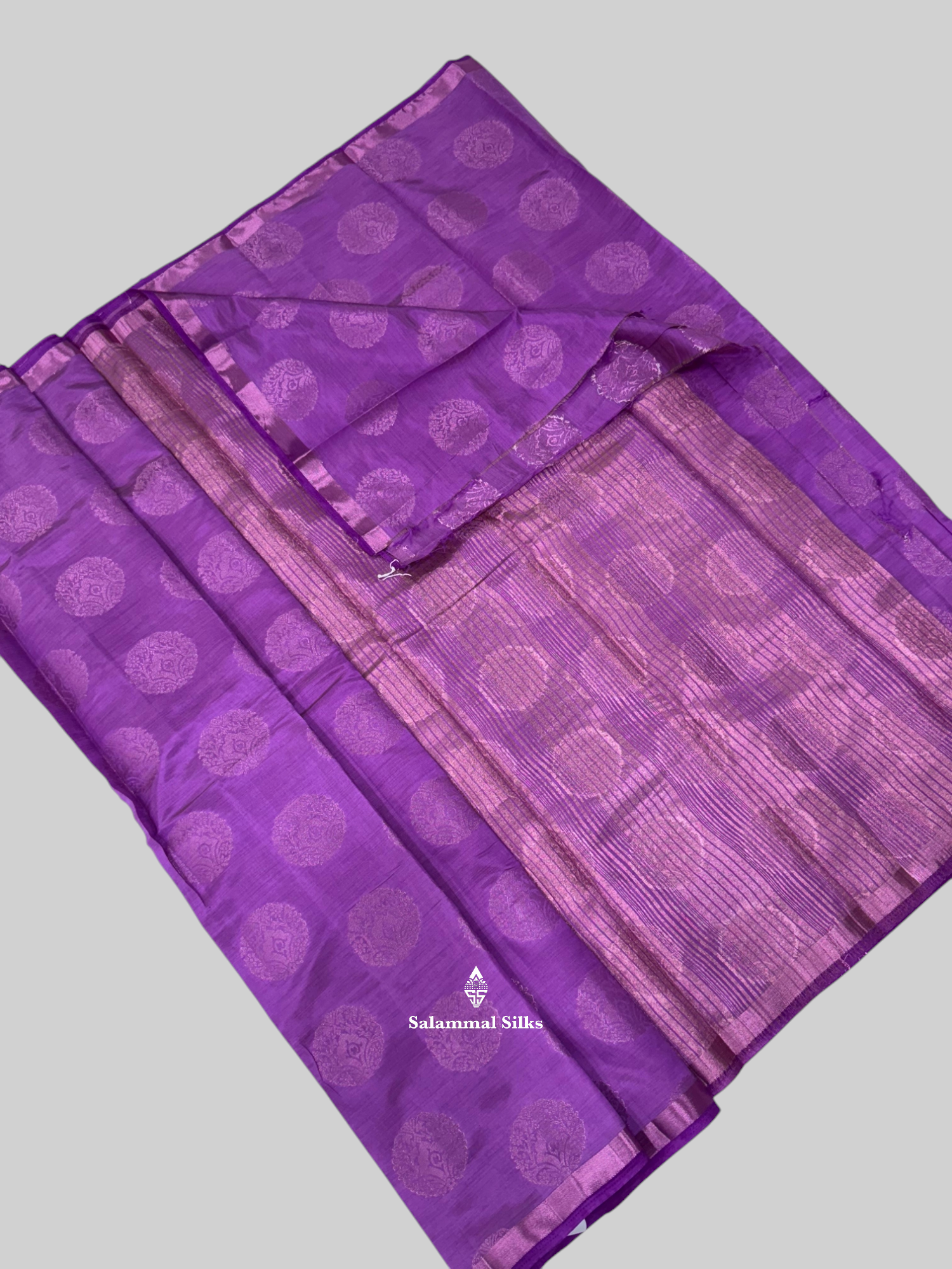 Salammal is known for its handloom sarees. In some sarees, there is cross-weaving between the body and the pallu, which is a sign of pure handloom sarees. This can be seen in Kanchipuram embossed sarees.