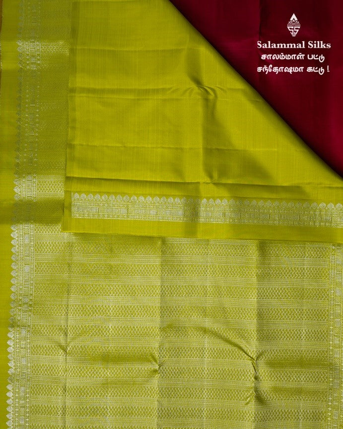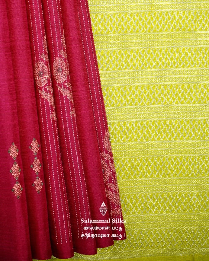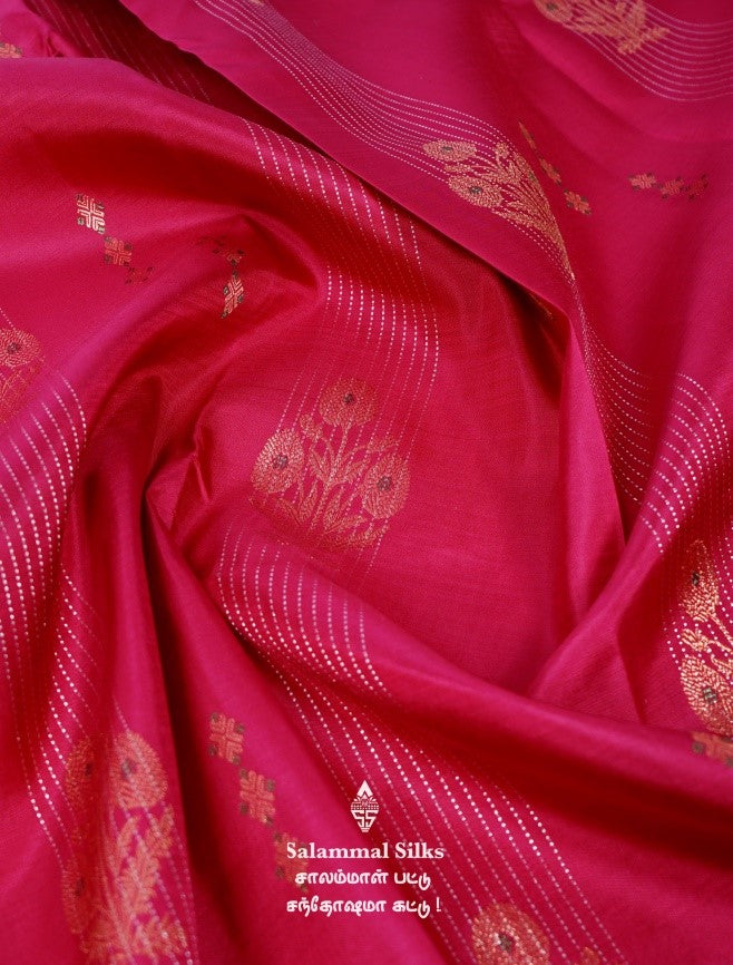 Salammal is known for its handloom sarees. In some sarees, there is cross-weaving between the body and the pallu, which is a sign of pure handloom sarees. This can be seen in Kanchipuram embossed sarees.