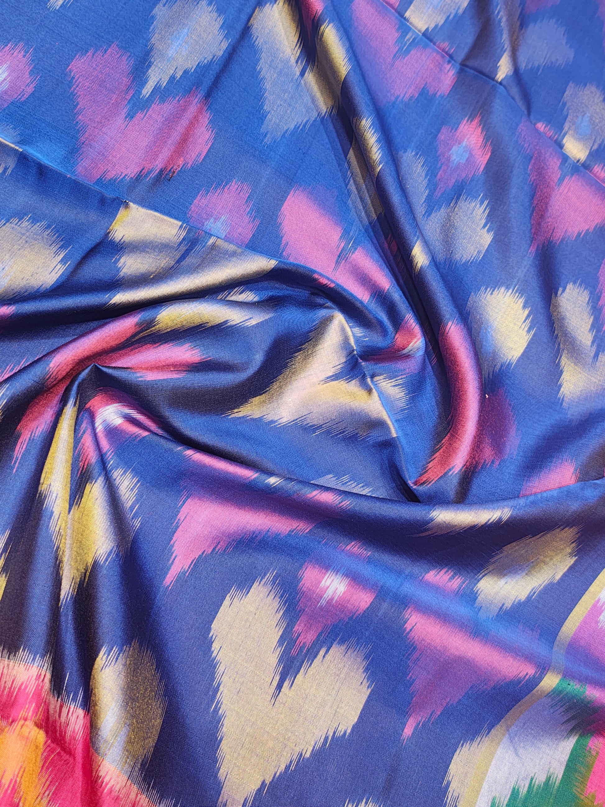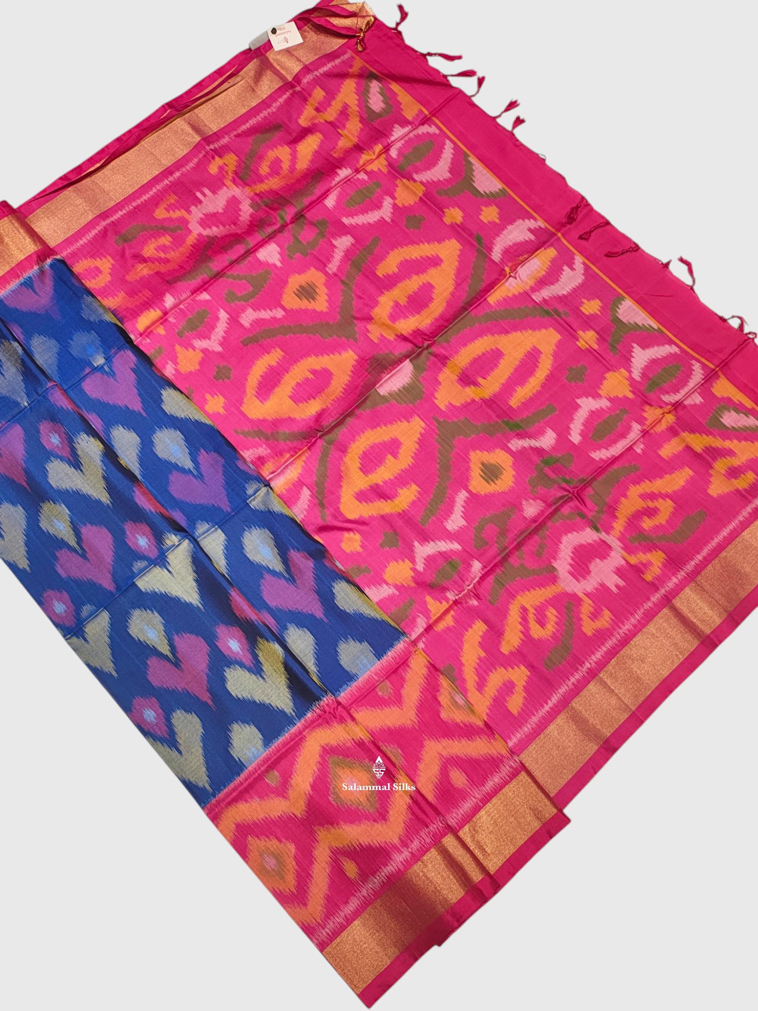 Royal Blue Beautiful Ikkat Fancy Pure Soft Silk Saree With Pink Border
