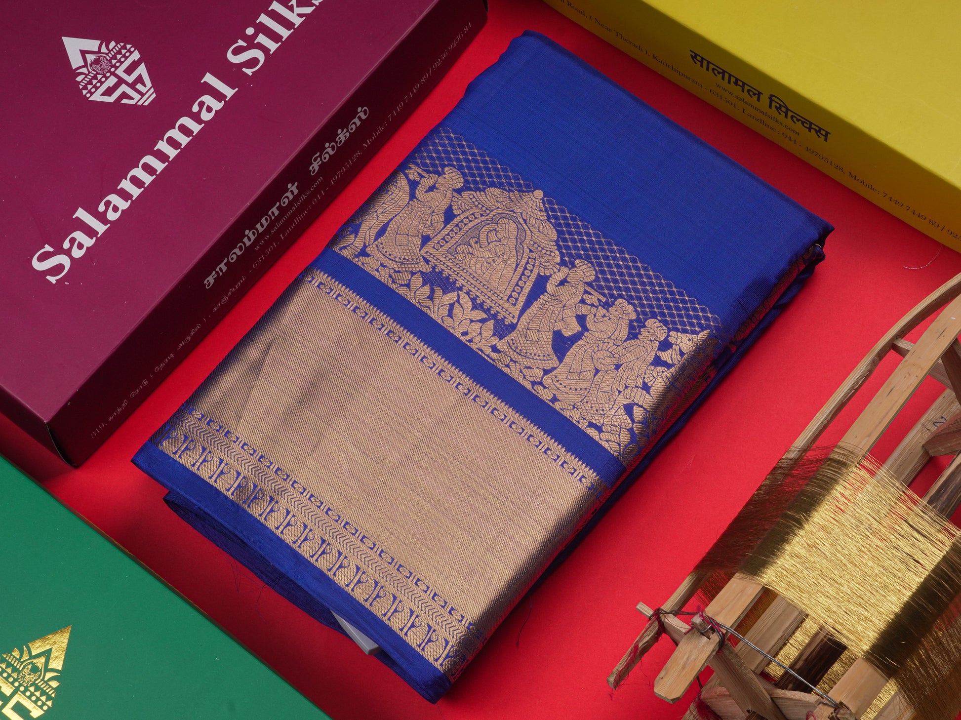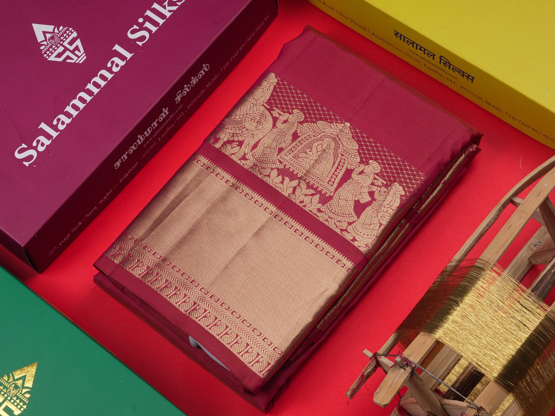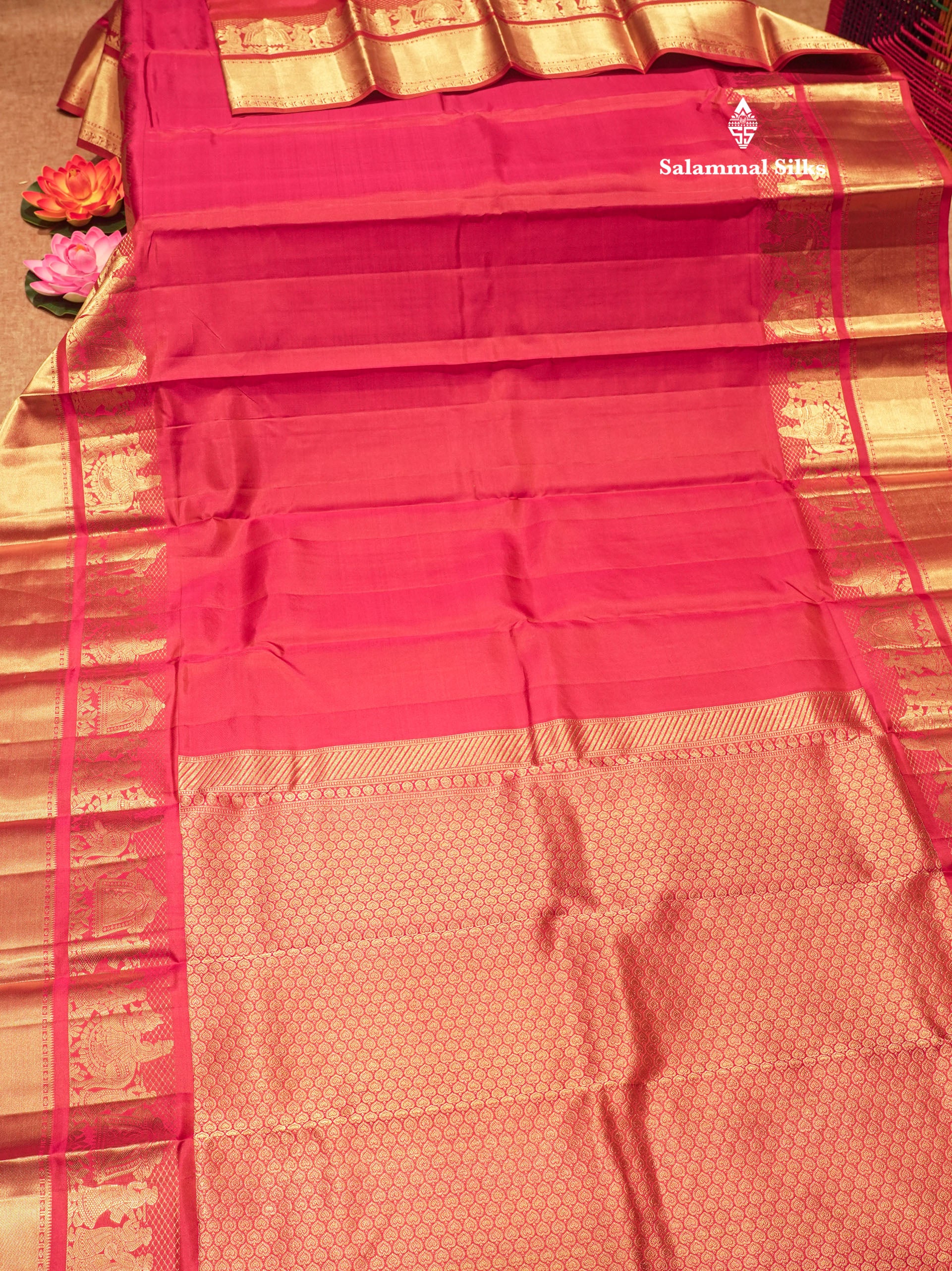 Salammal is known for its handloom sarees. In some sarees, there is cross-weaving between the body and the pallu, which is a sign of pure handloom sarees. This can be seen in Kanchipuram embossed sarees.