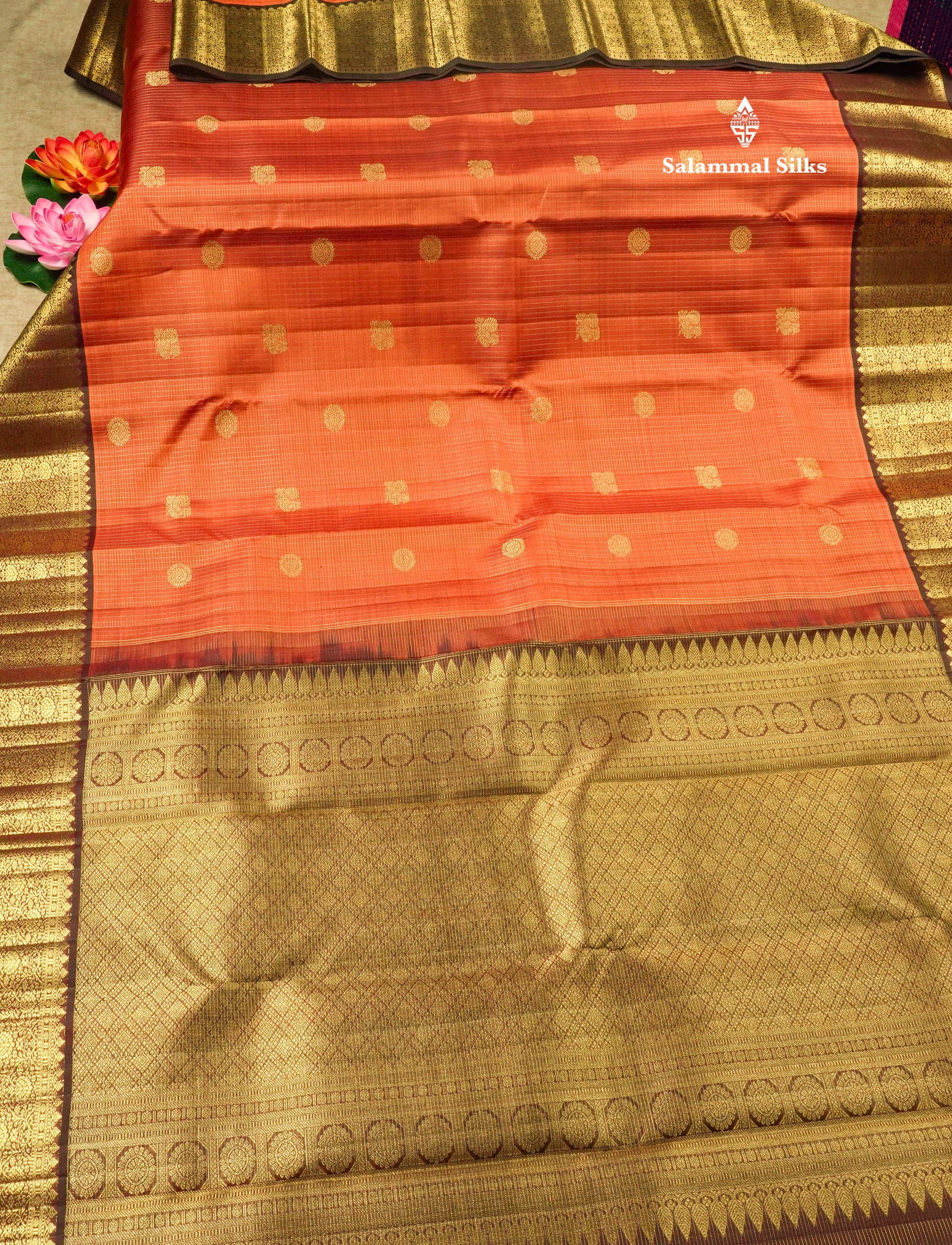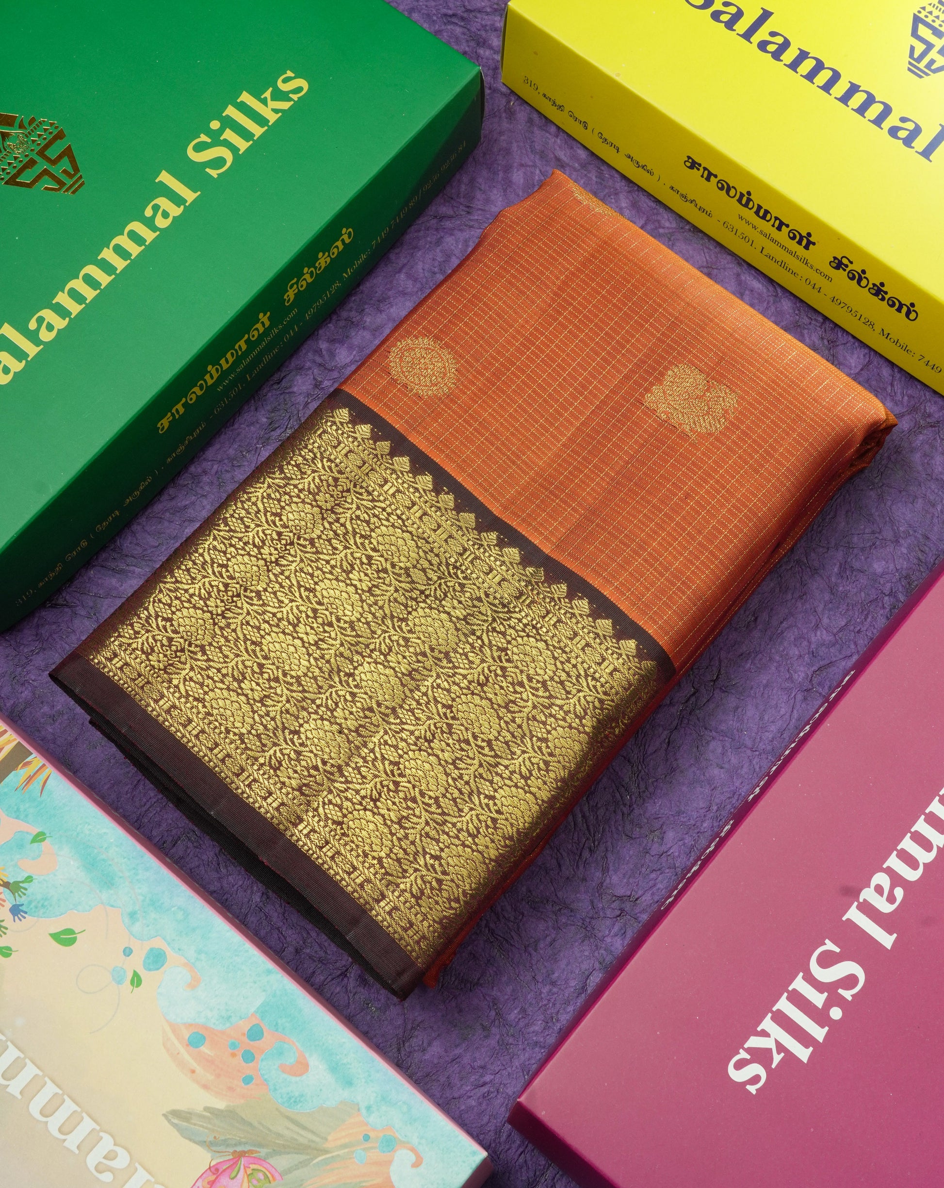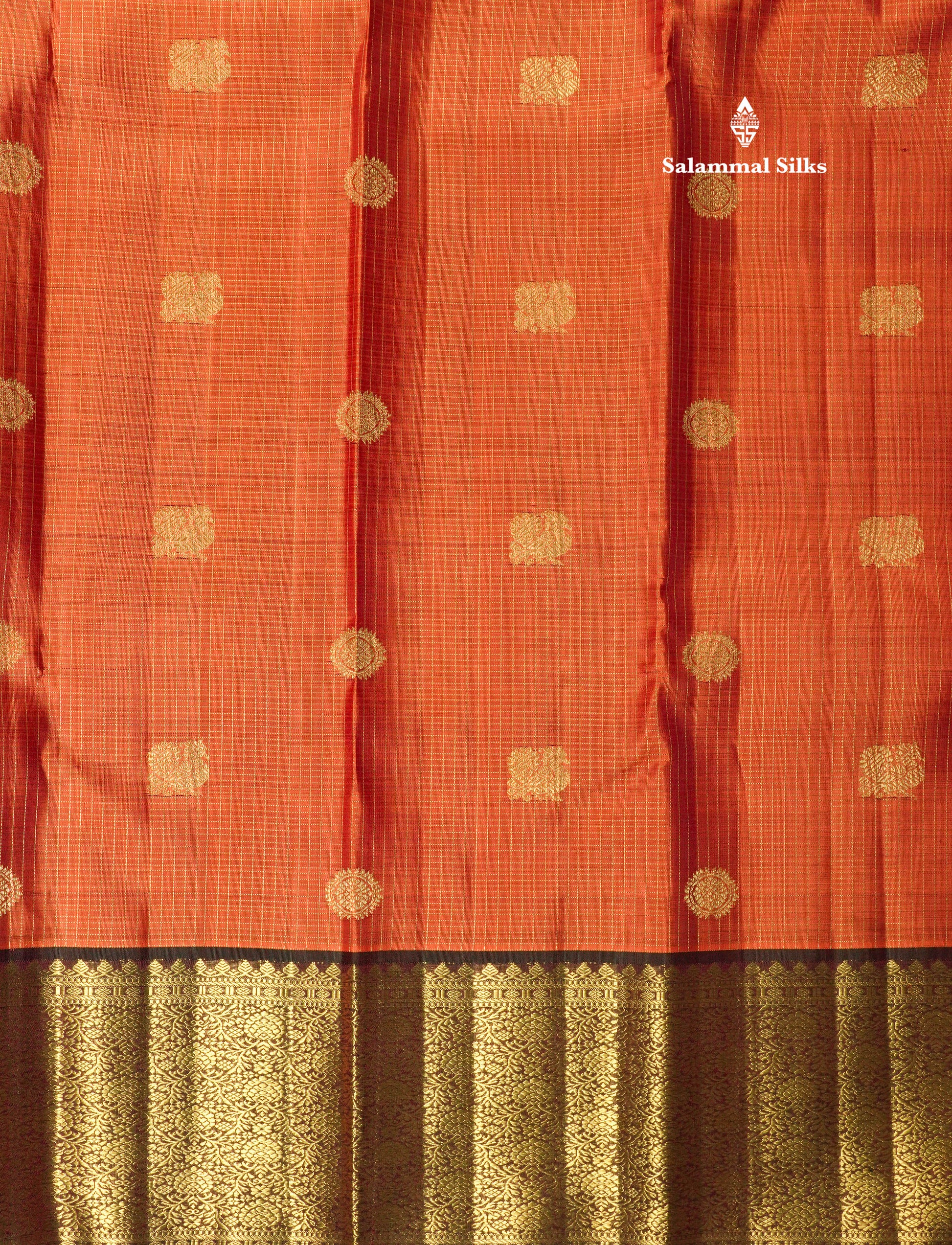 Rust Orange Tiny Zari Checks Pure Kanjivaram Silk Saree 2G Zari with Contrast Brown Border